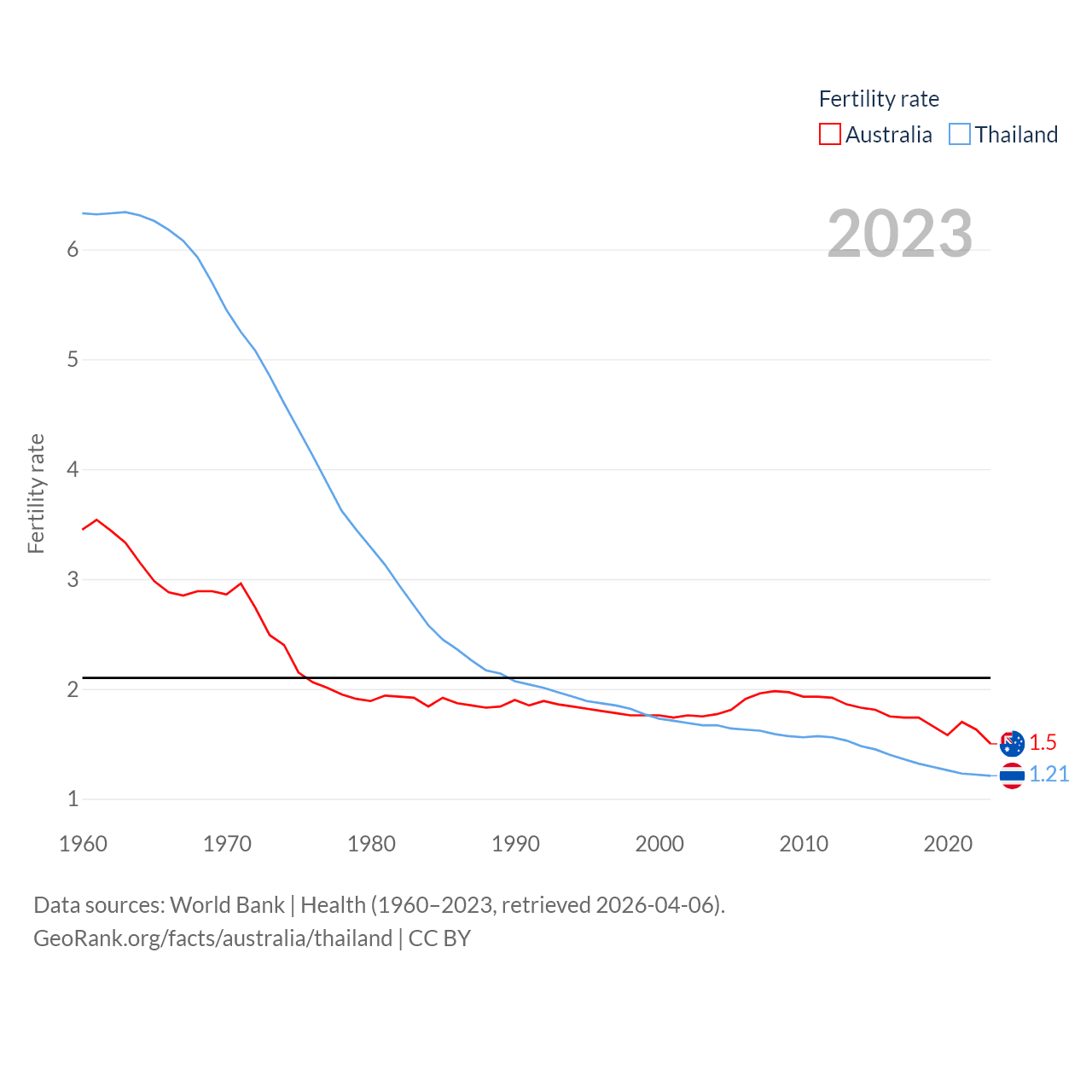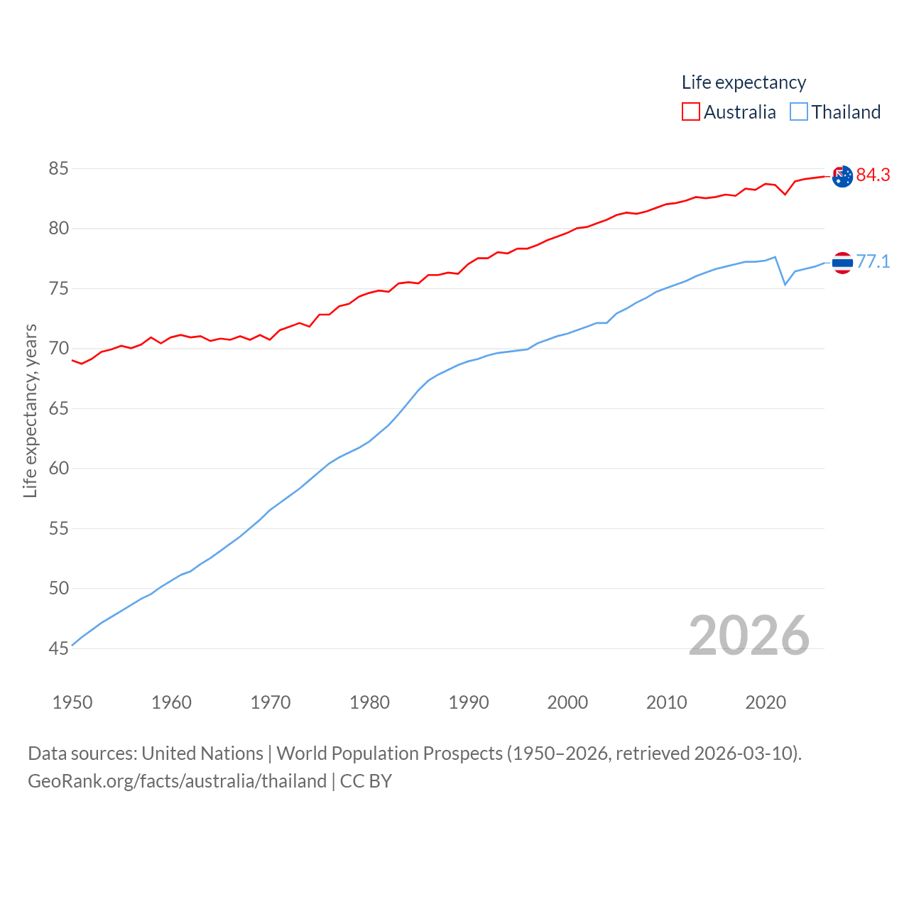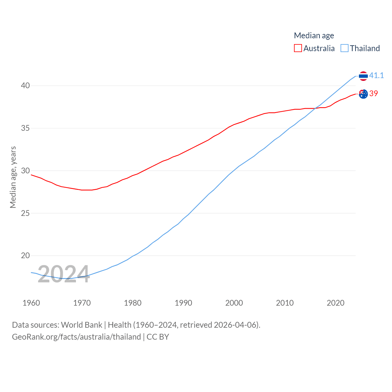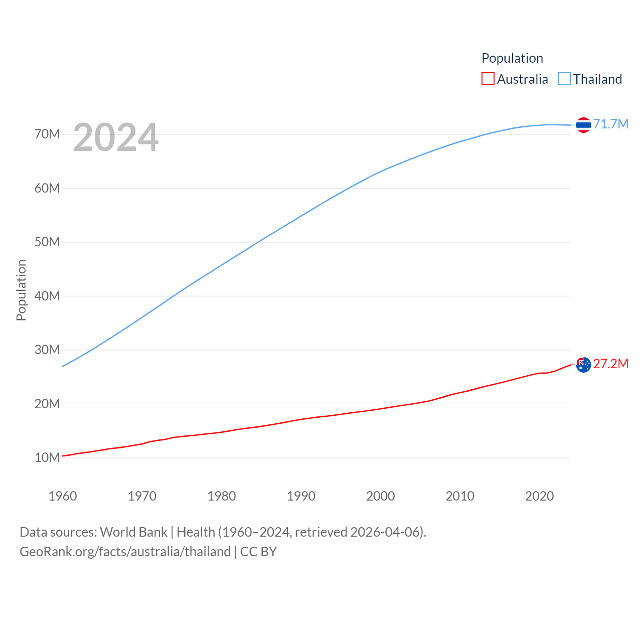 Australia has a population of 27.2M (ranked 54/197), compared with 71.7M in Thailand (ranked 20/197). Australia's land area is 2,969,906 sq mi versus 197,256 sq mi for Thailand (ranked 6th vs. 50th).