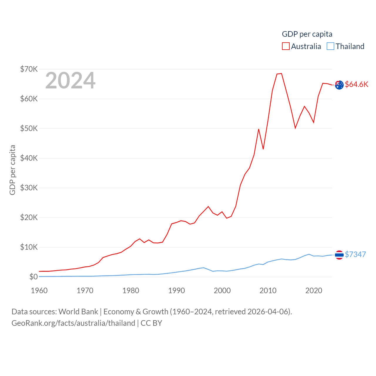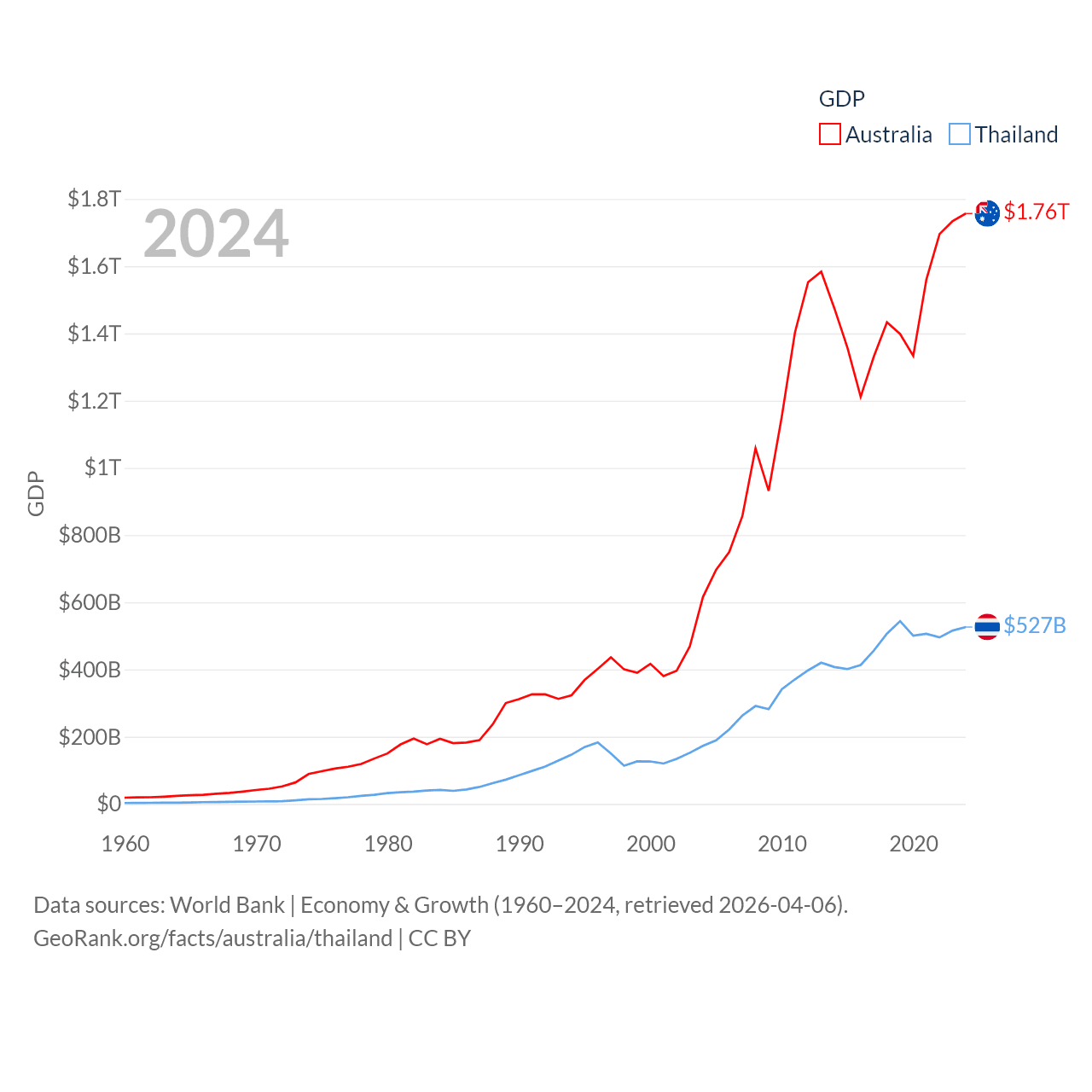 By GDP, Australia ranks 14/197 ($1.76T) and Thailand ranks 31/197 ($527B). By GDP per capita, Australia ranks 14/197 ($64,604), while Thailand ranks 100/197 ($7,347).