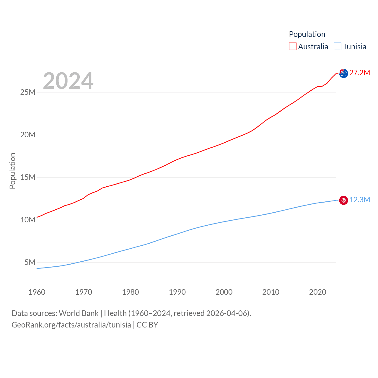 Australia has a population of 27.2M (ranked 54/197), compared with 12.3M in Tunisia (ranked 80/197). Australia's land area is 2,969,906 sq mi versus 59,985 sq mi for Tunisia (ranked 6th vs. 91st).