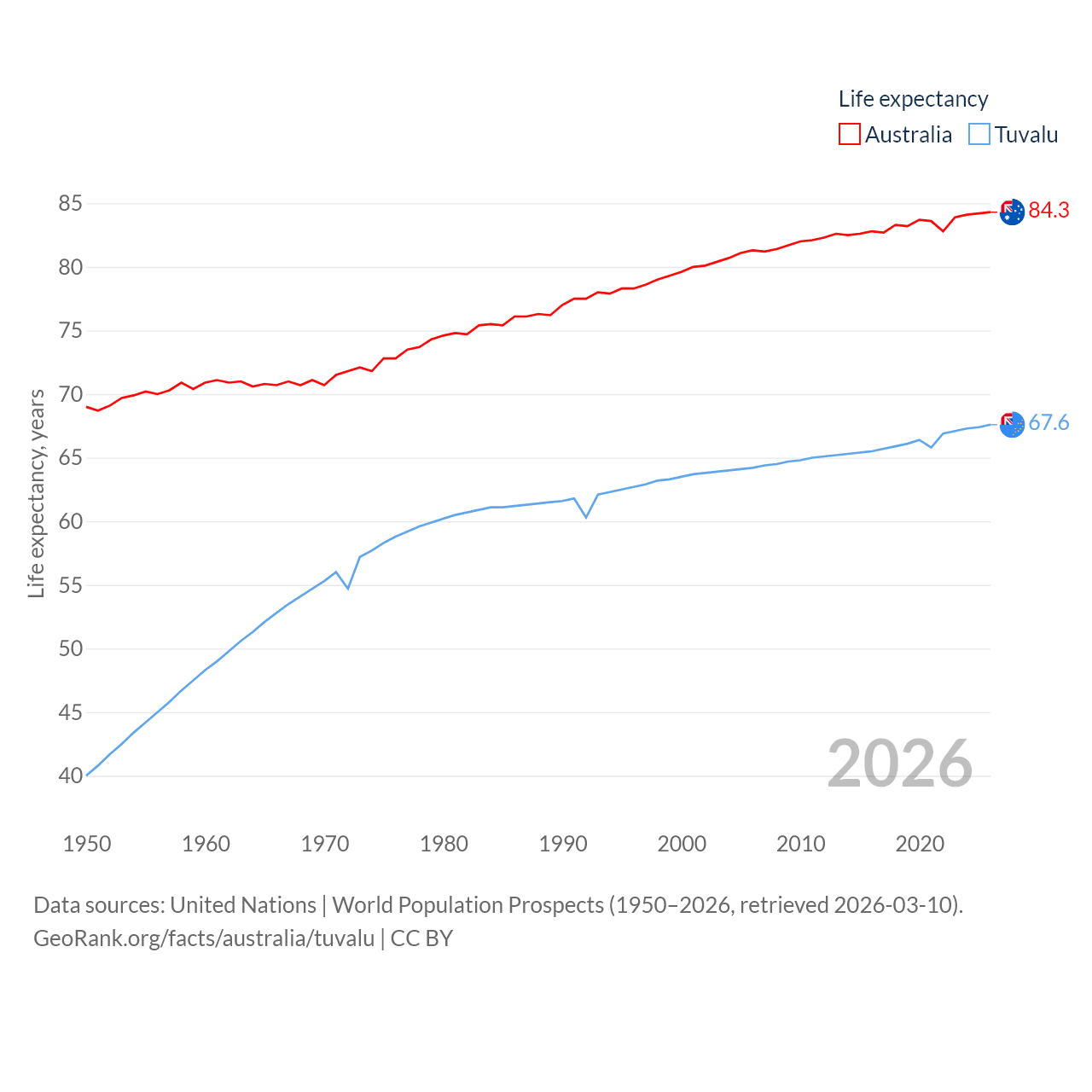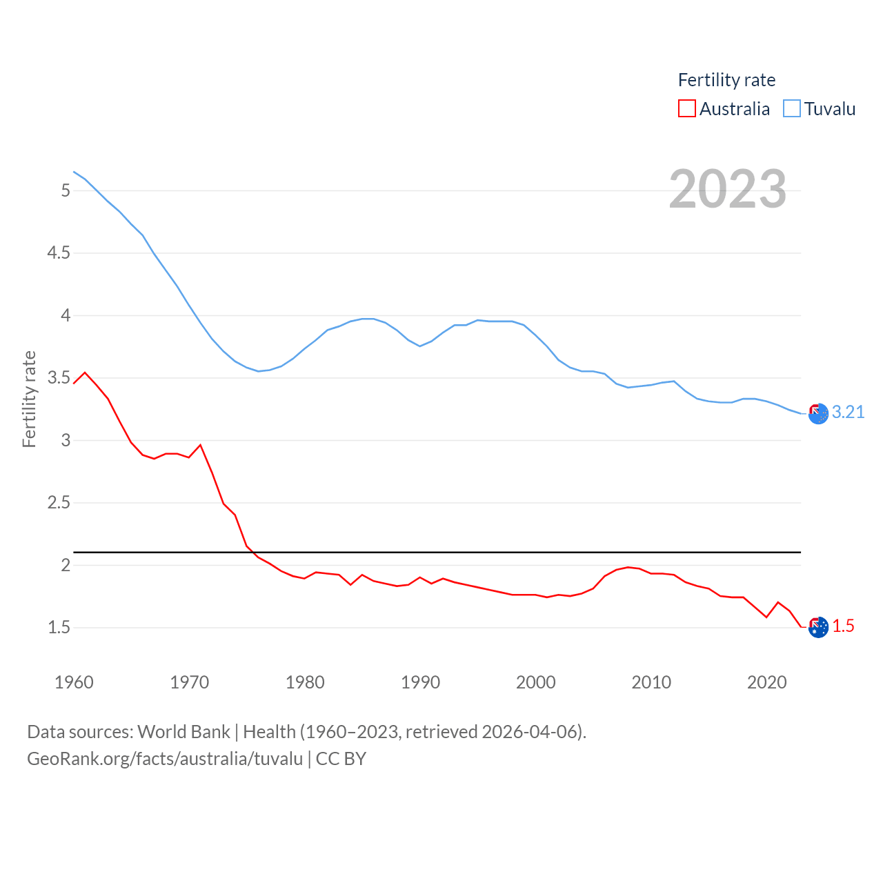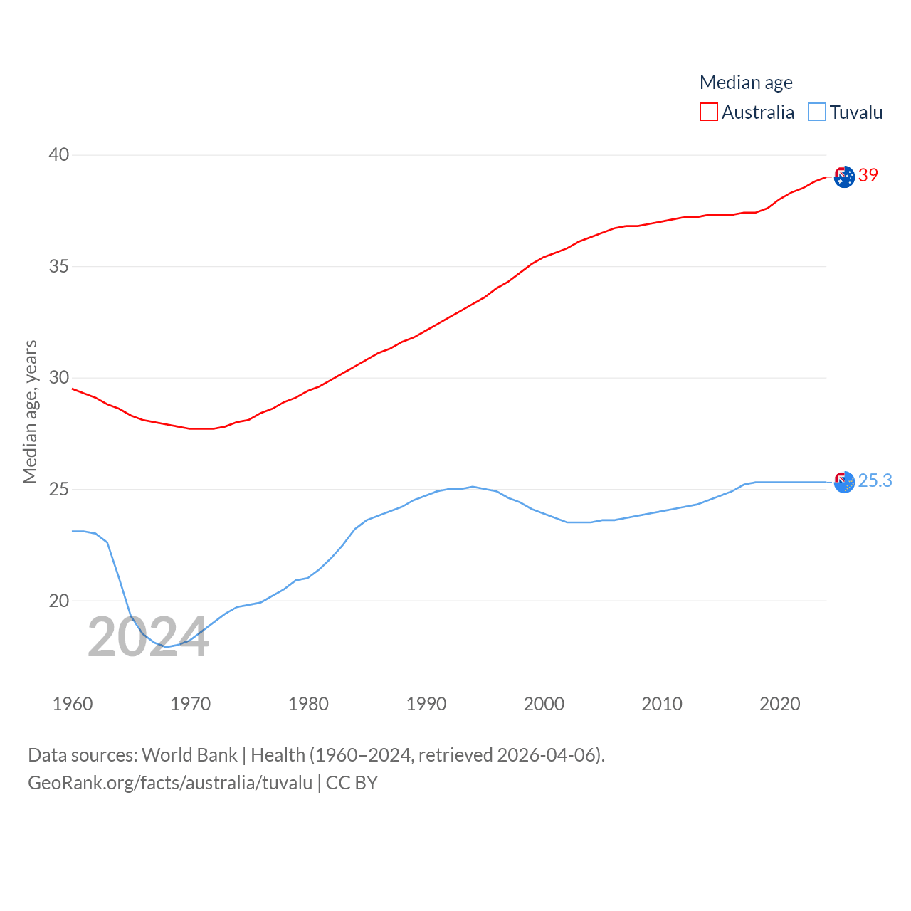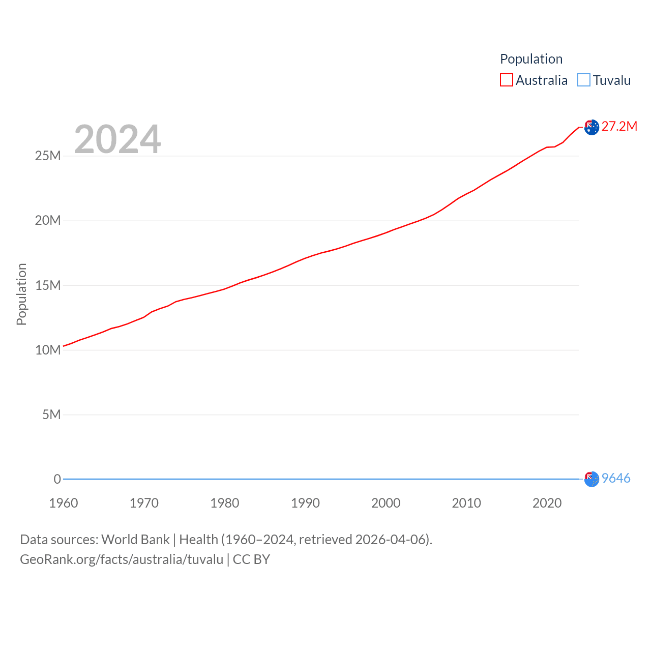 Australia has a population of 27.2M (ranked 54/197), compared with 9.65K in Tuvalu (ranked 196/197). Australia's land area is 2,969,906 sq mi versus 11.6 sq mi for Tuvalu (ranked 6th vs. 194th).