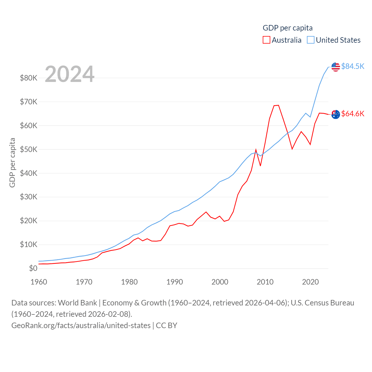 By GDP, Australia ranks 14/197 ($1.76T) and The United States ranks 1/197 ($28.8T). By GDP per capita, Australia ranks 14/197 ($64,604), while The United States ranks 10/197 ($84,534).