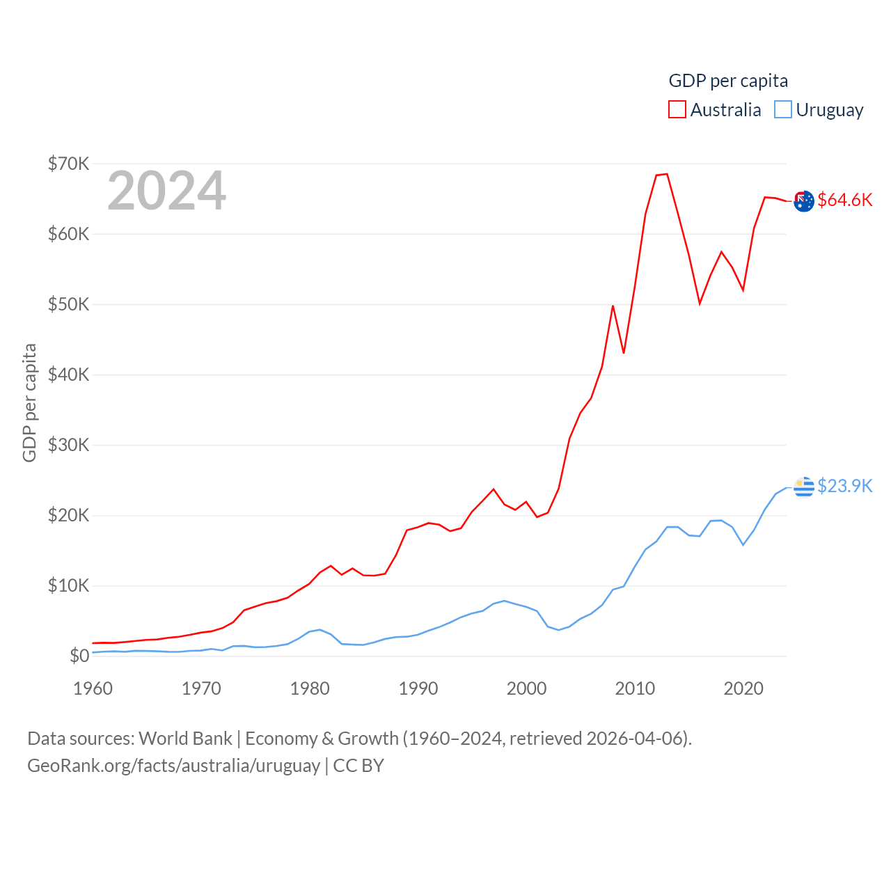 By GDP, Australia ranks 14/197 ($1.76T) and Uruguay ranks 81/197 ($81B). By GDP per capita, Australia ranks 14/197 ($64,604), while Uruguay ranks 52/197 ($23,907).