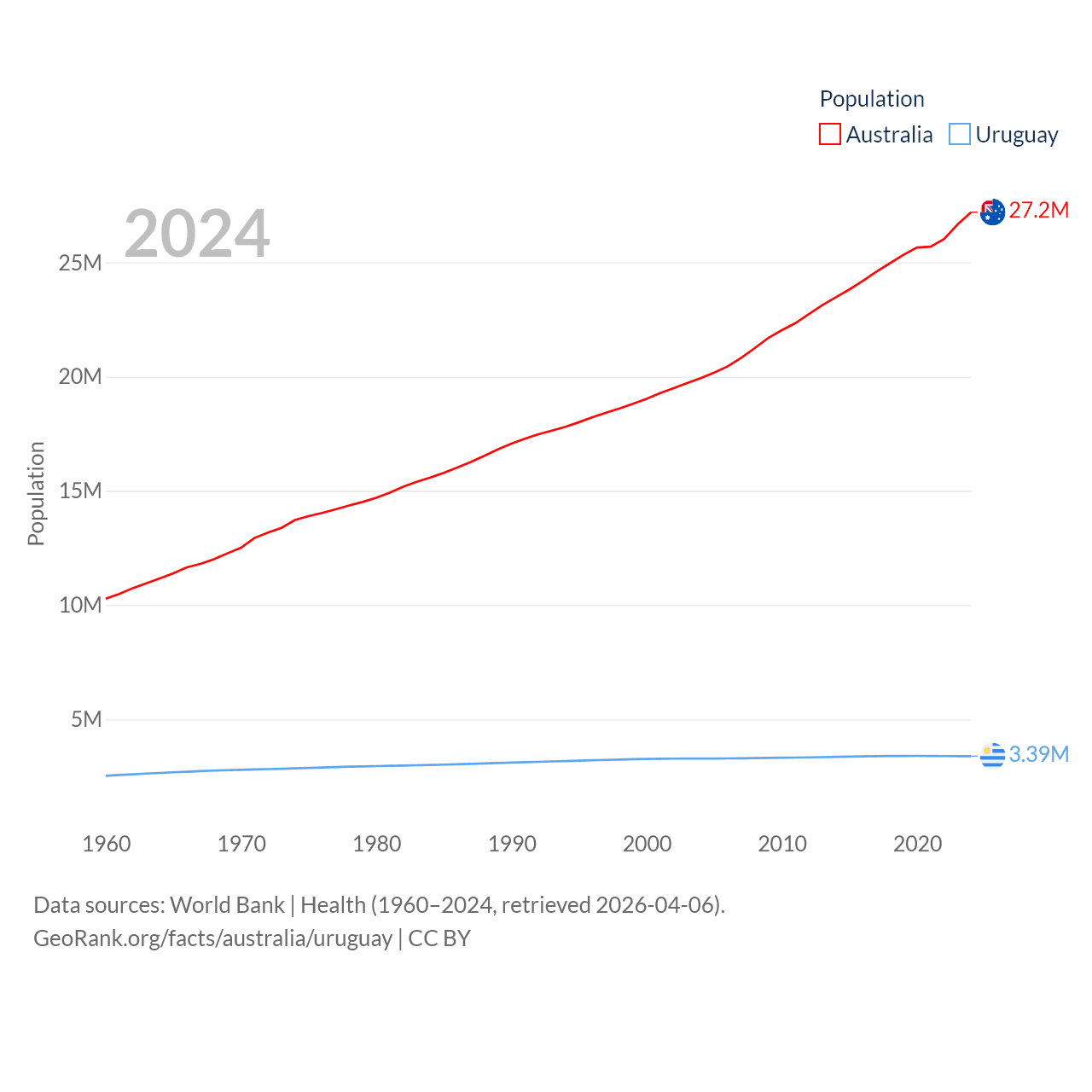 Australia has a population of 27.2M (ranked 54/197), compared with 3.39M in Uruguay (ranked 133/197). Australia's land area is 2,969,906 sq mi versus 67,576 sq mi for Uruguay (ranked 6th vs. 89th).