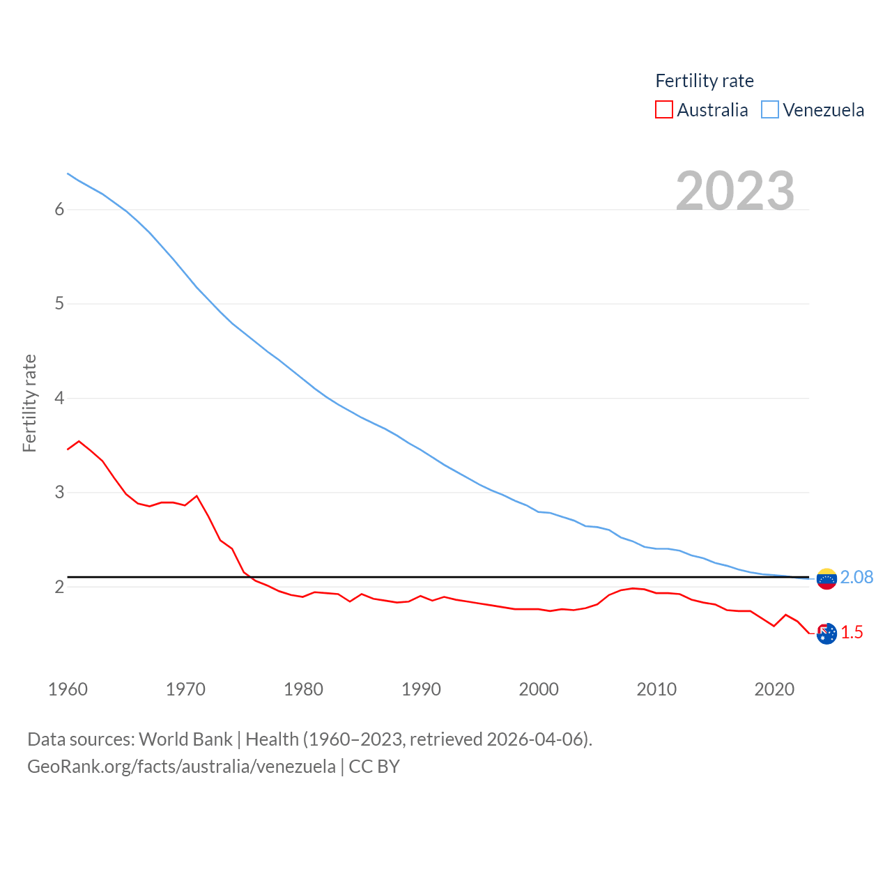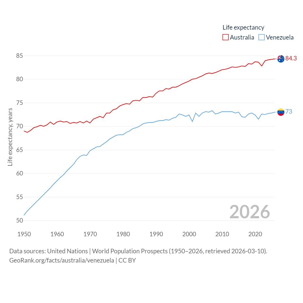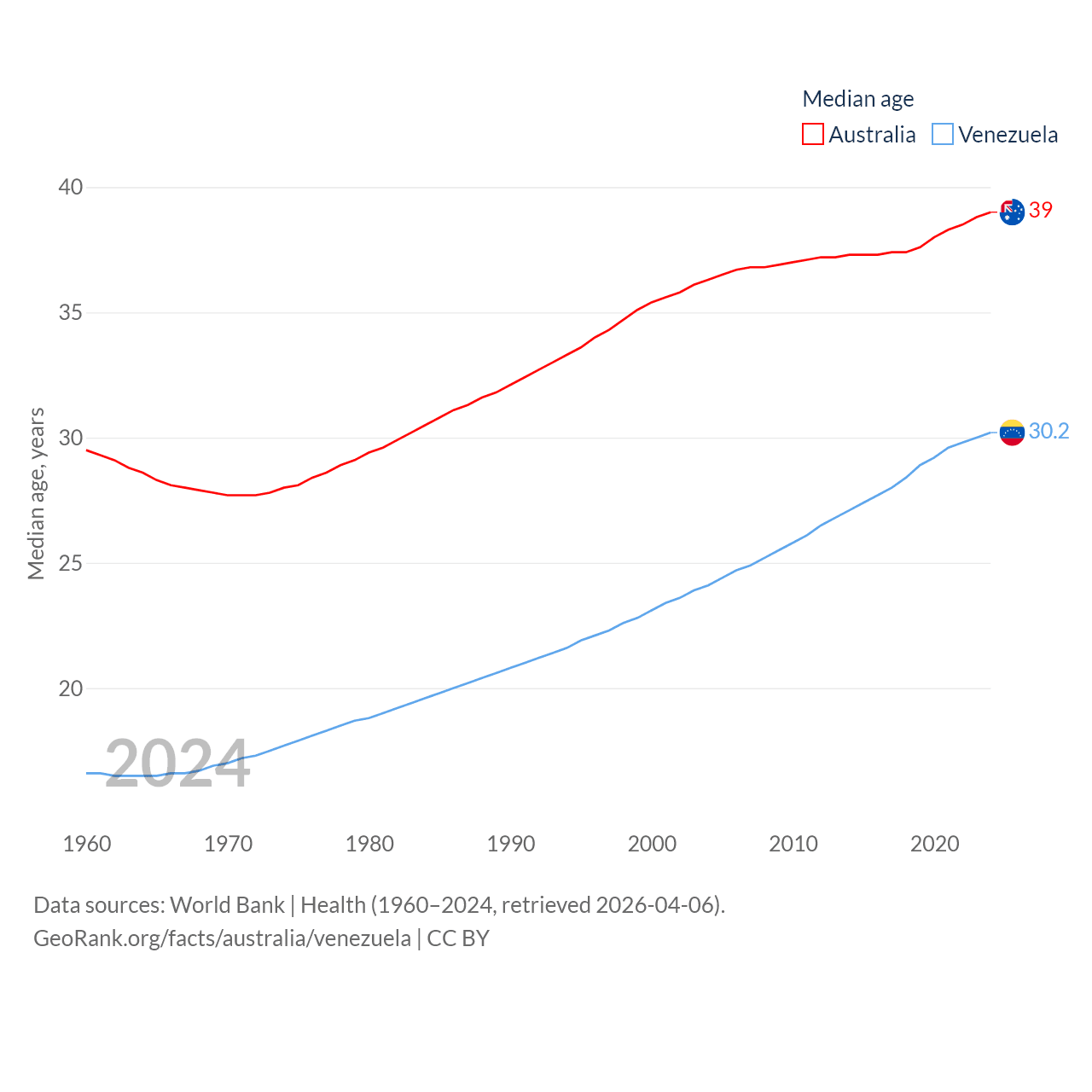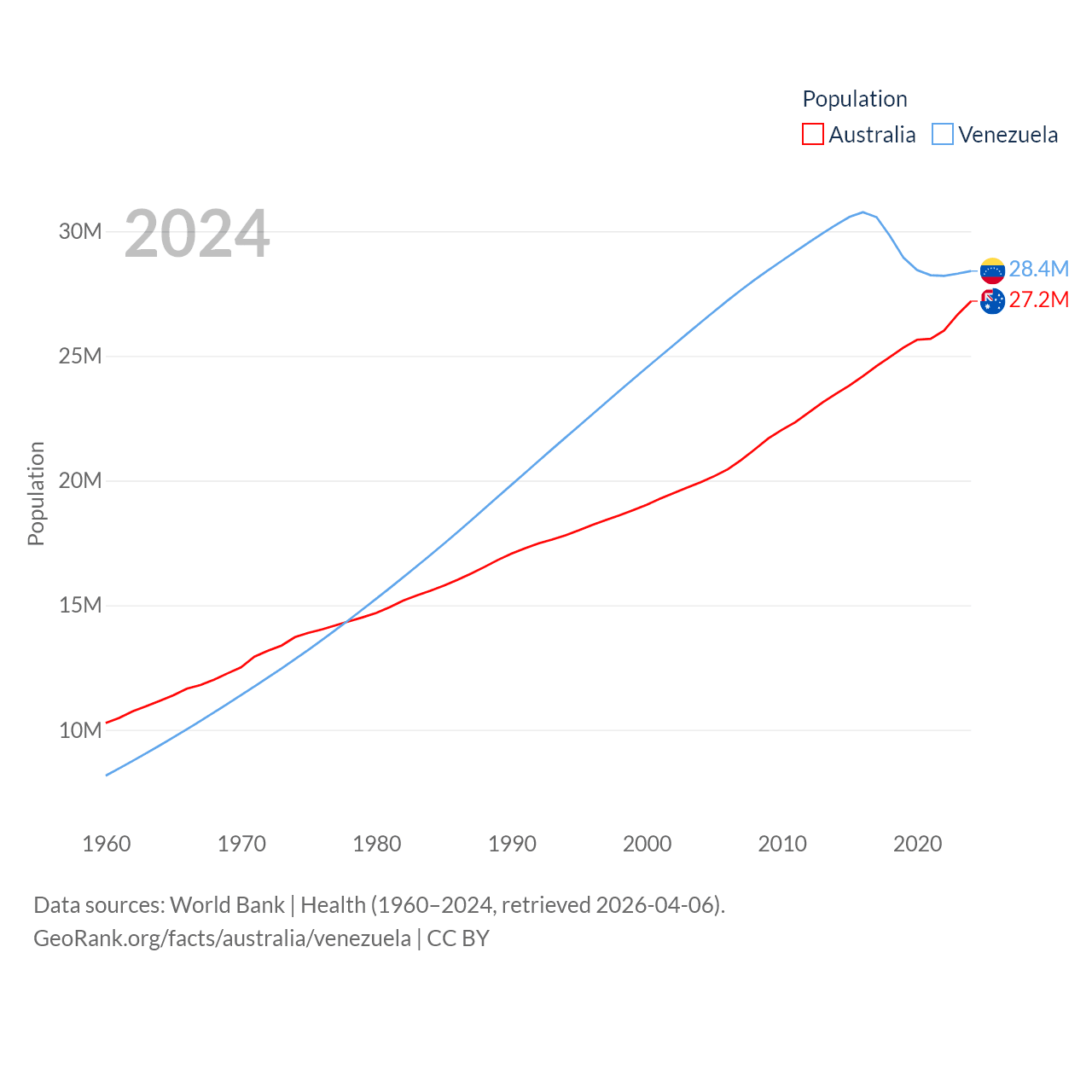 Australia has a population of 27.2M (ranked 54/197), compared with 28.4M in Venezuela (ranked 53/197). Australia's land area is 2,969,906 sq mi versus 340,561 sq mi for Venezuela (ranked 6th vs. 32nd).