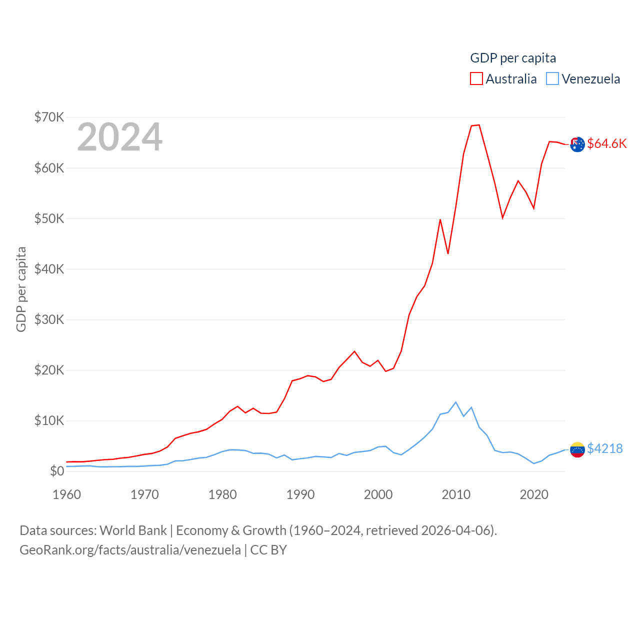By GDP, Australia ranks 14/197 ($1.76T) and Venezuela ranks 65/197 ($120B). By GDP per capita, Australia ranks 14/197 ($64,604), while Venezuela ranks 128/197 ($4,218).