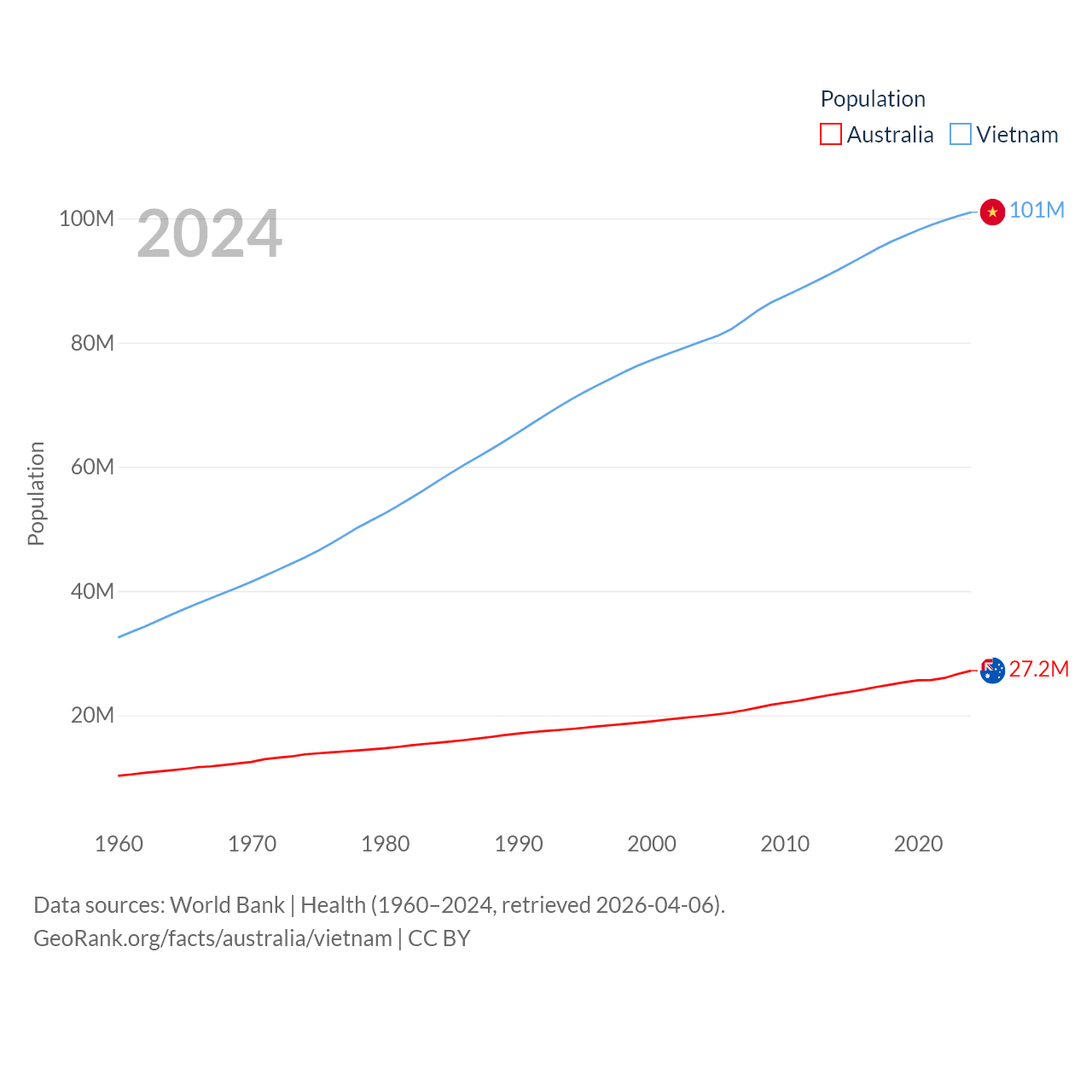 Australia has a population of 27.2M (ranked 54/197), compared with 101M in Vietnam (ranked 16/197). Australia's land area is 2,969,906 sq mi versus 121,016 sq mi for Vietnam (ranked 6th vs. 67th).