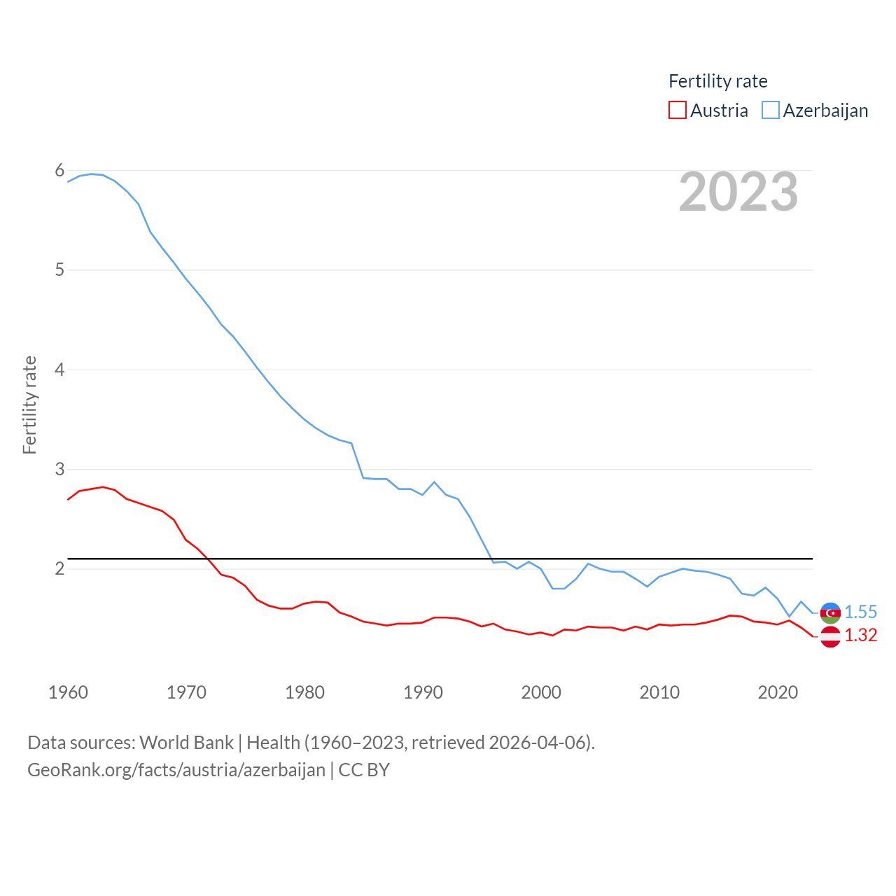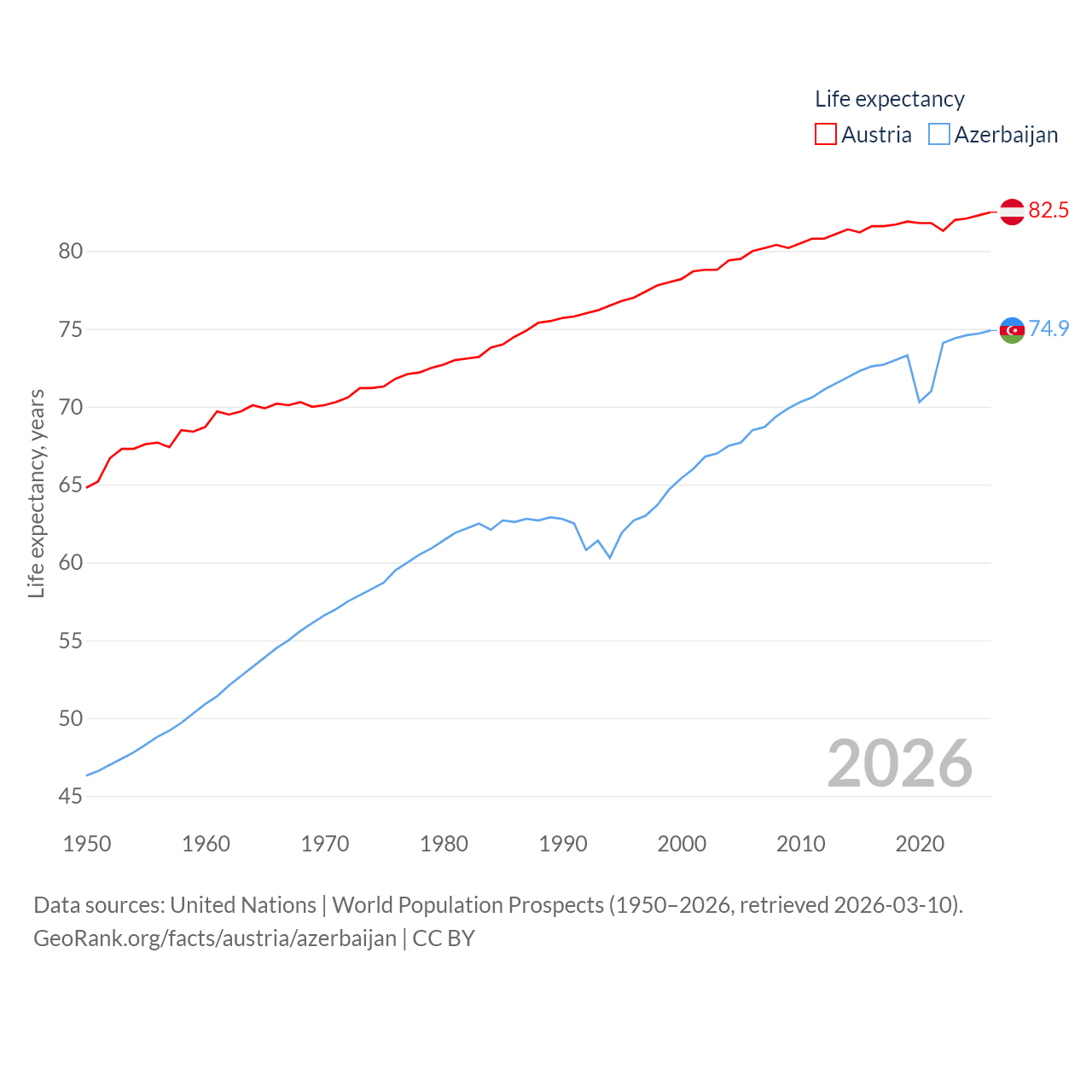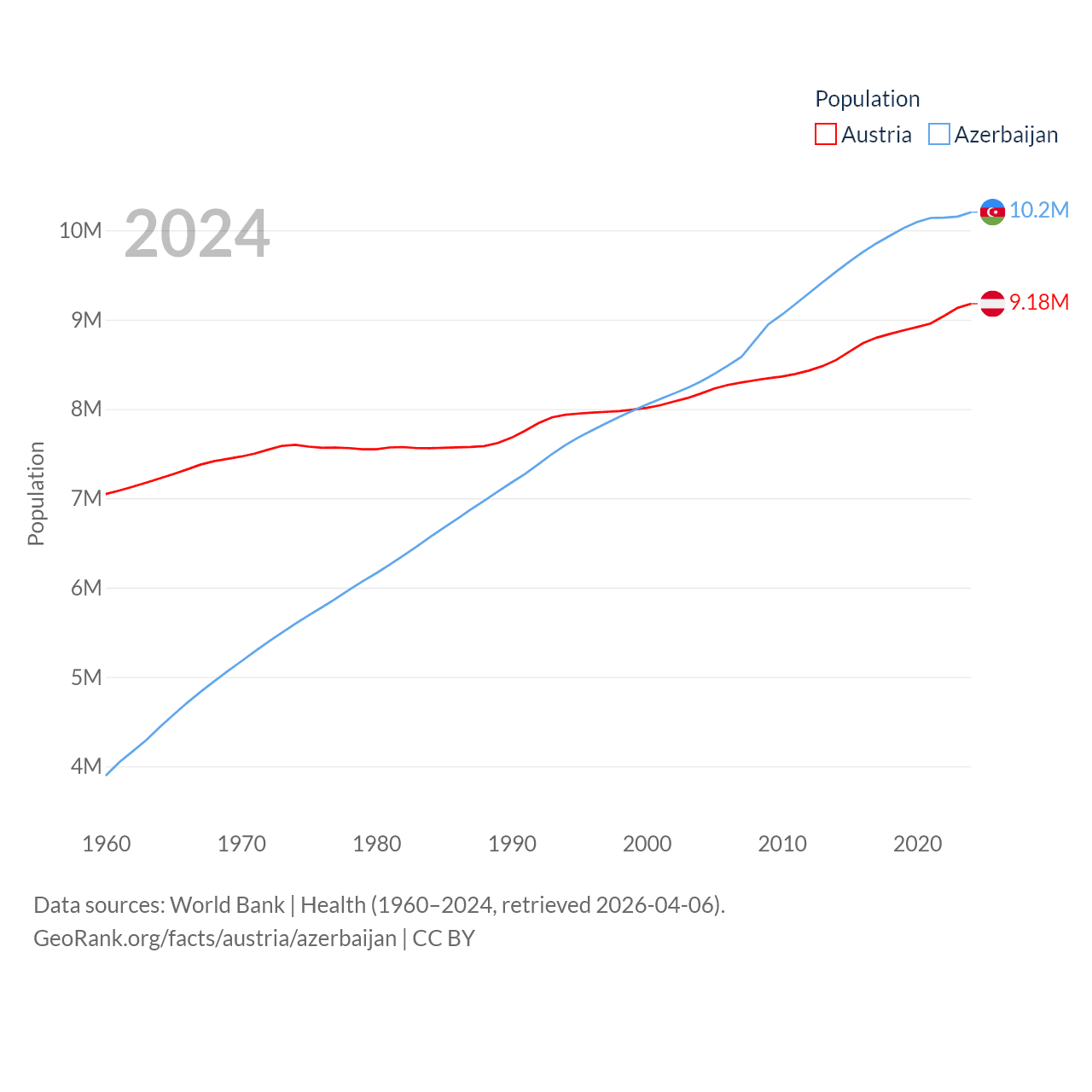 Austria has a population of 9.18M (ranked 99/197), compared with 10.2M in Azerbaijan (ranked 95/197). Austria's land area is 31,861 sq mi versus 31,911 sq mi for Azerbaijan (ranked 113th vs. 112th).