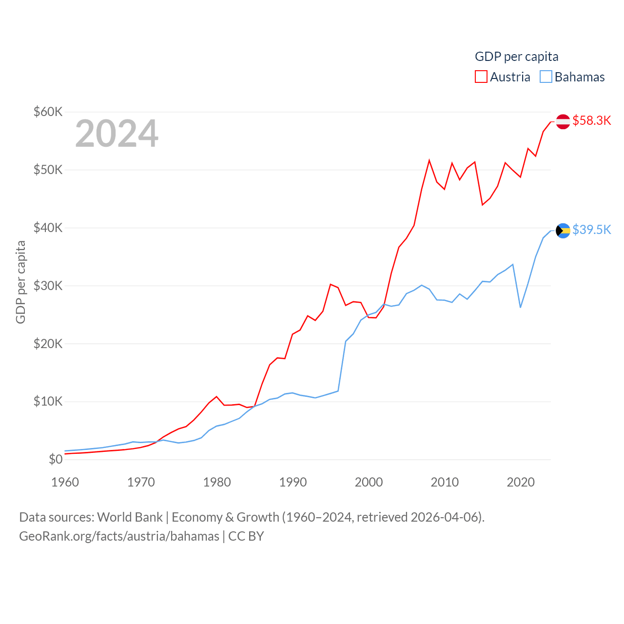 By GDP, Austria ranks 30/197 ($535B) and The Bahamas ranks 140/197 ($15.8B). By GDP per capita, Austria ranks 16/197 ($58,269), while The Bahamas ranks 30/197 ($39,455).