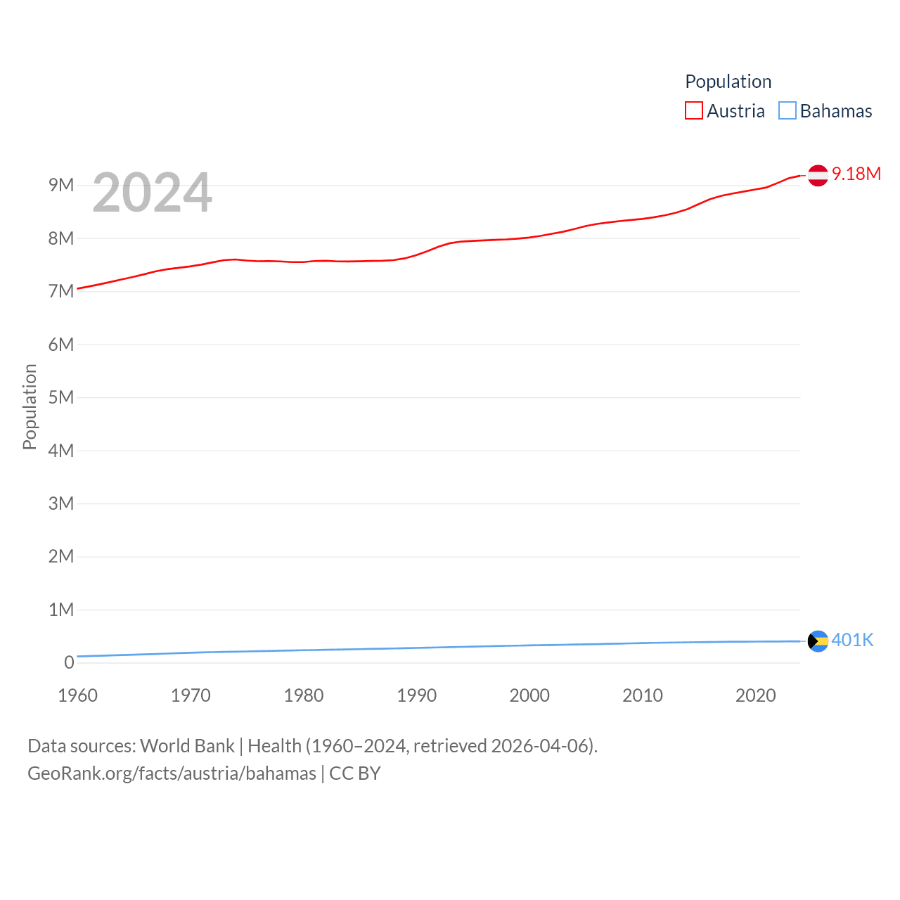 Austria has a population of 9.18M (ranked 99/197), compared with 401K in The Bahamas (ranked 172/197). Austria's land area is 31,861 sq mi versus 3,865 sq mi for The Bahamas (ranked 113th vs. 162nd).