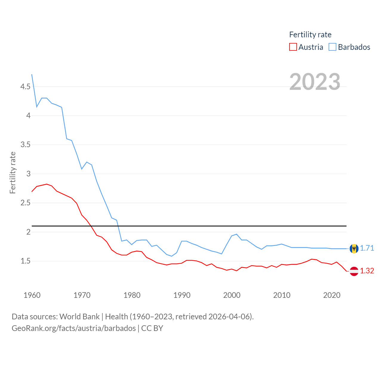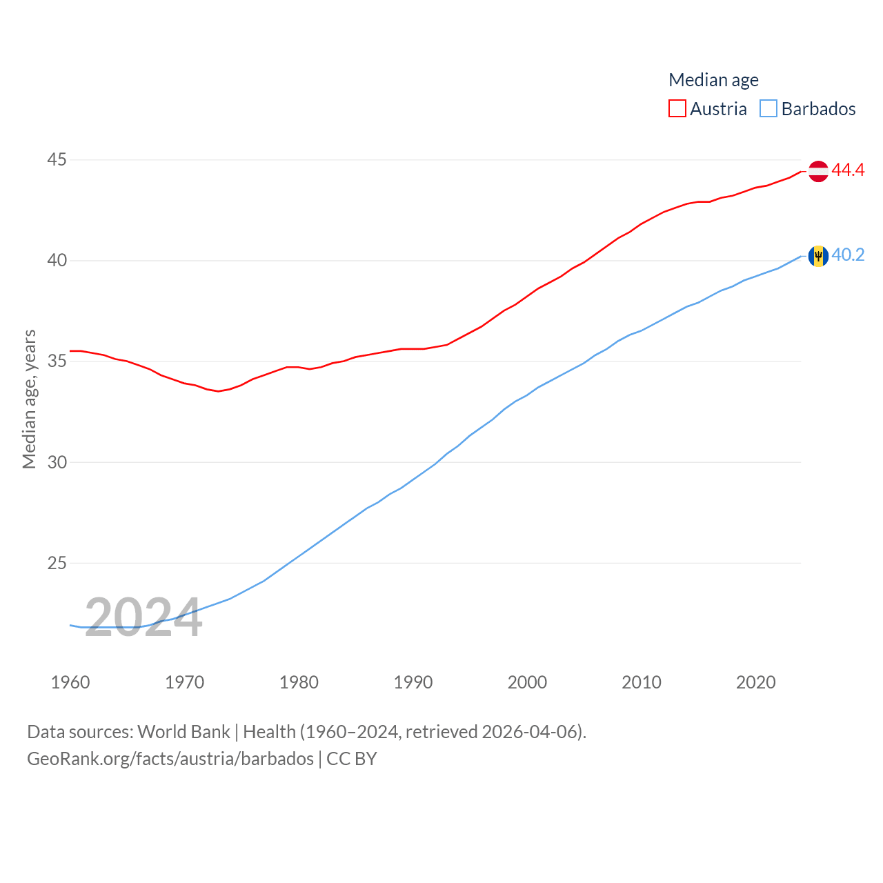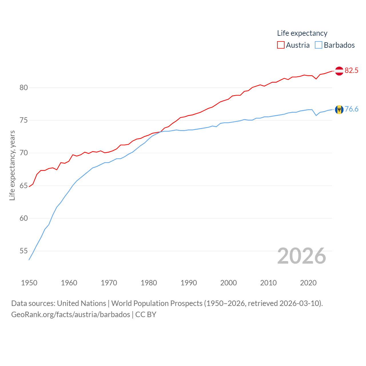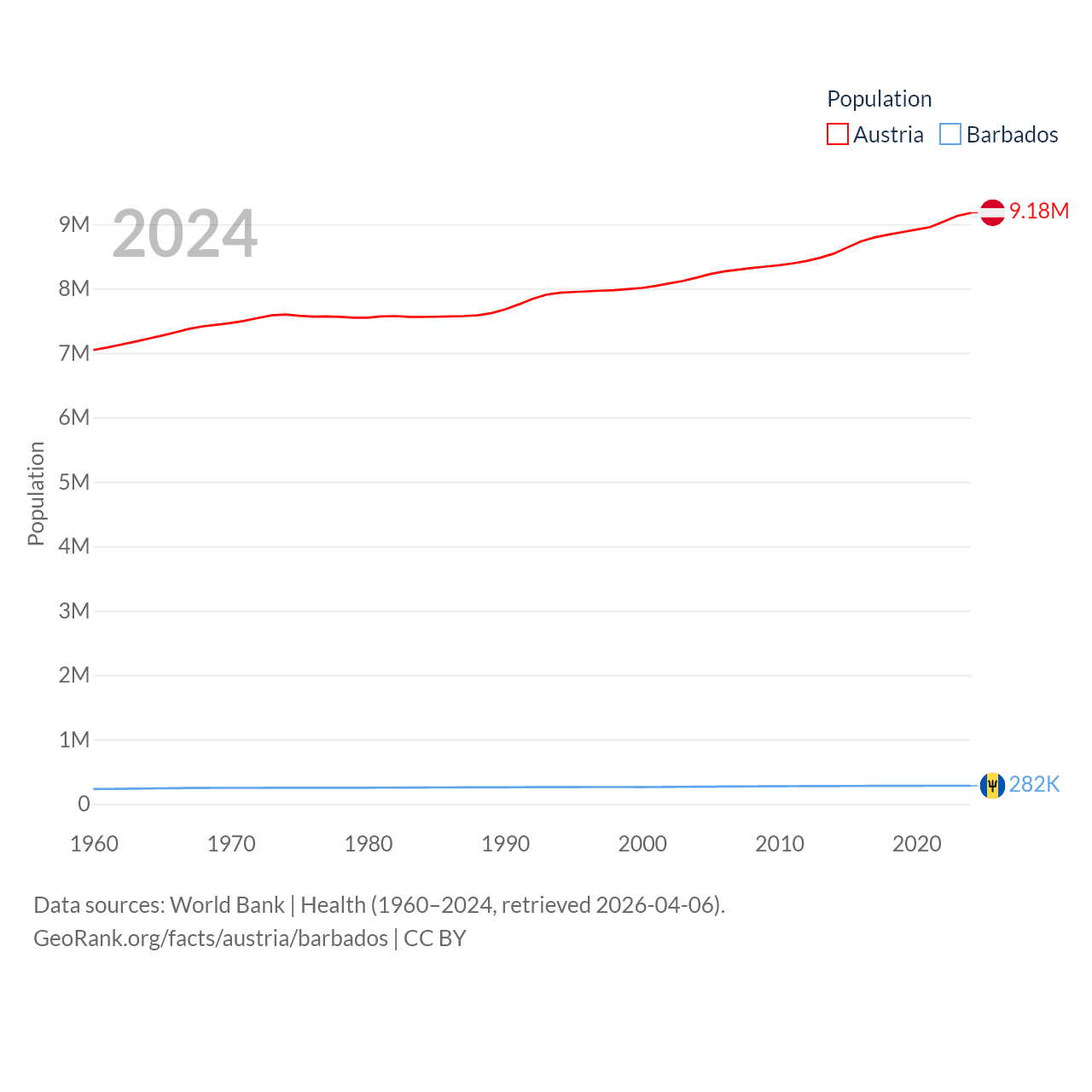 Austria has a population of 9.18M (ranked 99/197), compared with 282K in Barbados (ranked 175/197). Austria's land area is 31,861 sq mi versus 166 sq mi for Barbados (ranked 113th vs. 184th).