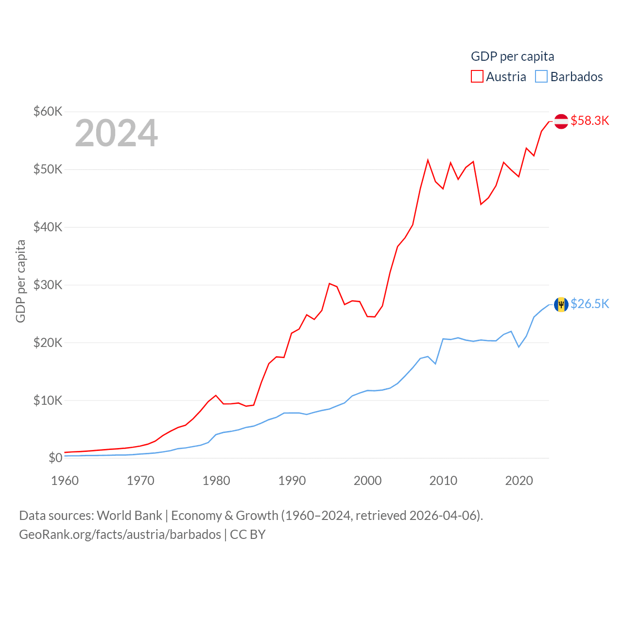 By GDP, Austria ranks 30/197 ($535B) and Barbados ranks 157/197 ($7.5B). By GDP per capita, Austria ranks 16/197 ($58,269), while Barbados ranks 46/197 ($26,545).