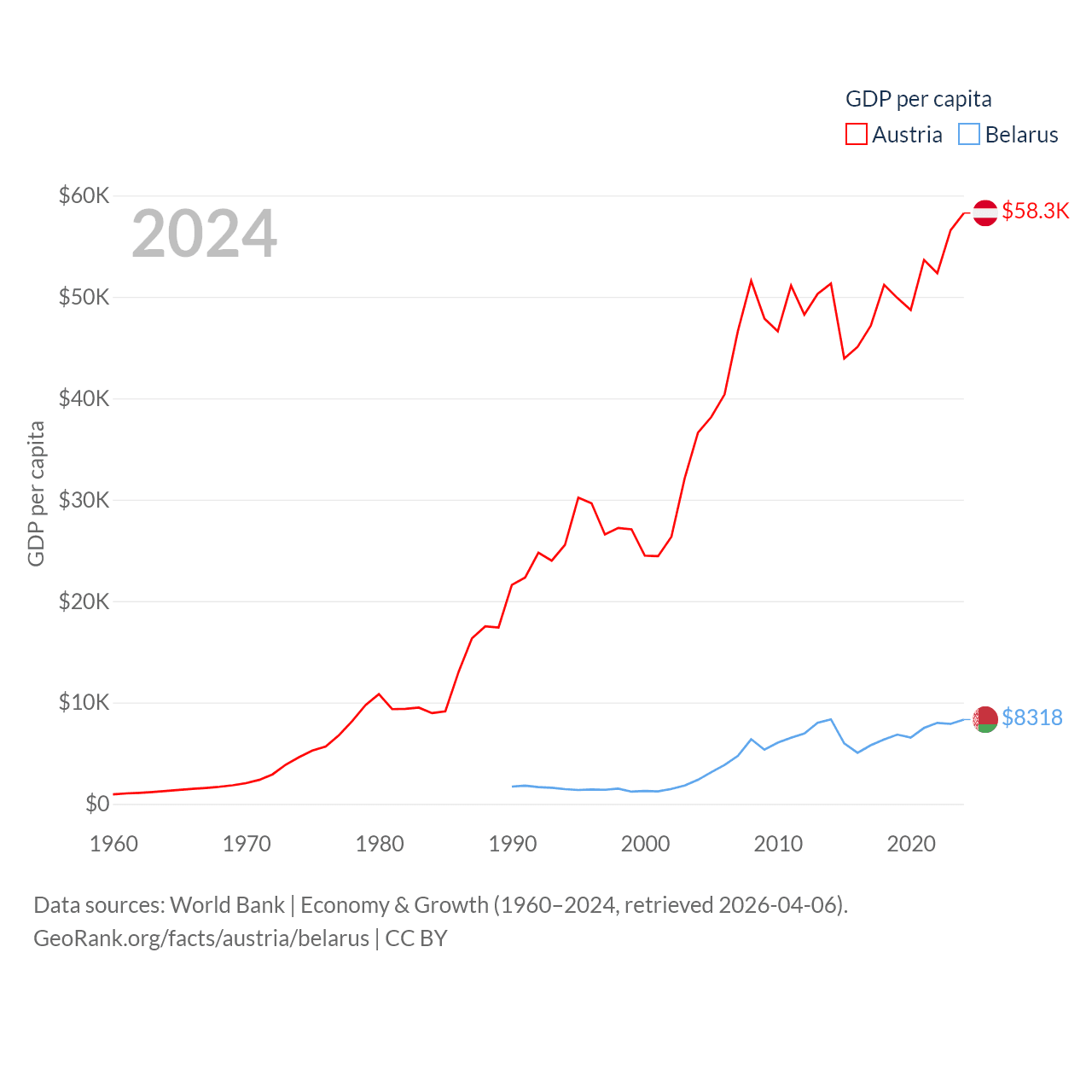 By GDP, Austria ranks 30/197 ($535B) and Belarus ranks 83/197 ($76B). By GDP per capita, Austria ranks 16/197 ($58,269), while Belarus ranks 92/197 ($8,318).