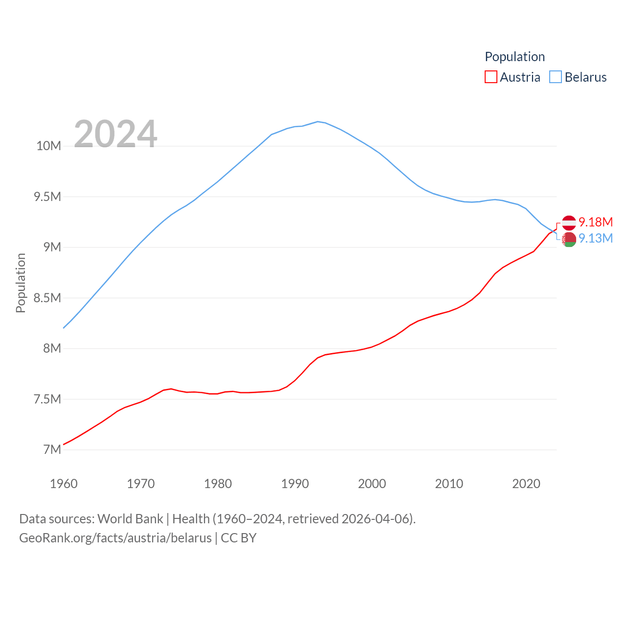 Austria has a population of 9.18M (ranked 99/197), compared with 9.13M in Belarus (ranked 100/197). Austria's land area is 31,861 sq mi versus 78,372 sq mi for Belarus (ranked 113th vs. 83rd).