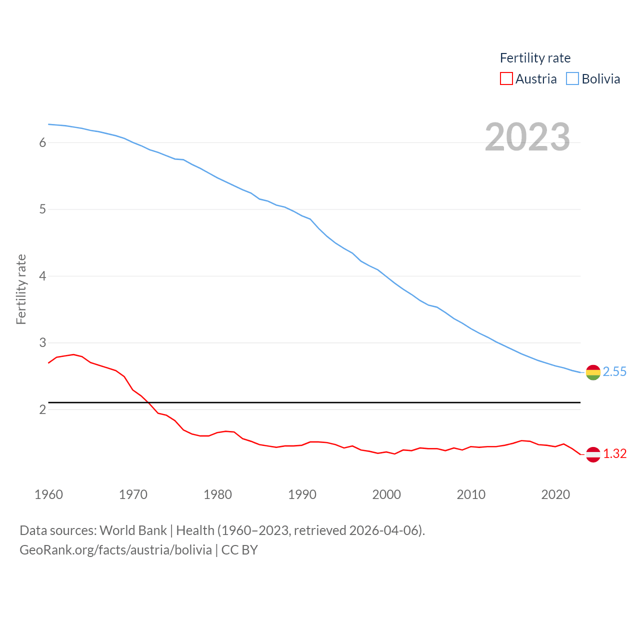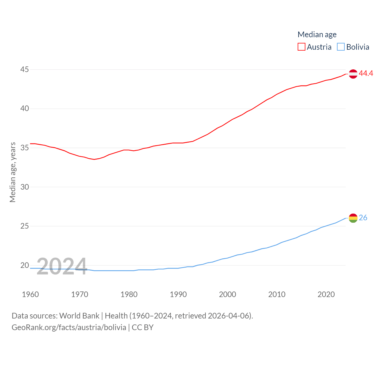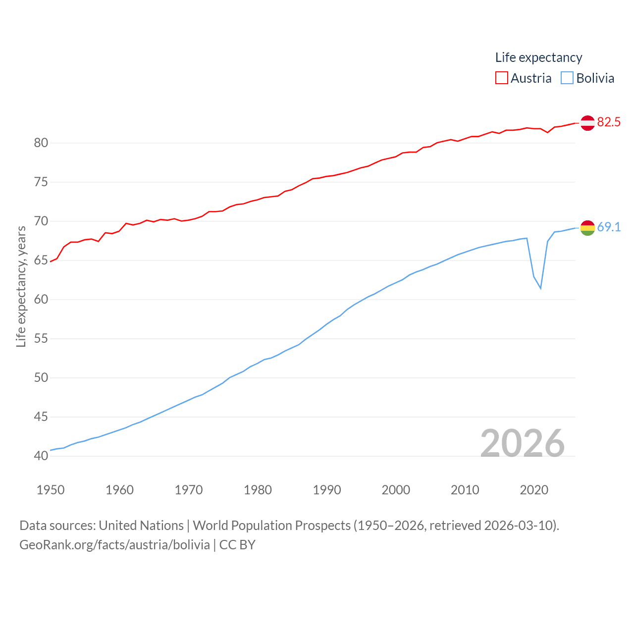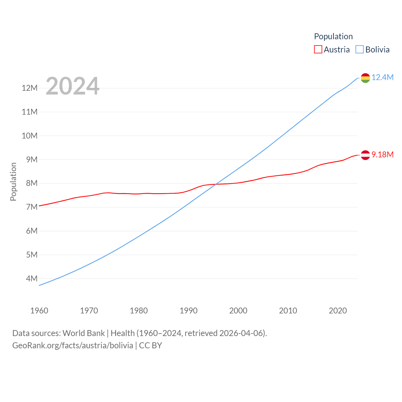 Austria has a population of 9.18M (ranked 99/197), compared with 12.4M in Bolivia (ranked 79/197). Austria's land area is 31,861 sq mi versus 418,264 sq mi for Bolivia (ranked 113th vs. 27th).