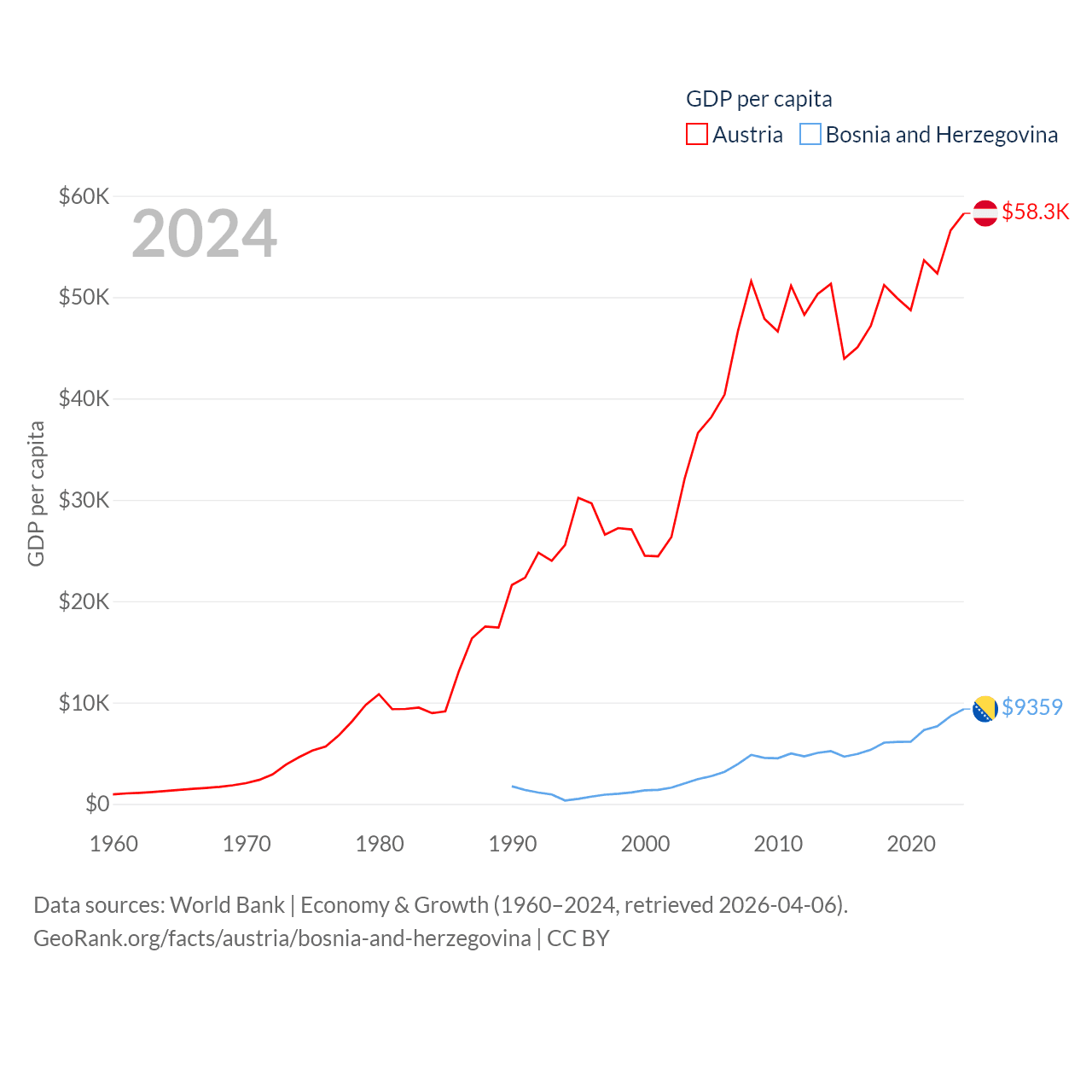 By GDP, Austria ranks 30/197 ($535B) and Bosnia and Herzegovina ranks 111/197 ($29.6B). By GDP per capita, Austria ranks 16/197 ($58,269), while Bosnia and Herzegovina ranks 87/197 ($9,359).