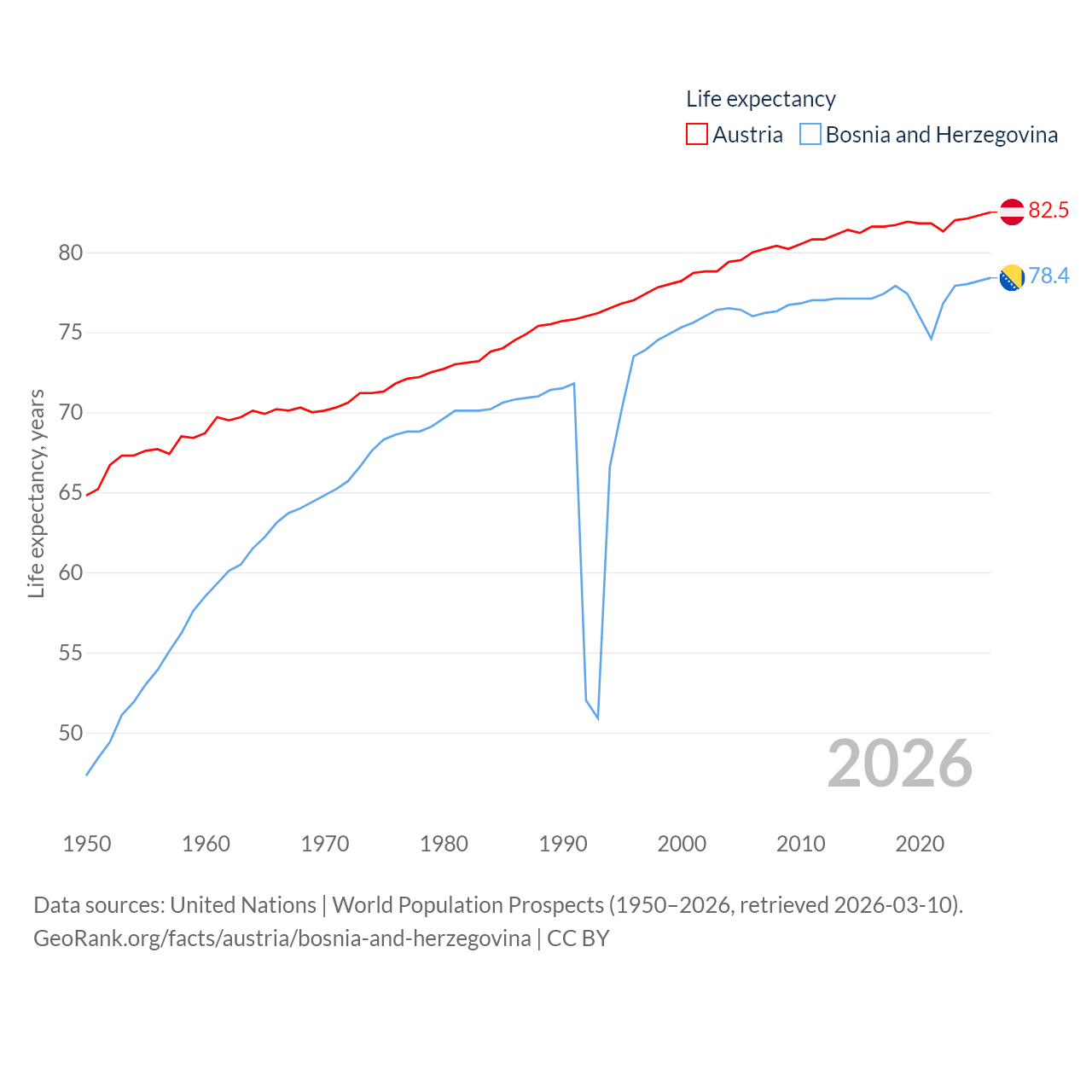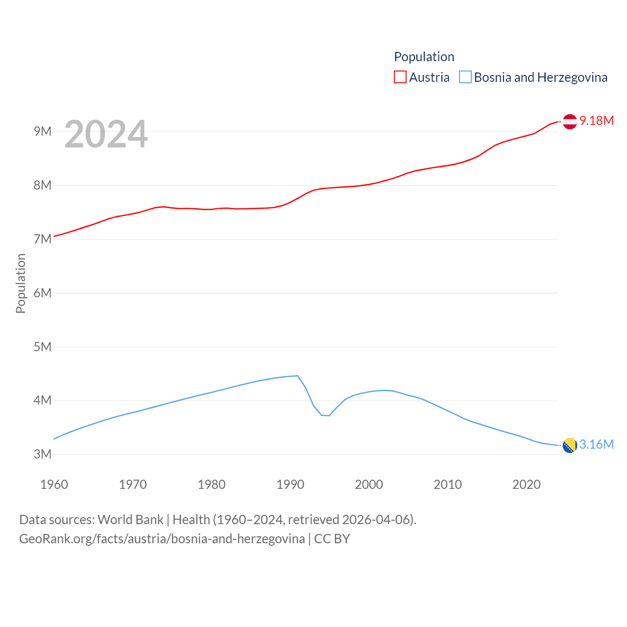 Austria has a population of 9.18M (ranked 99/197), compared with 3.16M in Bosnia and Herzegovina (ranked 134/197). Austria's land area is 31,861 sq mi versus 19,768 sq mi for Bosnia and Herzegovina (ranked 113th vs. 125th).