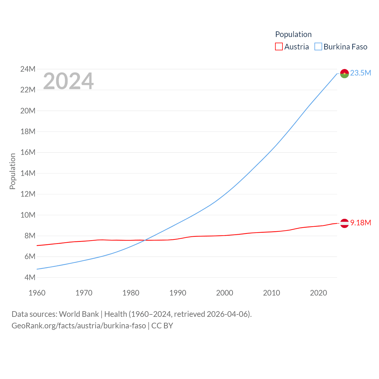 Austria has a population of 9.18M (ranked 99/197), compared with 23.5M in Burkina Faso (ranked 59/197). Austria's land area is 31,861 sq mi versus 105,638 sq mi for Burkina Faso (ranked 113th vs. 73rd).