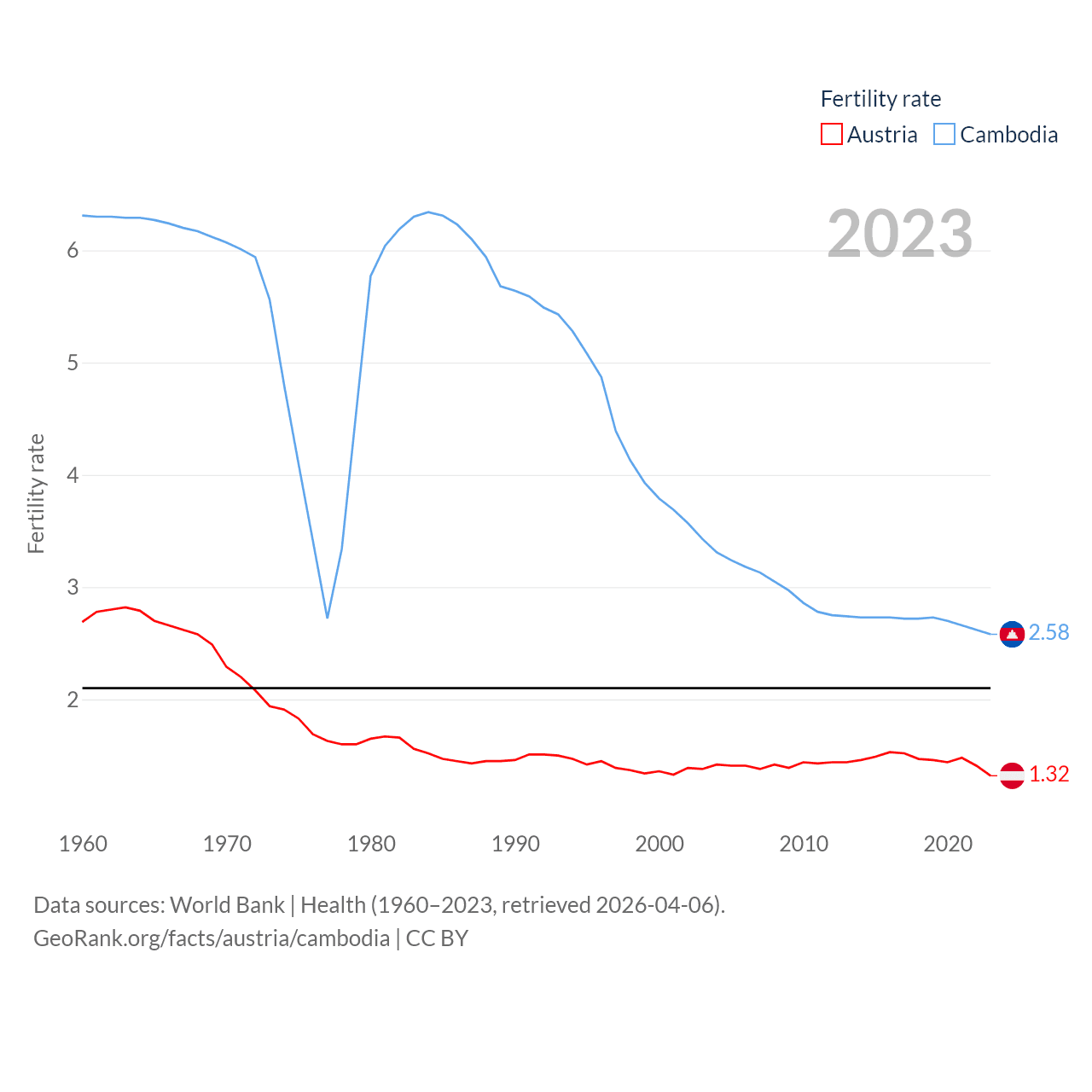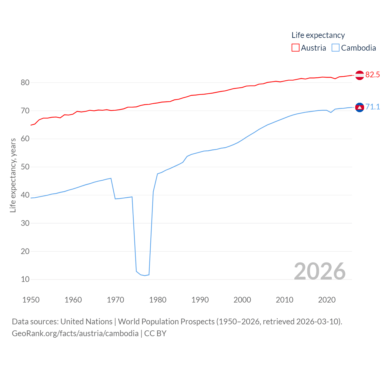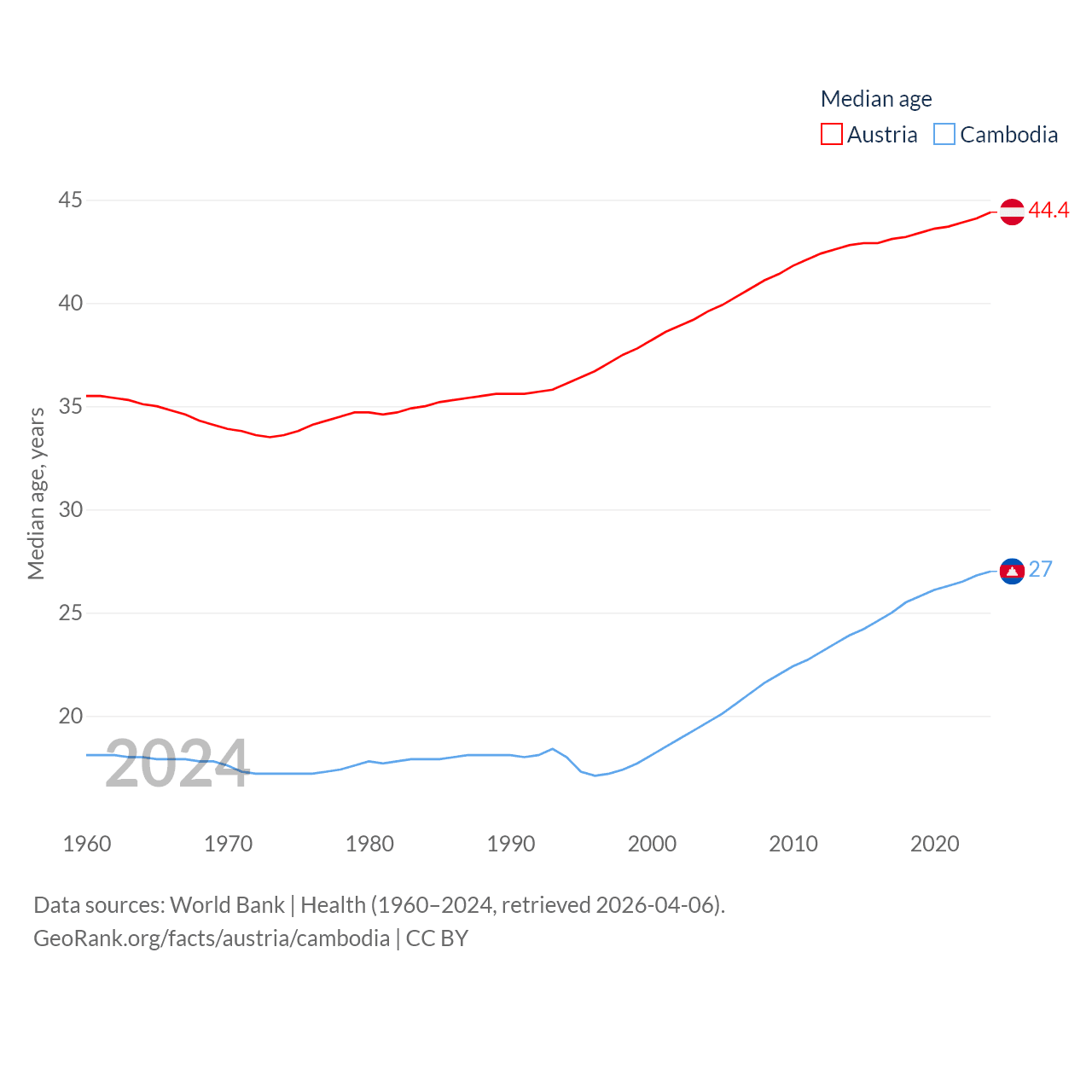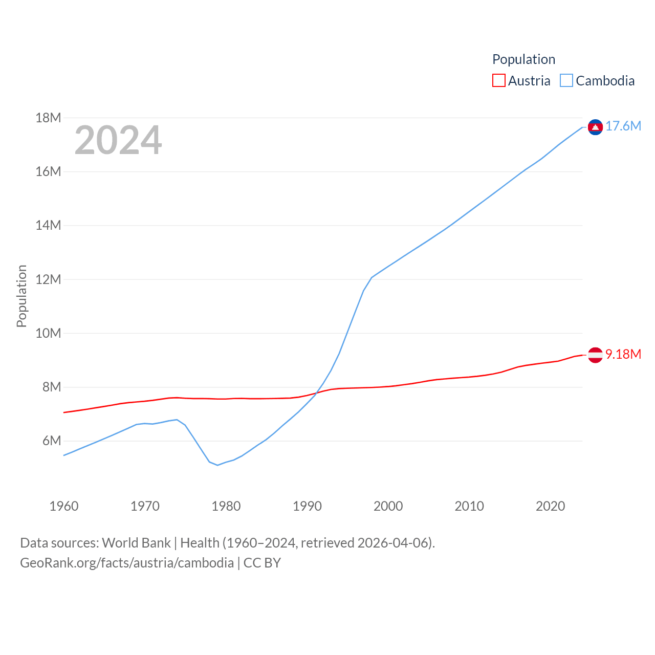 Austria has a population of 9.18M (ranked 99/197), compared with 17.6M in Cambodia (ranked 73/197). Austria's land area is 31,861 sq mi versus 68,155 sq mi for Cambodia (ranked 113th vs. 88th).