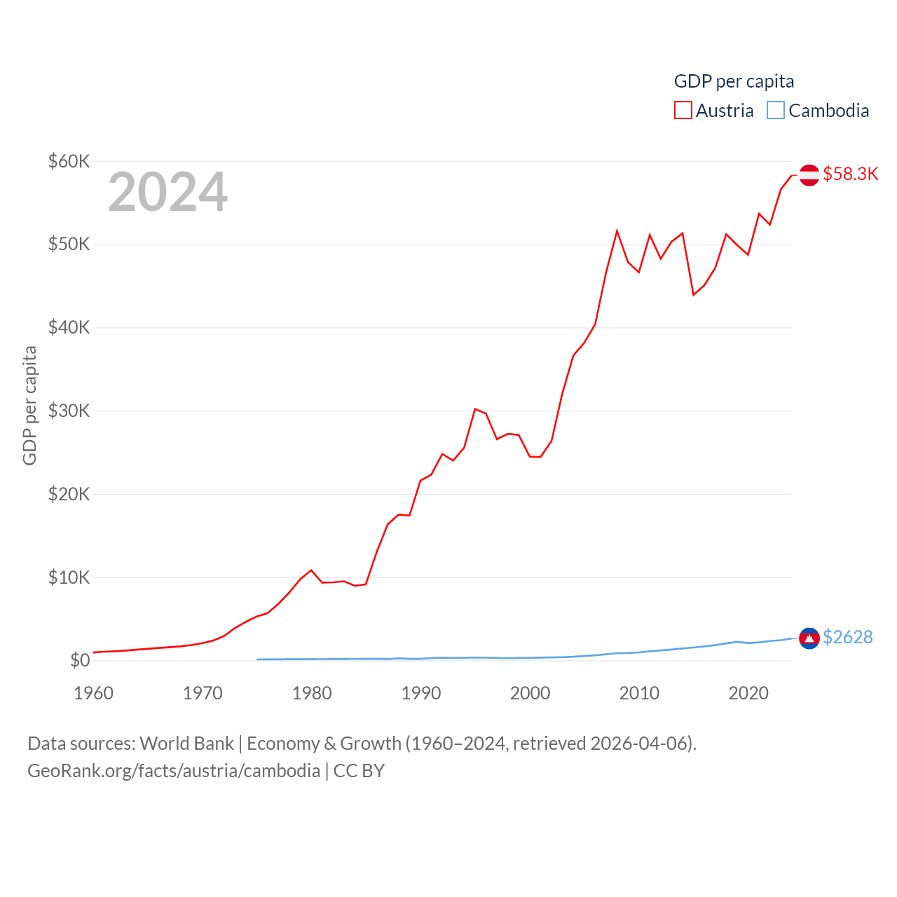 By GDP, Austria ranks 30/197 ($535B) and Cambodia ranks 97/197 ($46.4B). By GDP per capita, Austria ranks 16/197 ($58,269), while Cambodia ranks 145/197 ($2,628).