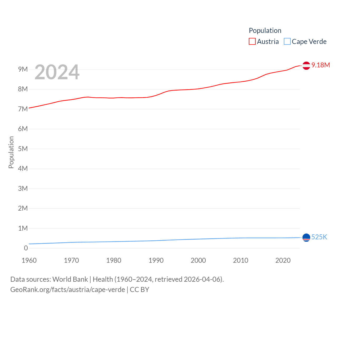 Austria has a population of 9.18M (ranked 99/197), compared with 525K in Cape Verde (ranked 169/197). Austria's land area is 31,861 sq mi versus 1,556 sq mi for Cape Verde (ranked 113th vs. 167th).