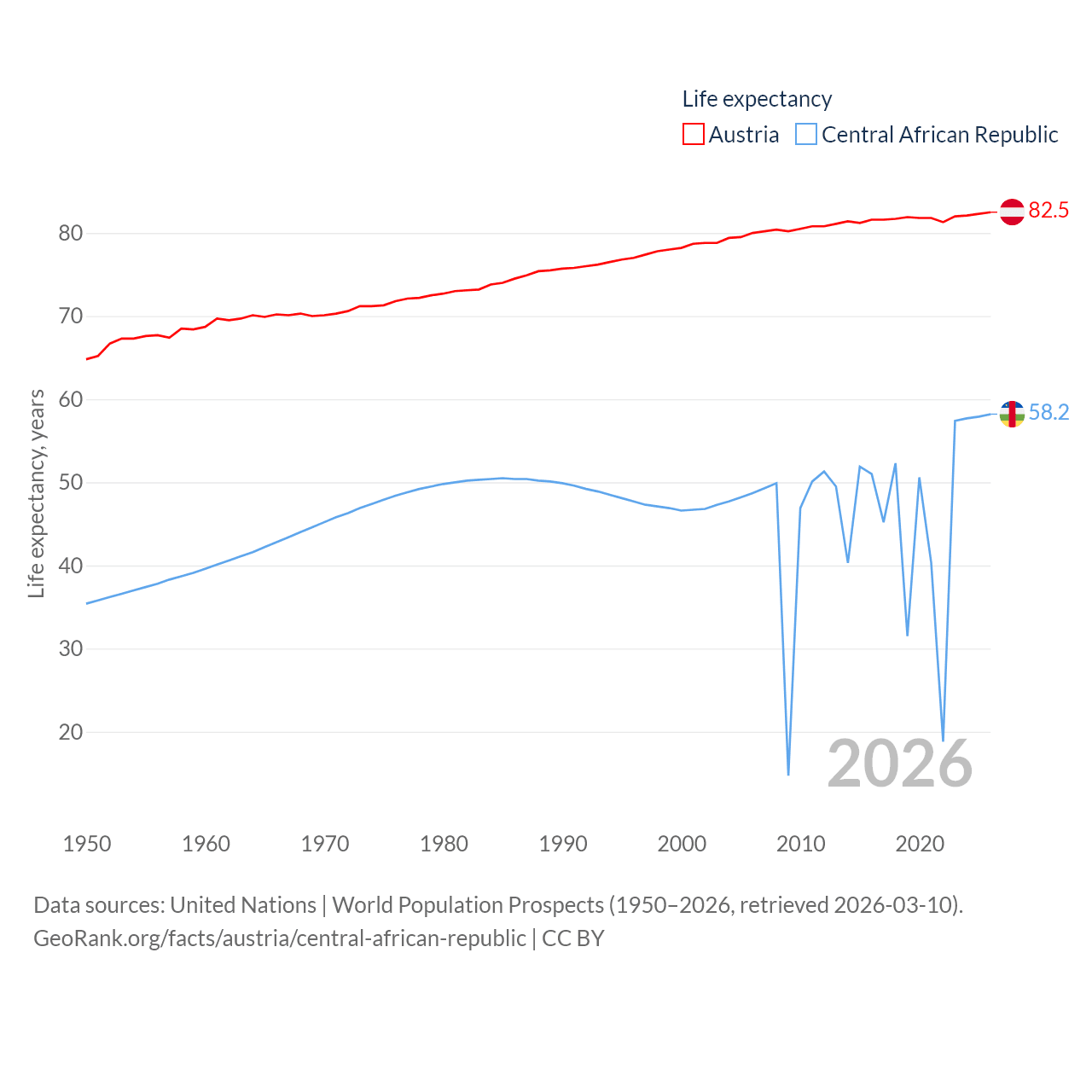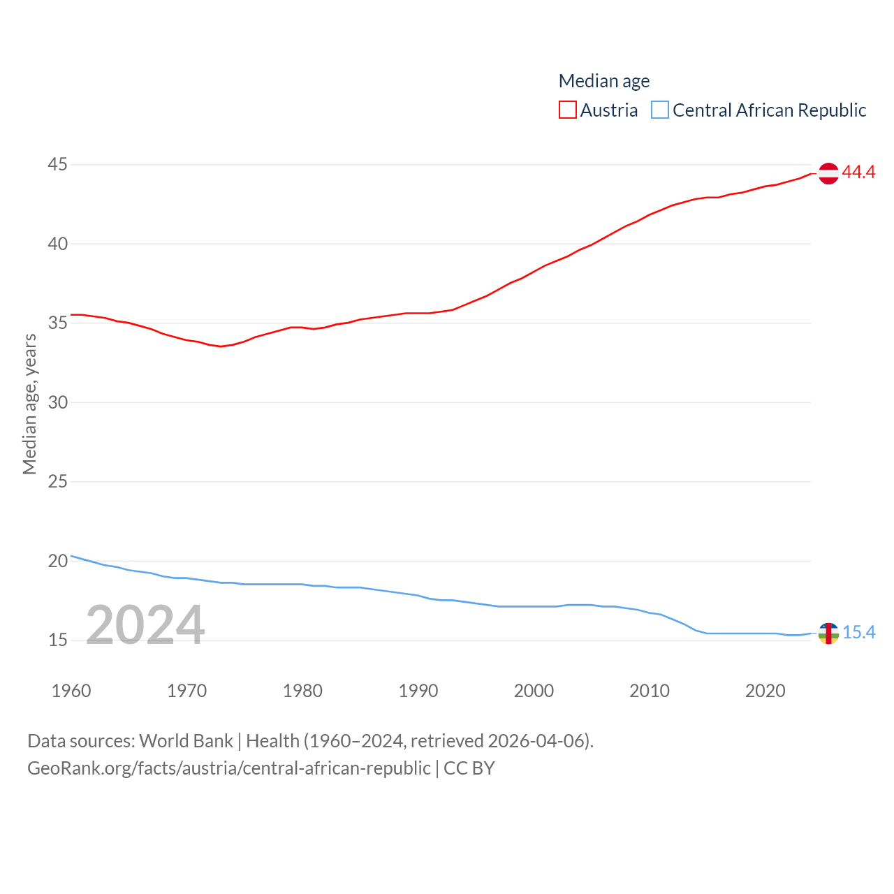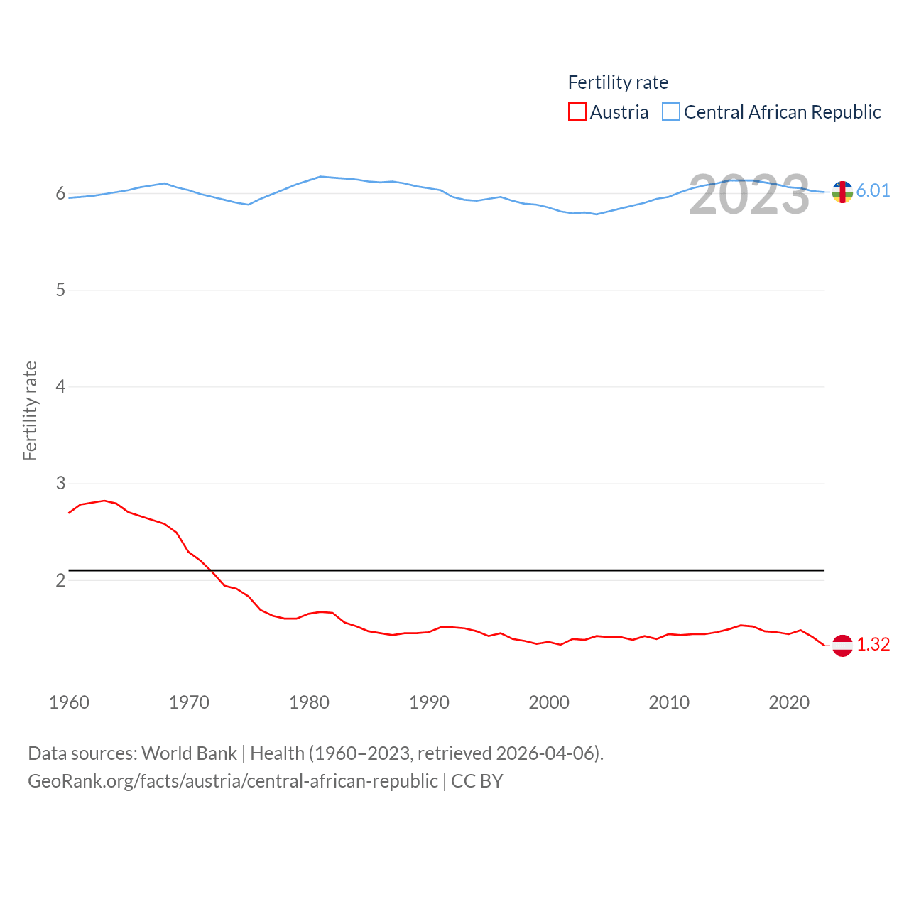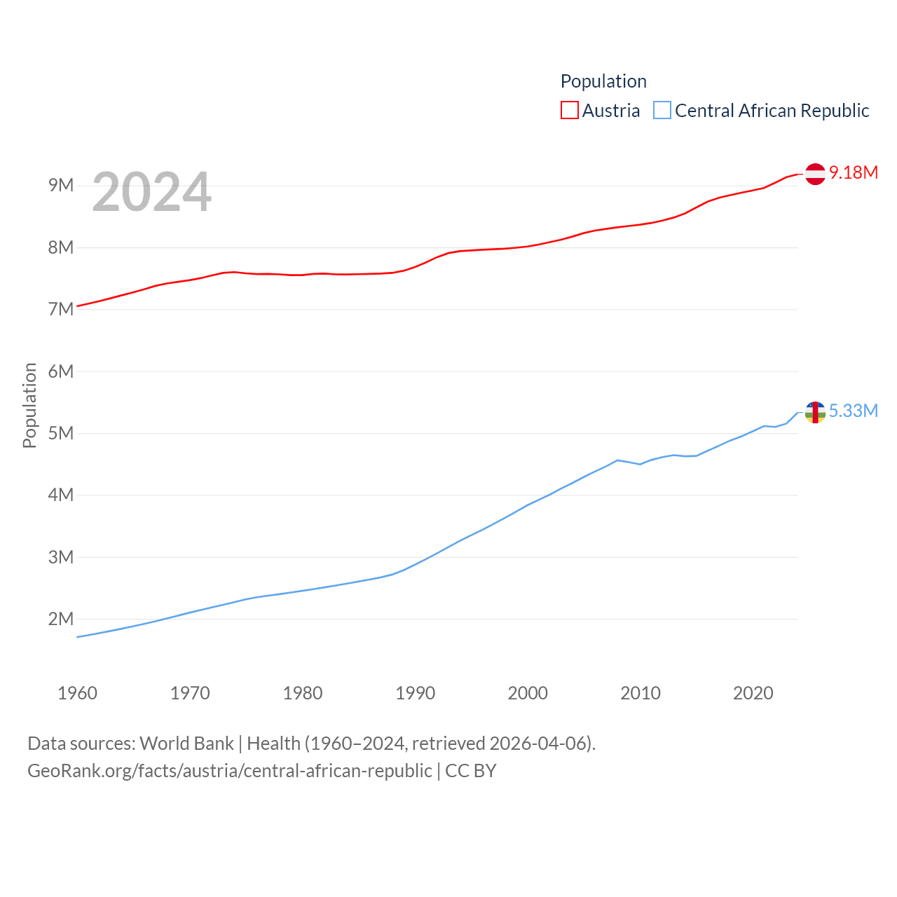 Austria has a population of 9.18M (ranked 99/197), compared with 5.33M in The Central African Republic (ranked 121/197). Austria's land area is 31,861 sq mi versus 240,534 sq mi for The Central African Republic (ranked 113th vs. 43rd).
