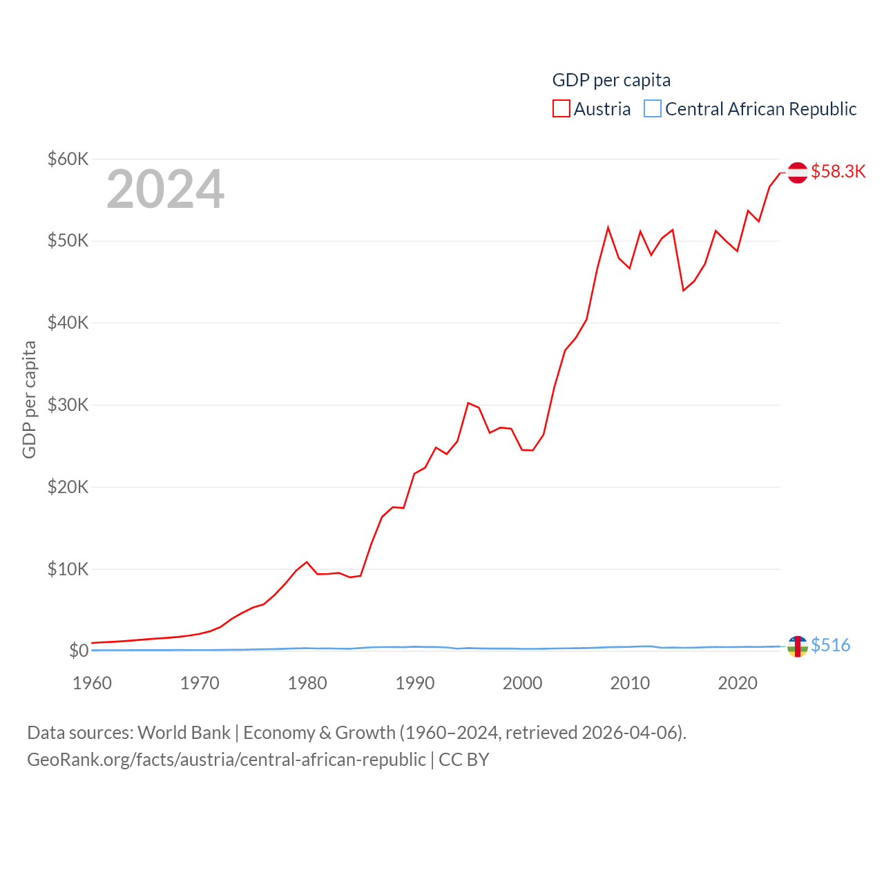 By GDP, Austria ranks 30/197 ($535B) and The Central African Republic ranks 171/197 ($2.75B). By GDP per capita, Austria ranks 16/197 ($58,269), while The Central African Republic ranks 195/197 ($516).