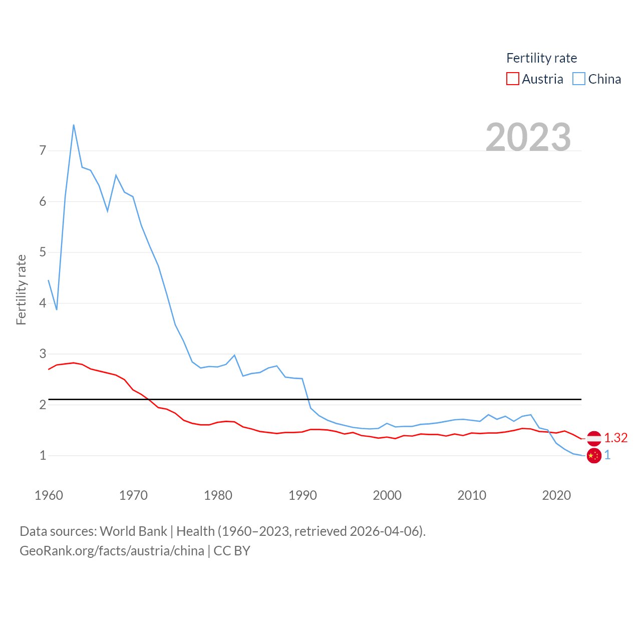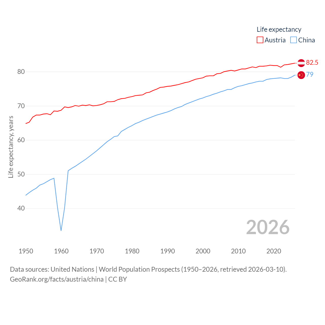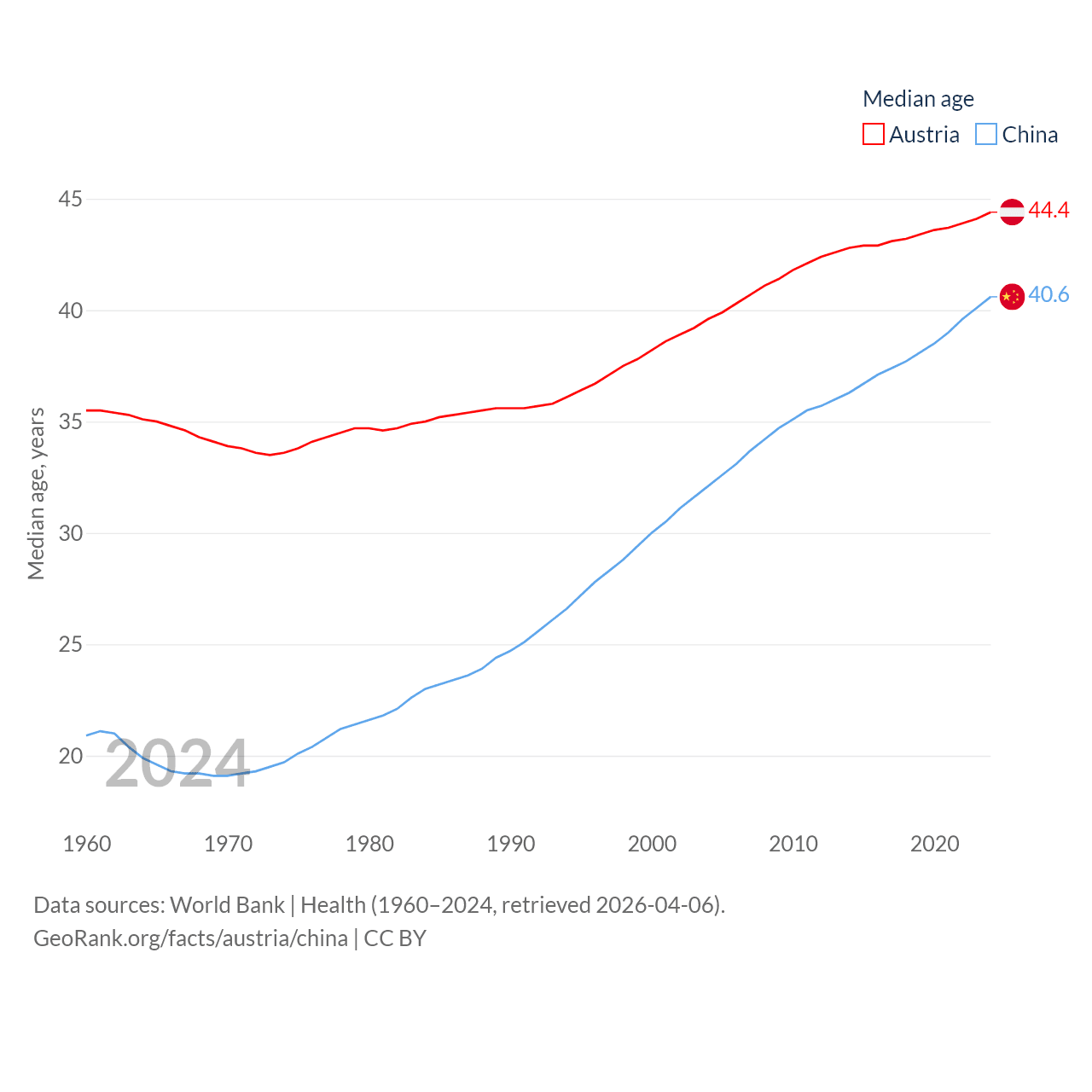 Austria has a population of 9.18M (ranked 99/197), compared with 1.41B in China (ranked 2/197). Austria's land area is 31,861 sq mi versus 3,624,808 sq mi for China (ranked 113th vs. 2nd).