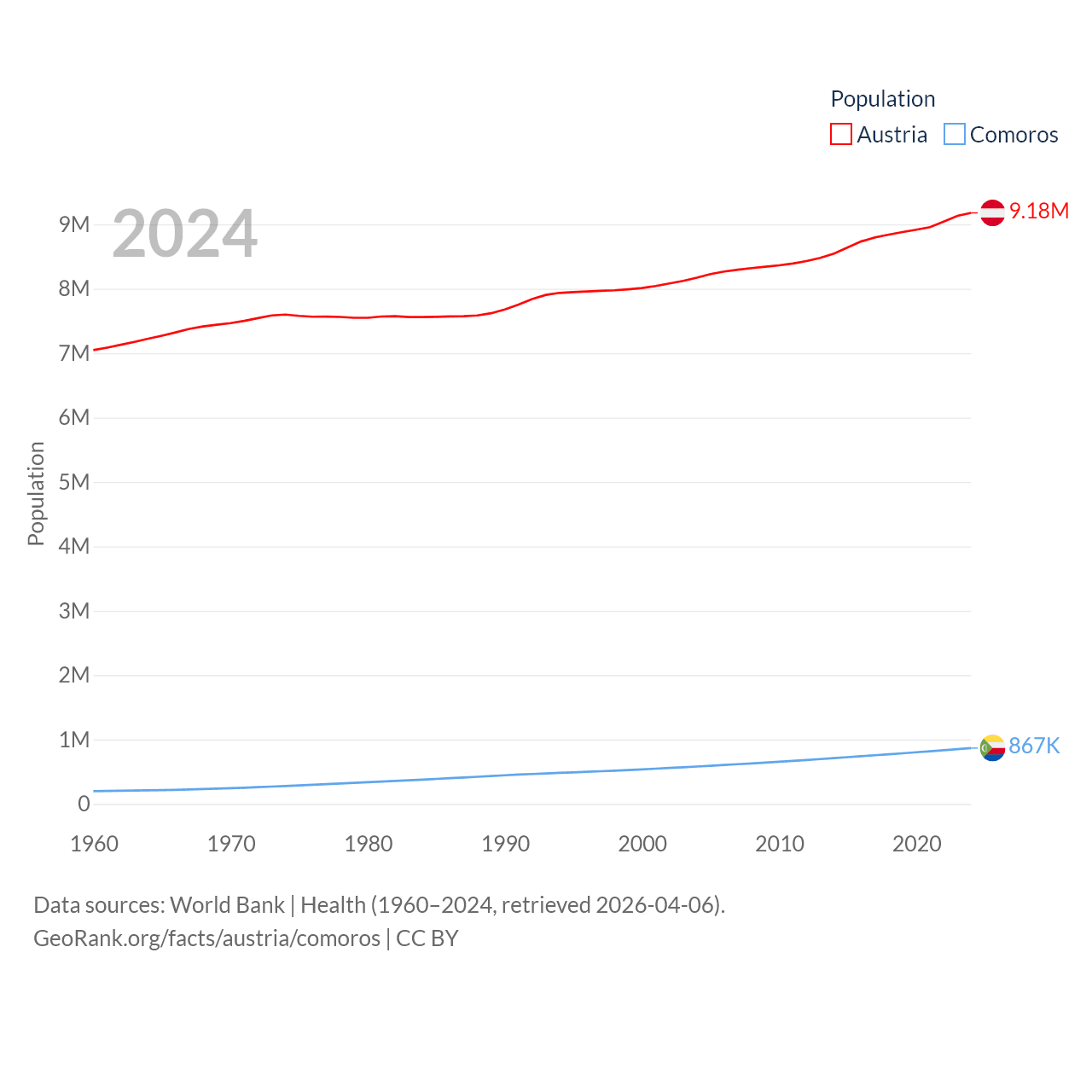 Austria has a population of 9.18M (ranked 99/197), compared with 867K in Comoros (ranked 160/197). Austria's land area is 31,861 sq mi versus 719 sq mi for Comoros (ranked 113th vs. 171st).