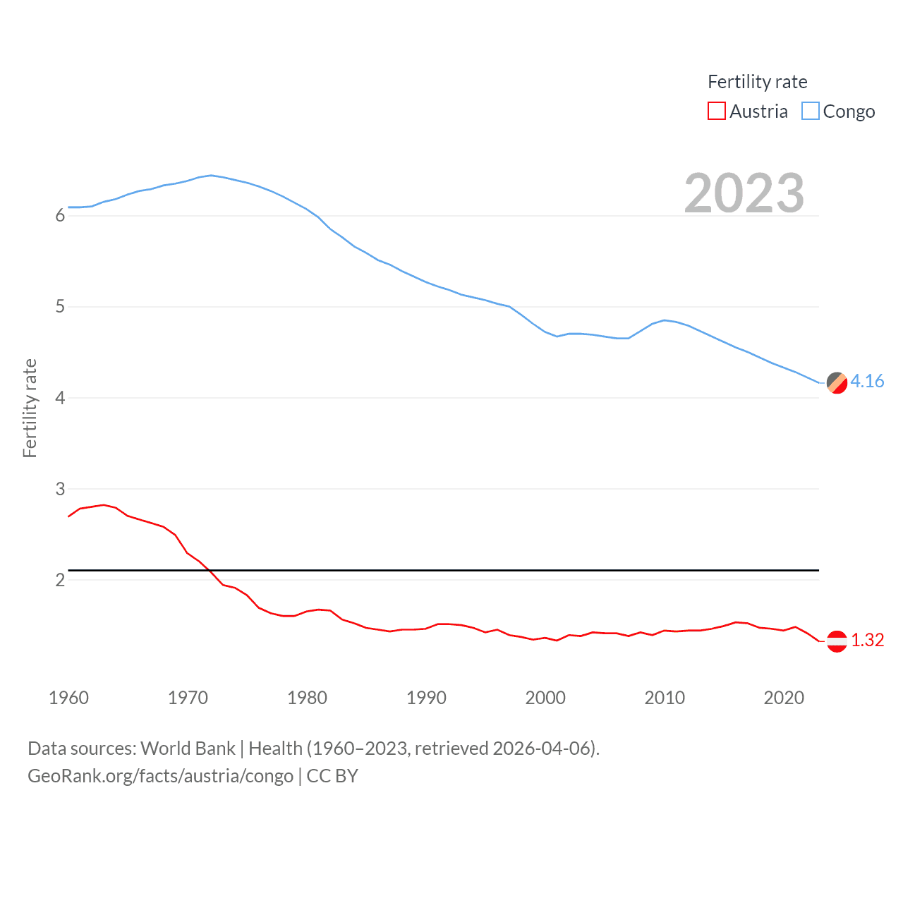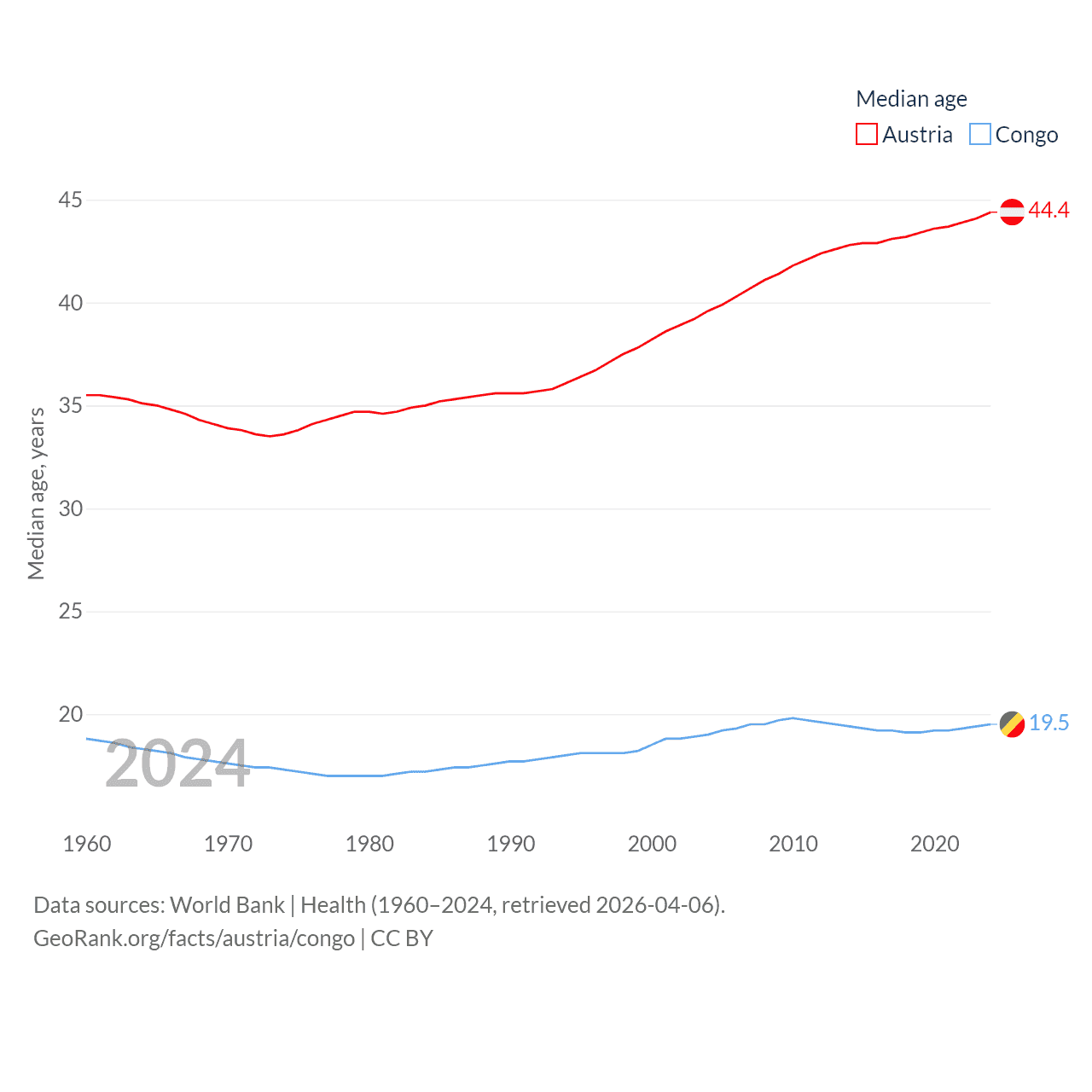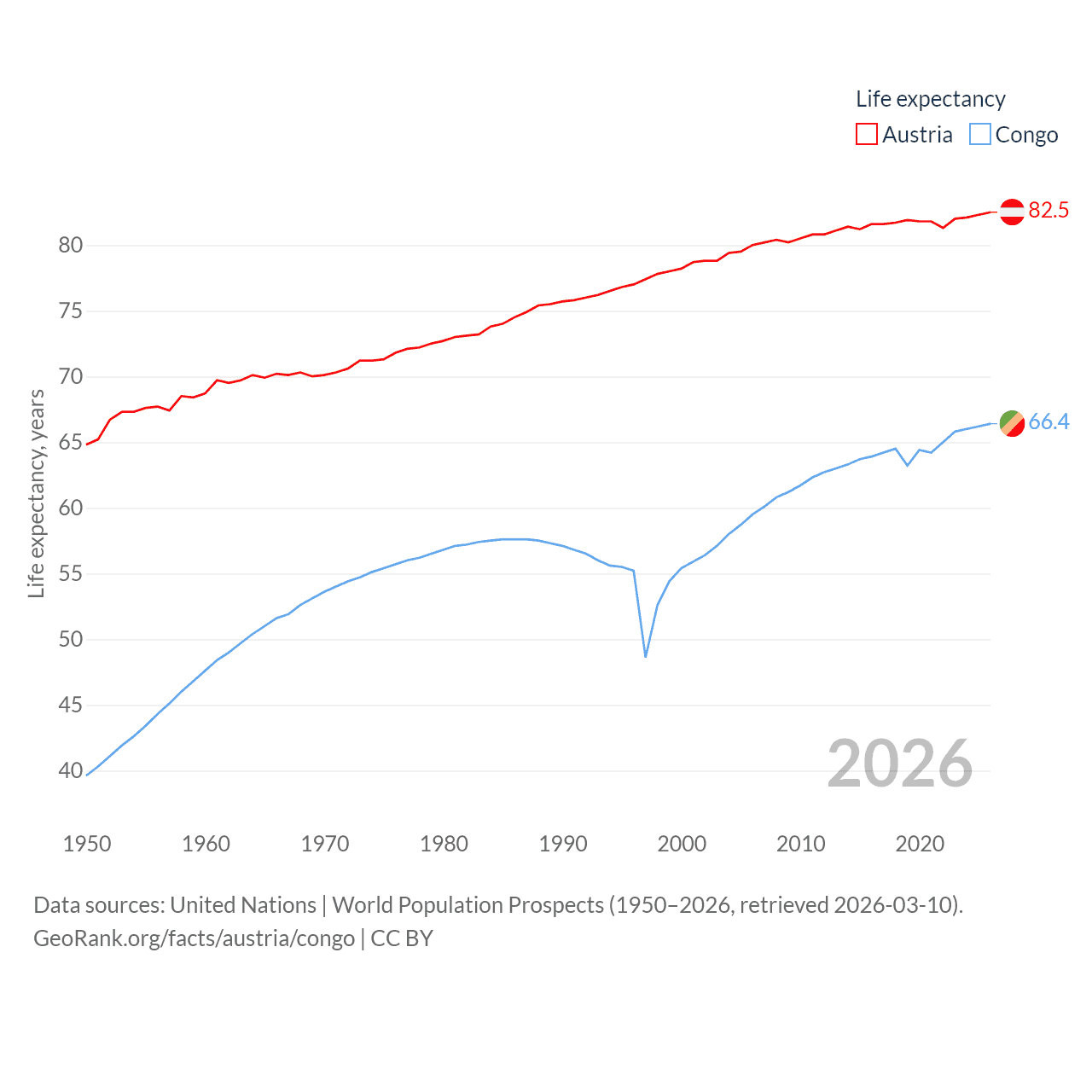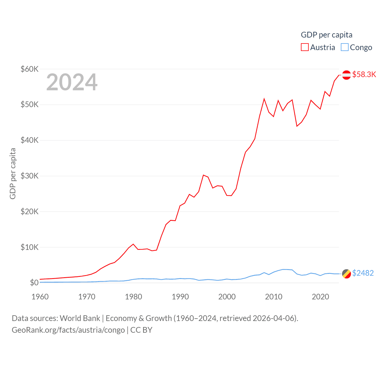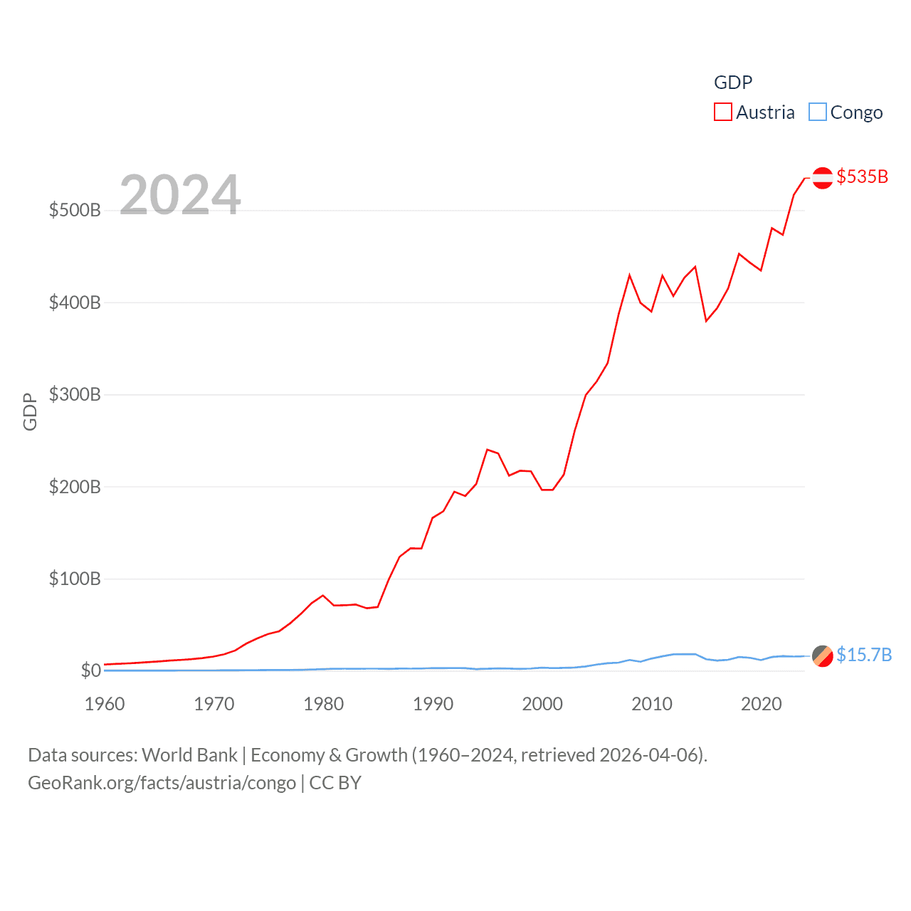 By GDP, Austria ranks 30/197 ($535B) and The Congo ranks 141/197 ($15.7B). By GDP per capita, Austria ranks 16/197 ($58,269), while The Congo ranks 149/197 ($2,482).
