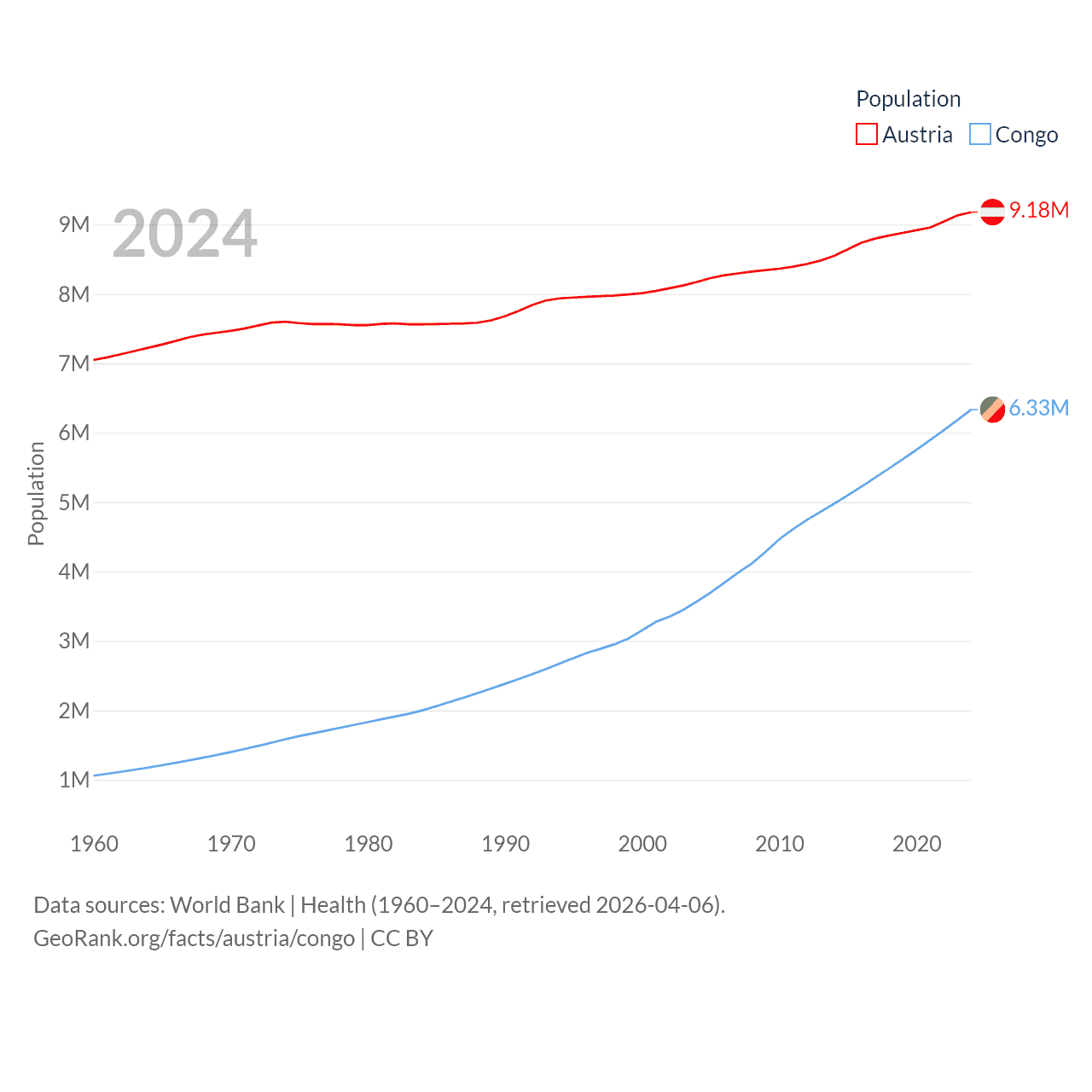 Austria has a population of 9.18M (ranked 99/197), compared with 6.33M in The Congo (ranked 112/197). Austria's land area is 31,861 sq mi versus 131,854 sq mi for The Congo (ranked 113th vs. 64th).