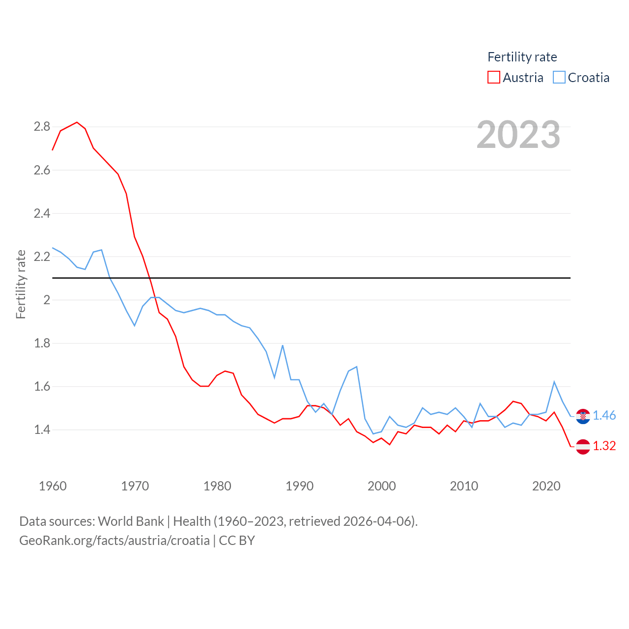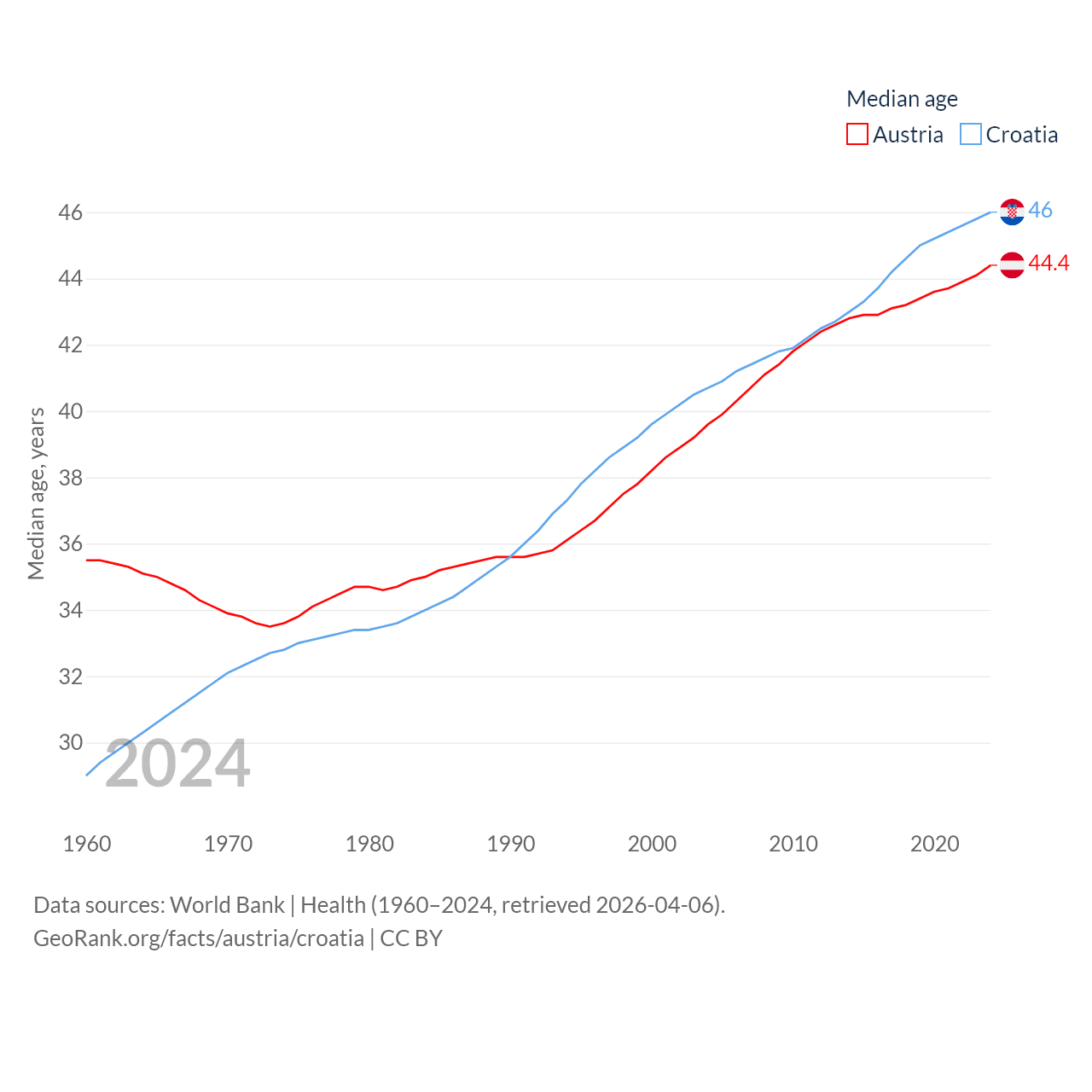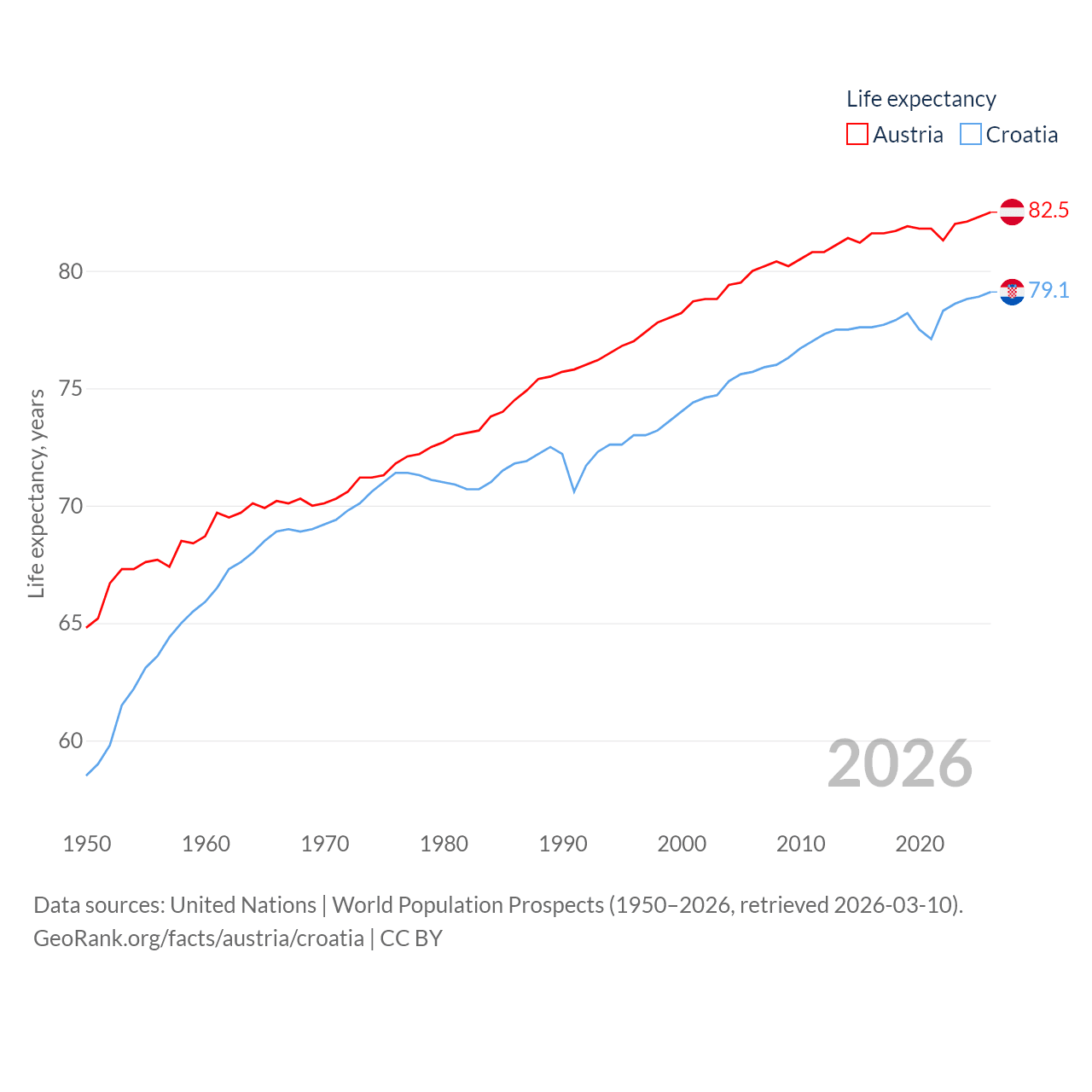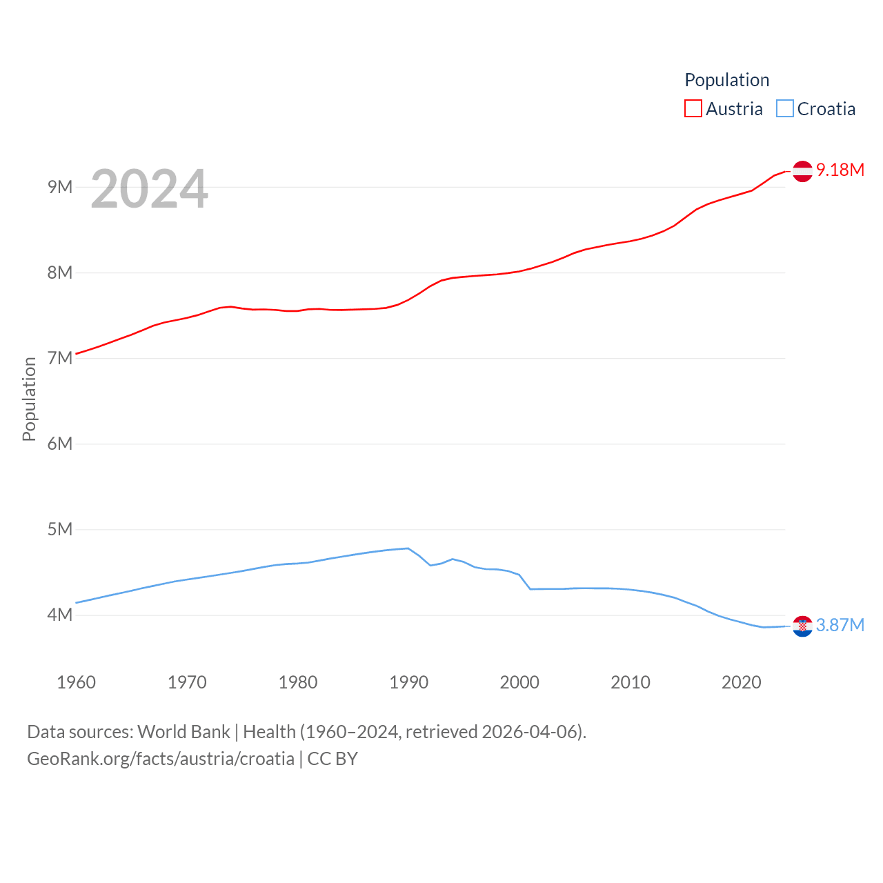 Austria has a population of 9.18M (ranked 99/197), compared with 3.87M in Croatia (ranked 129/197). Austria's land area is 31,861 sq mi versus 21,606 sq mi for Croatia (ranked 113th vs. 123rd).