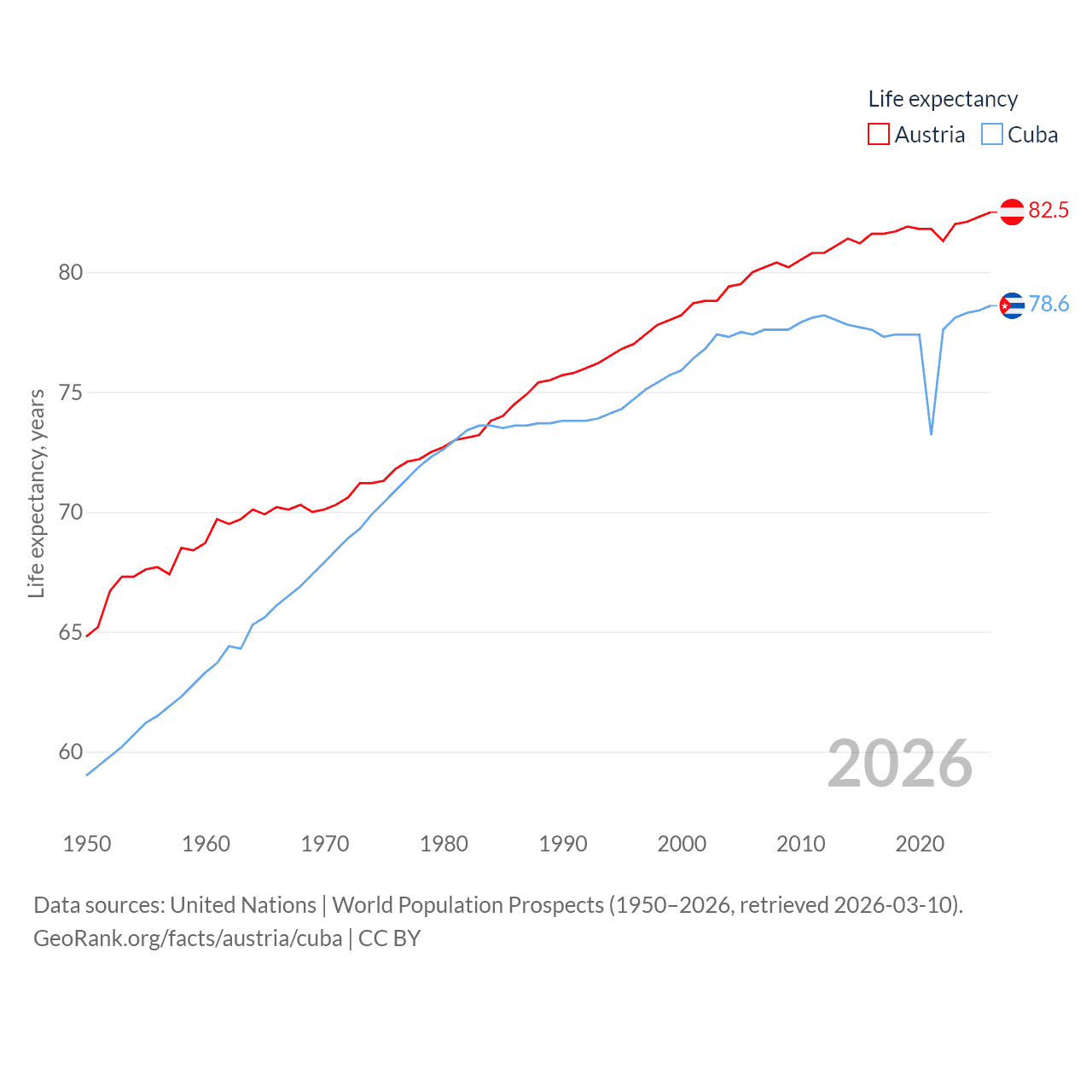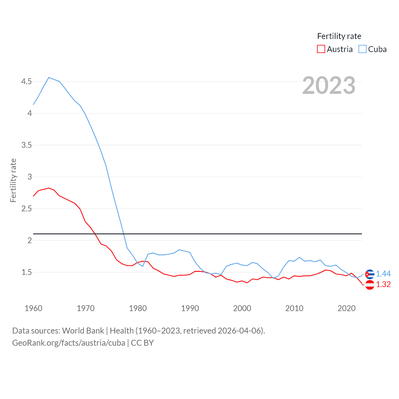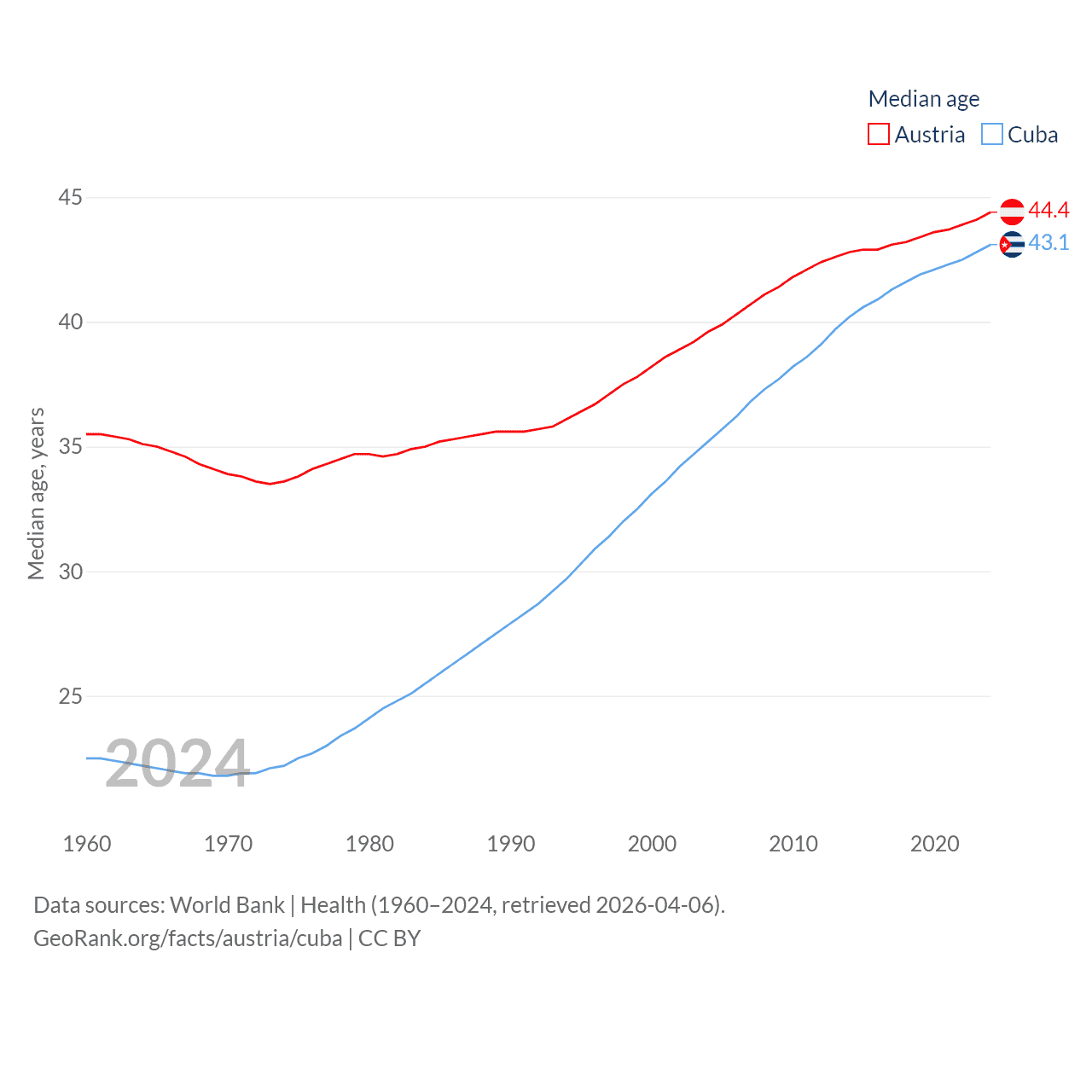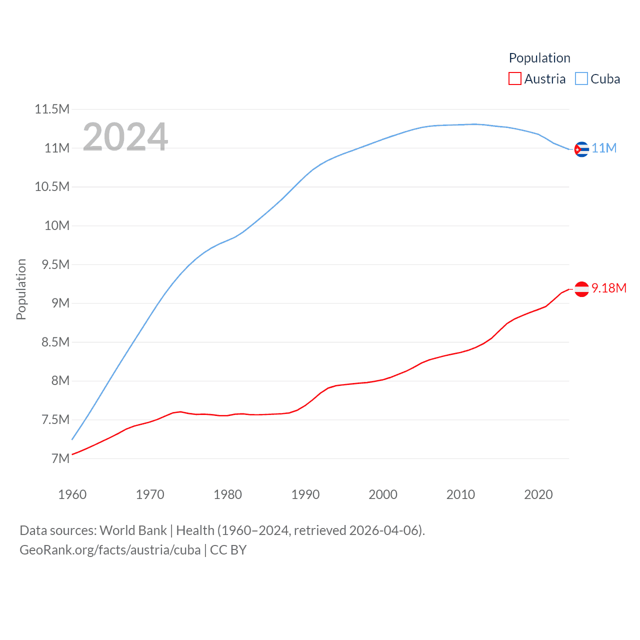 Austria has a population of 9.18M (ranked 99/197), compared with 11M in Cuba (ranked 87/197). Austria's land area is 31,861 sq mi versus 40,077 sq mi for Cuba (ranked 113th vs. 103rd).