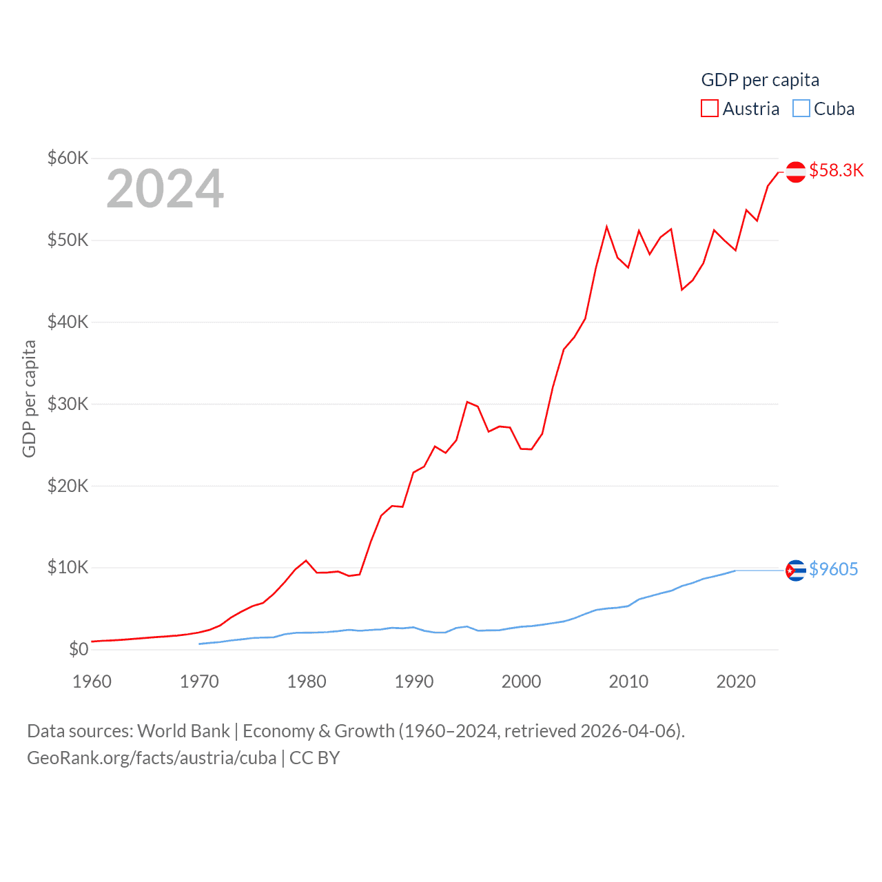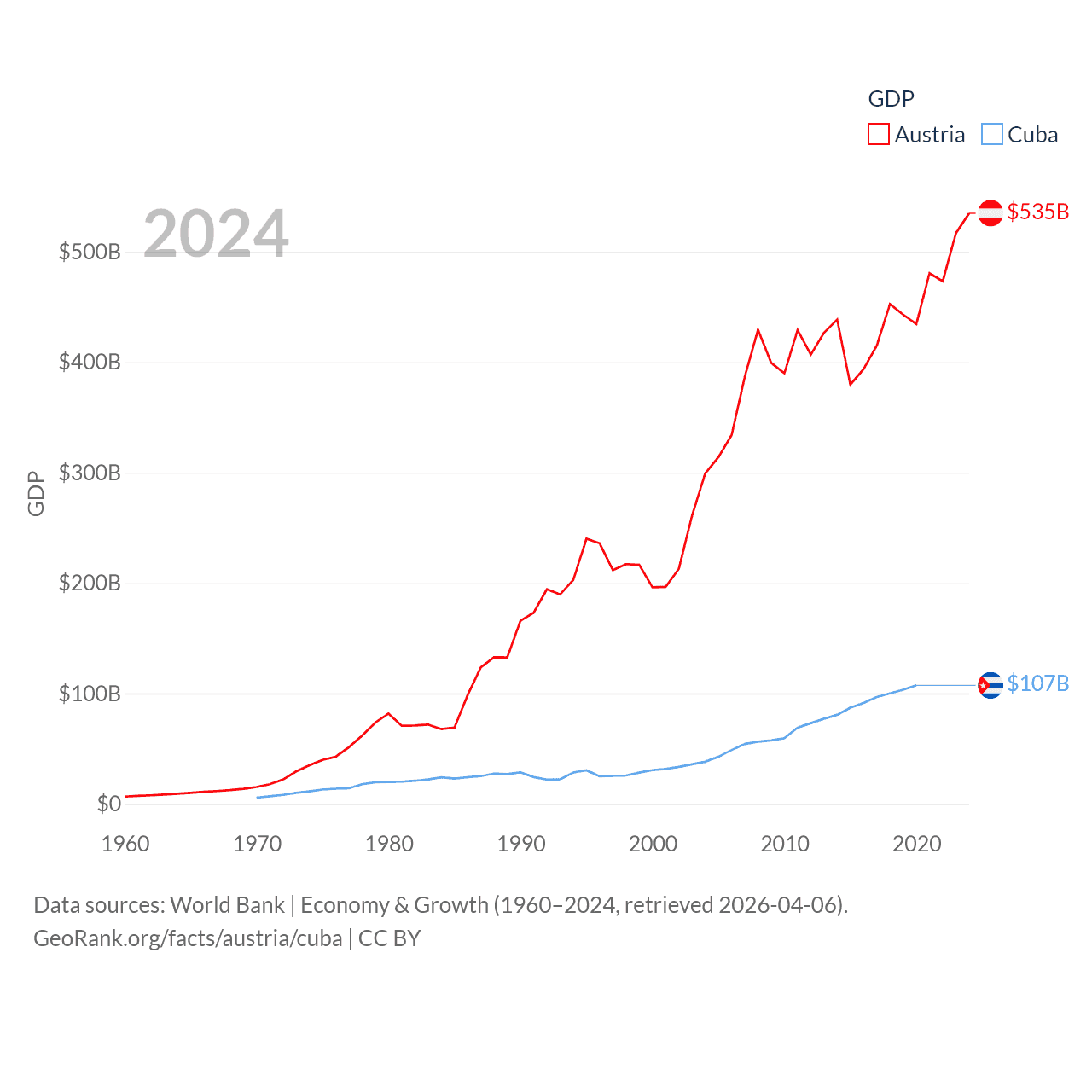 By GDP, Austria ranks 30/197 ($535B) and Cuba ranks 69/197 ($107B). By GDP per capita, Austria ranks 16/197 ($58,269), while Cuba ranks 86/197 ($9,605).