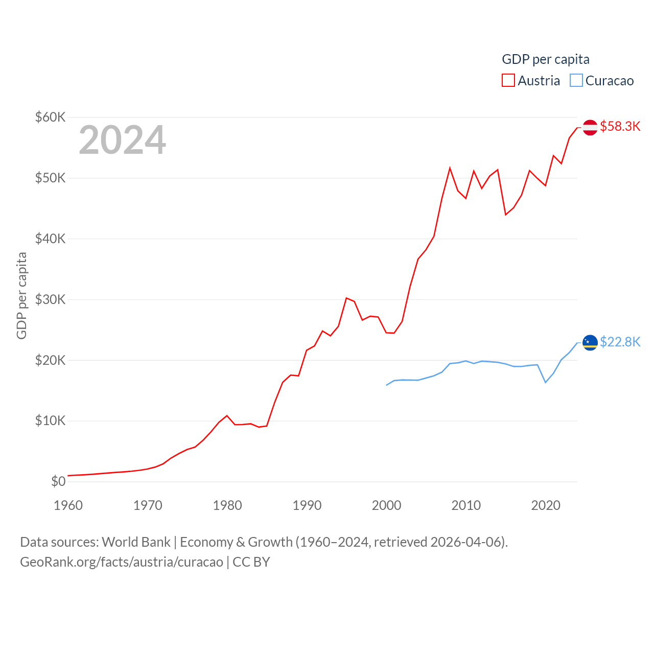 By GDP, Austria ranks 30/197 ($535B) and Curacao ranks 167/197 ($3.56B). By GDP per capita, Austria ranks 16/197 ($58,269), while Curacao ranks 56/197 ($22,833).