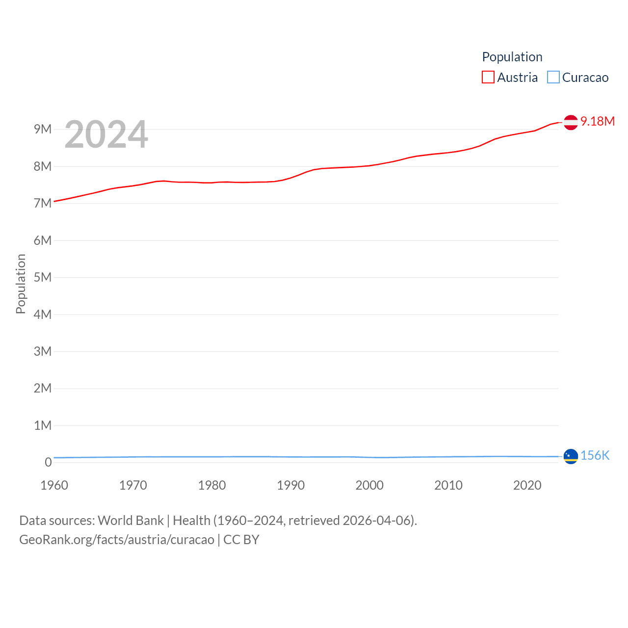 Austria has a population of 9.18M (ranked 99/197), compared with 156K in Curacao (ranked 179/197). Austria's land area is 31,861 sq mi versus 171.4 sq mi for Curacao (ranked 113th vs. 182nd).