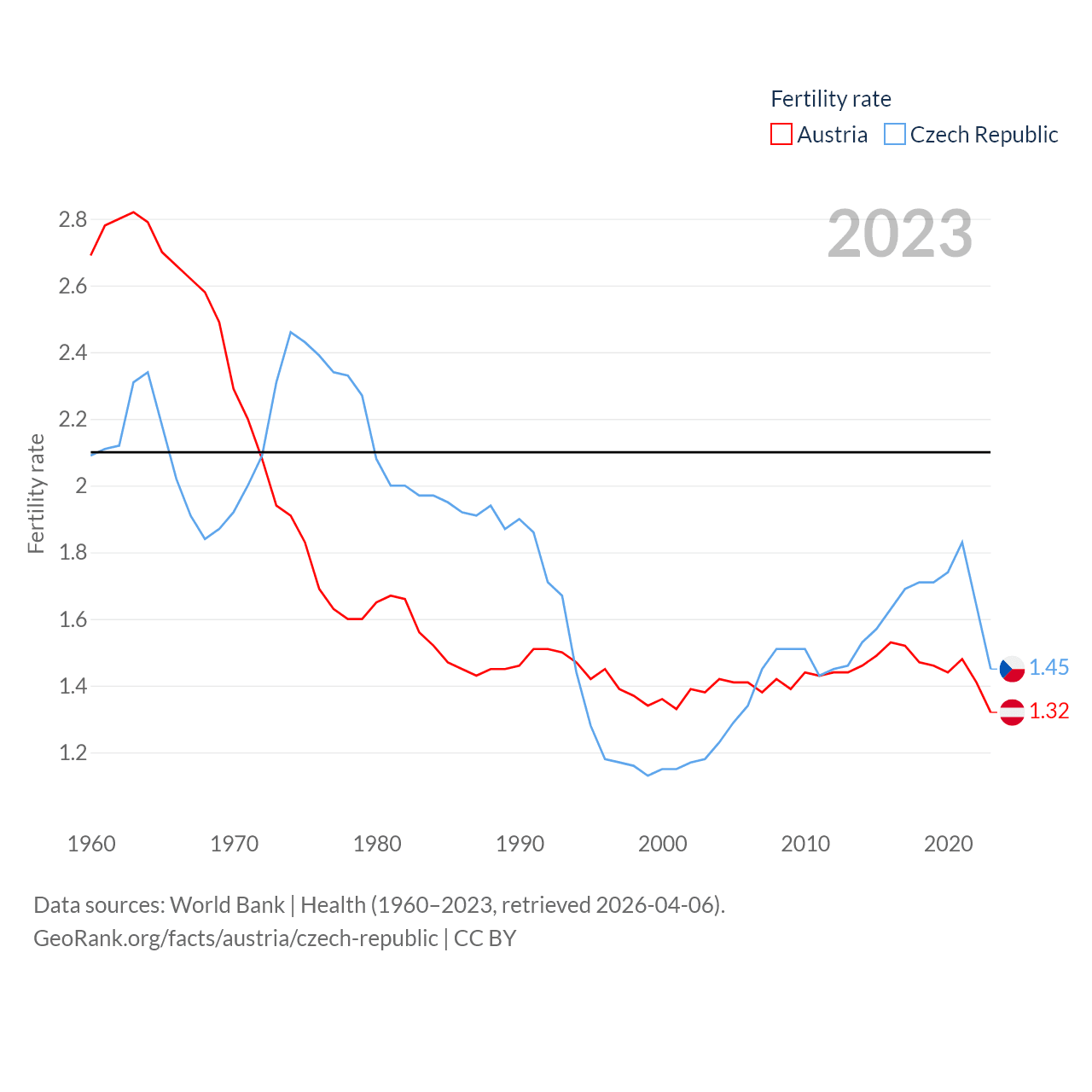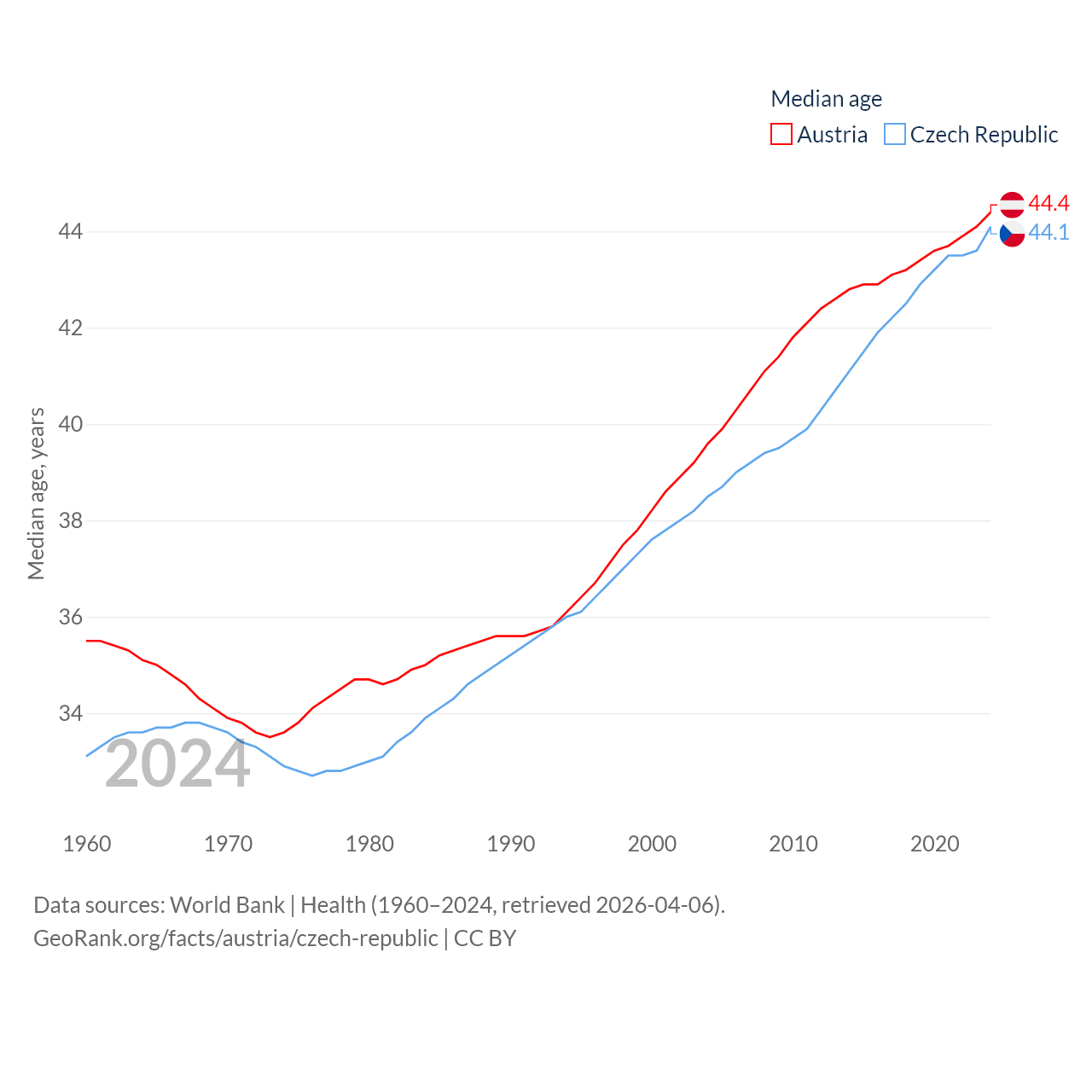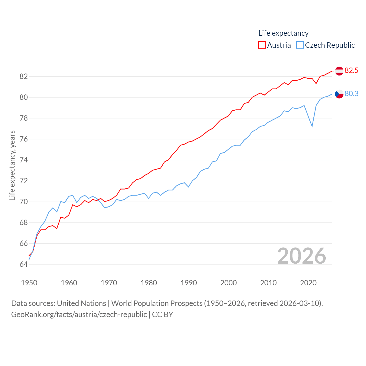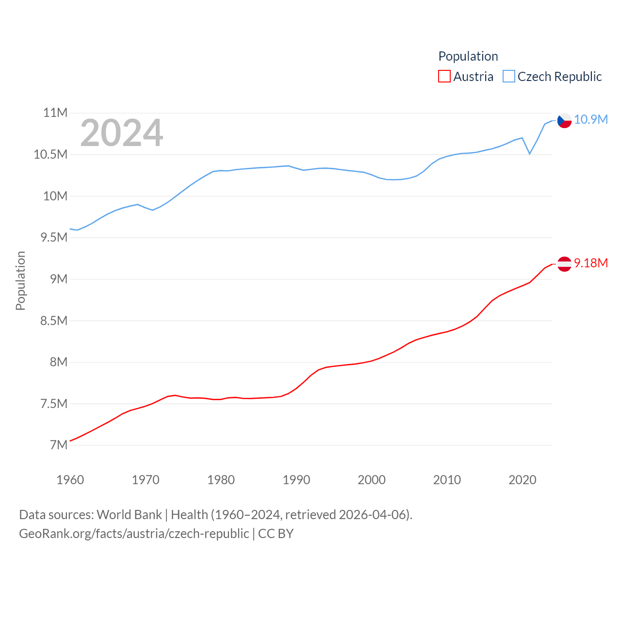 Austria has a population of 9.18M (ranked 99/197), compared with 10.9M in The Czech Republic (ranked 88/197). Austria's land area is 31,861 sq mi versus 29,794 sq mi for The Czech Republic (ranked 113th vs. 114th).
