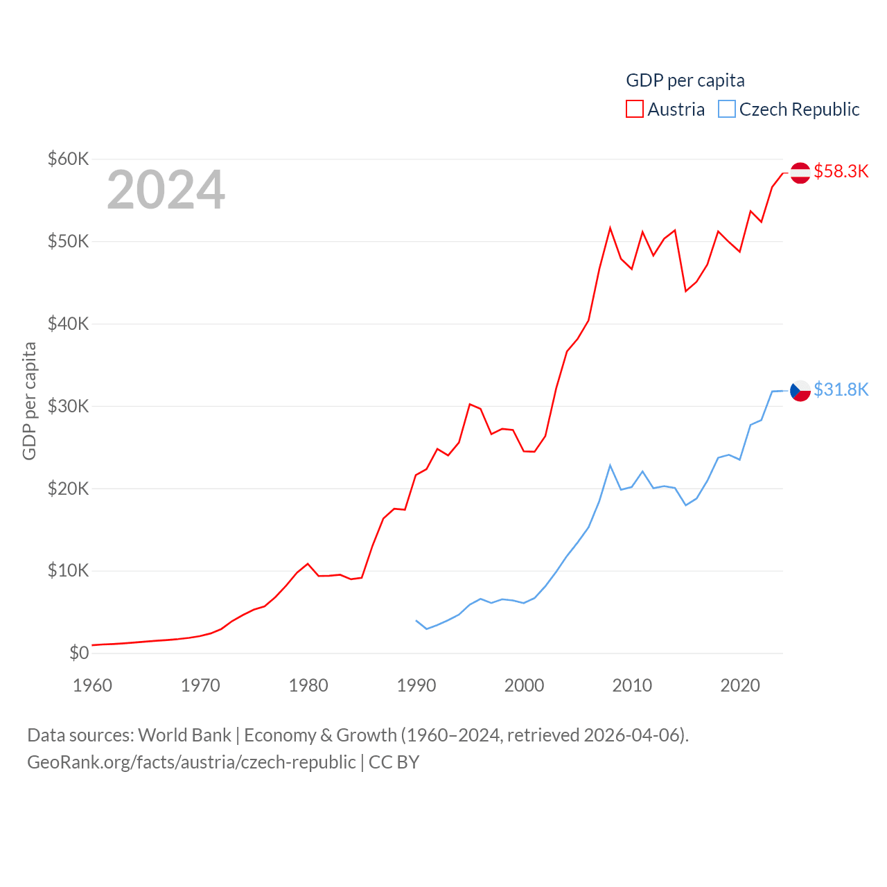 By GDP, Austria ranks 30/197 ($535B) and The Czech Republic ranks 44/197 ($347B). By GDP per capita, Austria ranks 16/197 ($58,269), while The Czech Republic ranks 39/197 ($31,823).