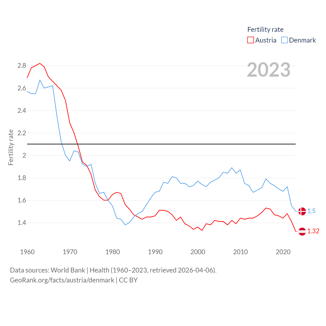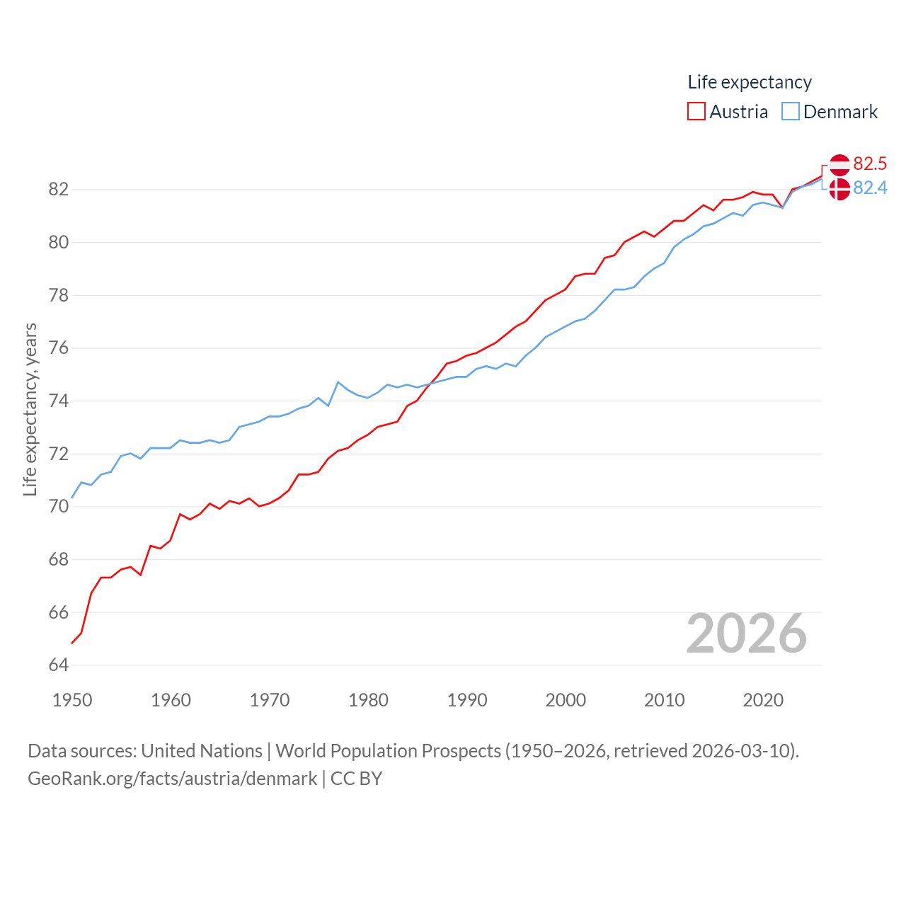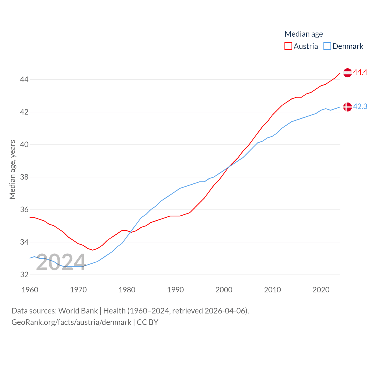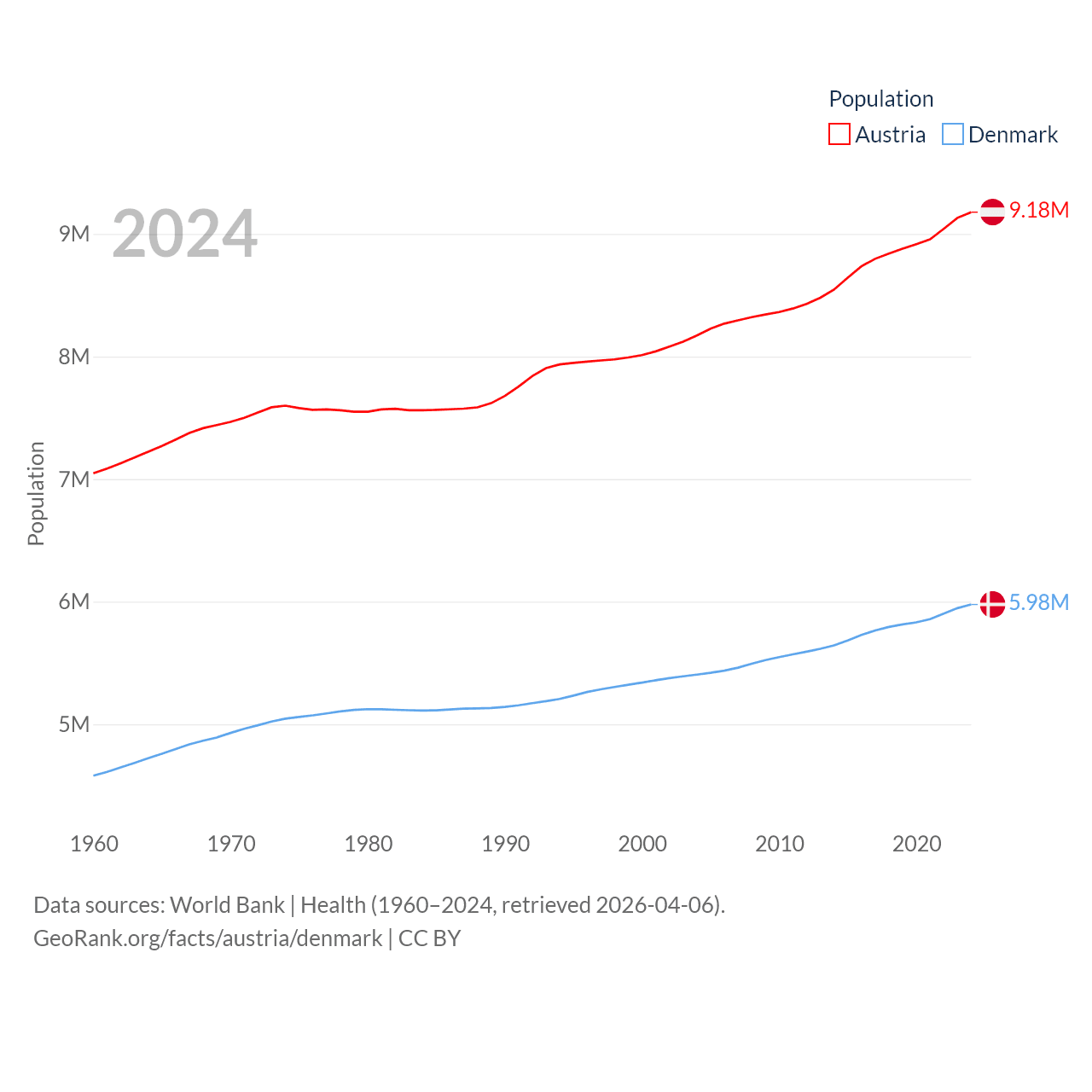 Austria has a population of 9.18M (ranked 99/197), compared with 5.98M in Denmark (ranked 114/197). Austria's land area is 31,861 sq mi versus 15,444 sq mi for Denmark (ranked 113th vs. 130th).
