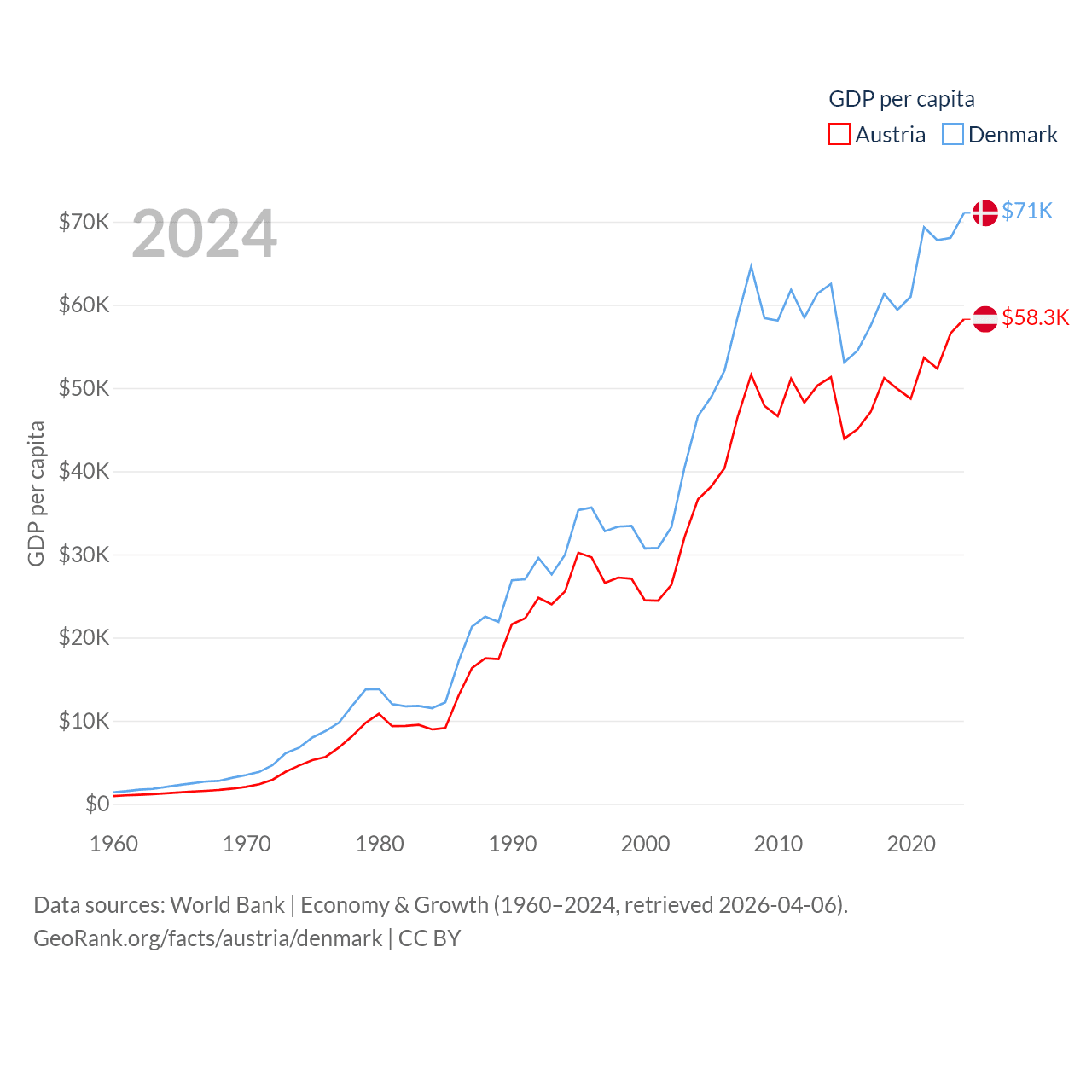 By GDP, Austria ranks 30/197 ($535B) and Denmark ranks 37/197 ($425B). By GDP per capita, Austria ranks 16/197 ($58,269), while Denmark ranks 12/197 ($71,026).