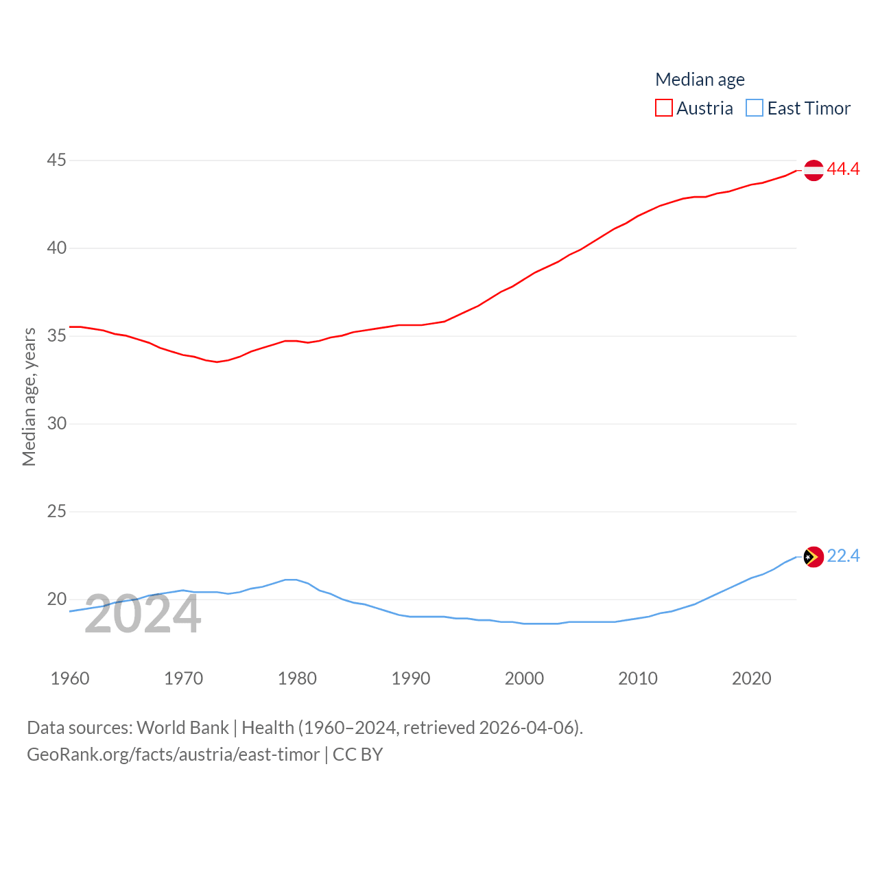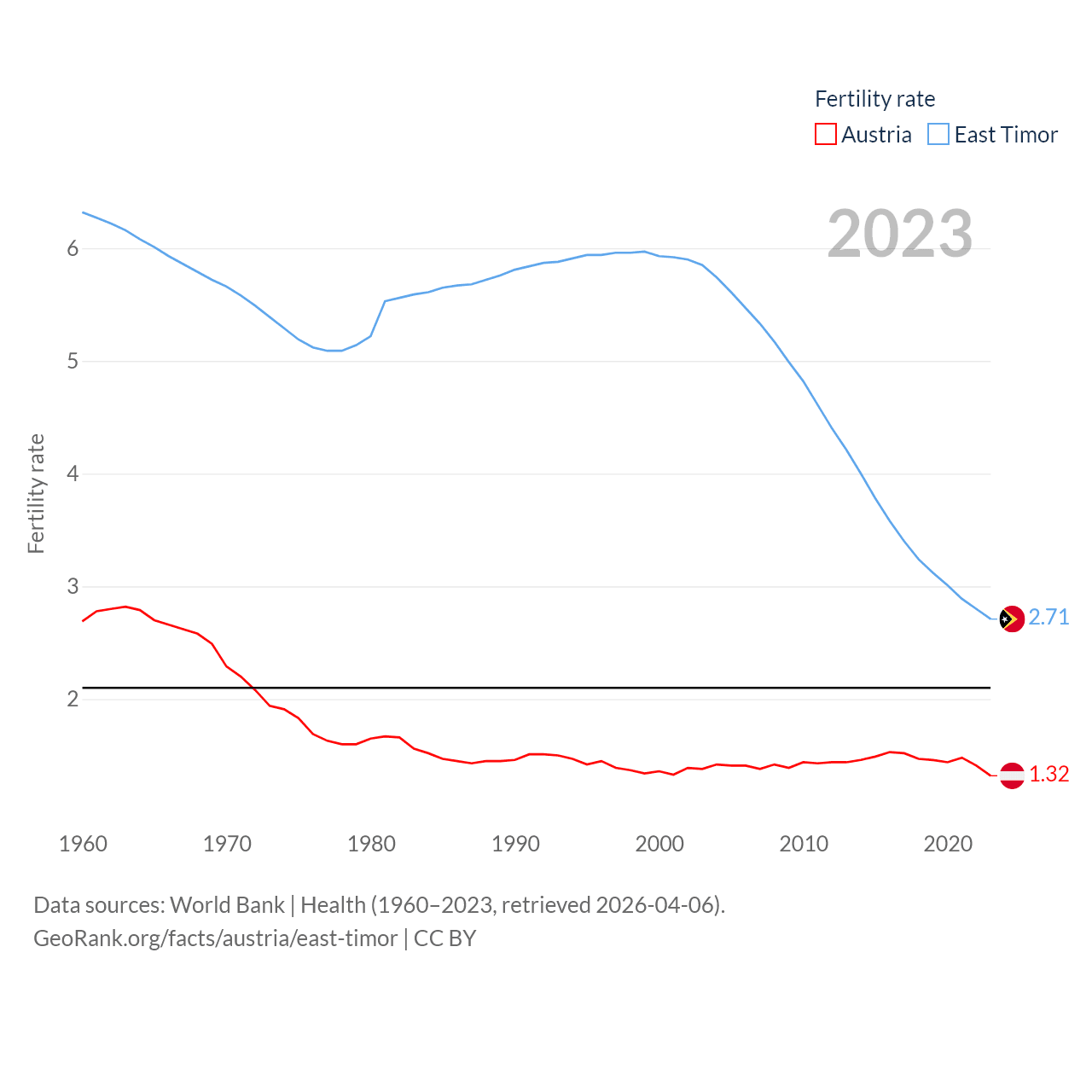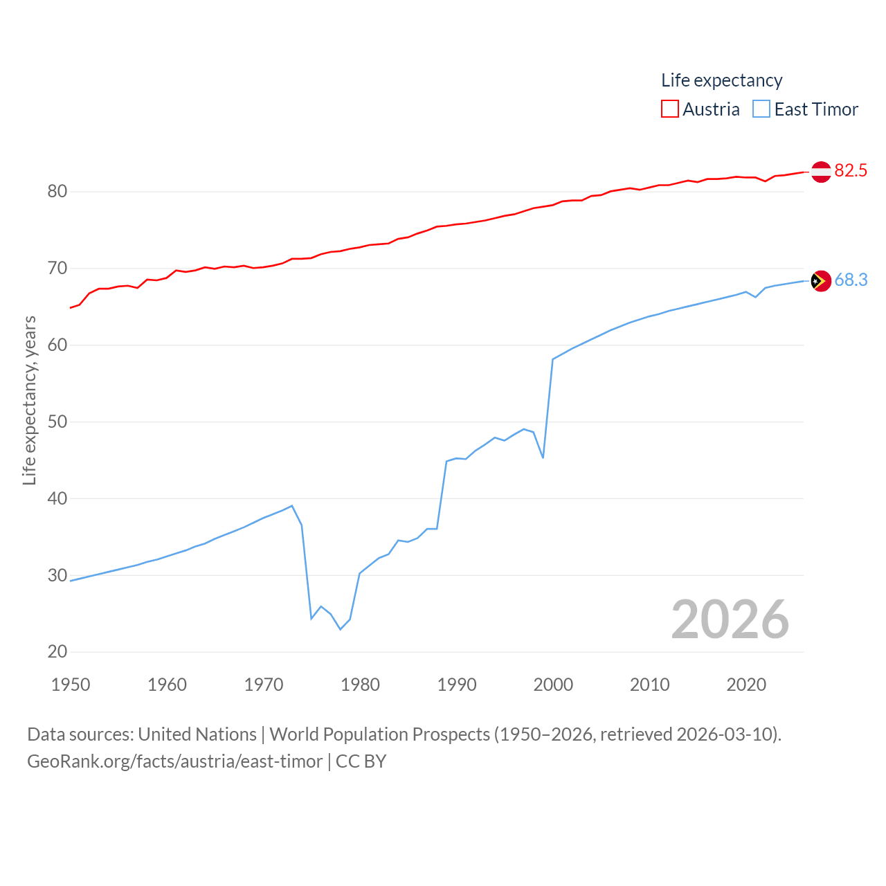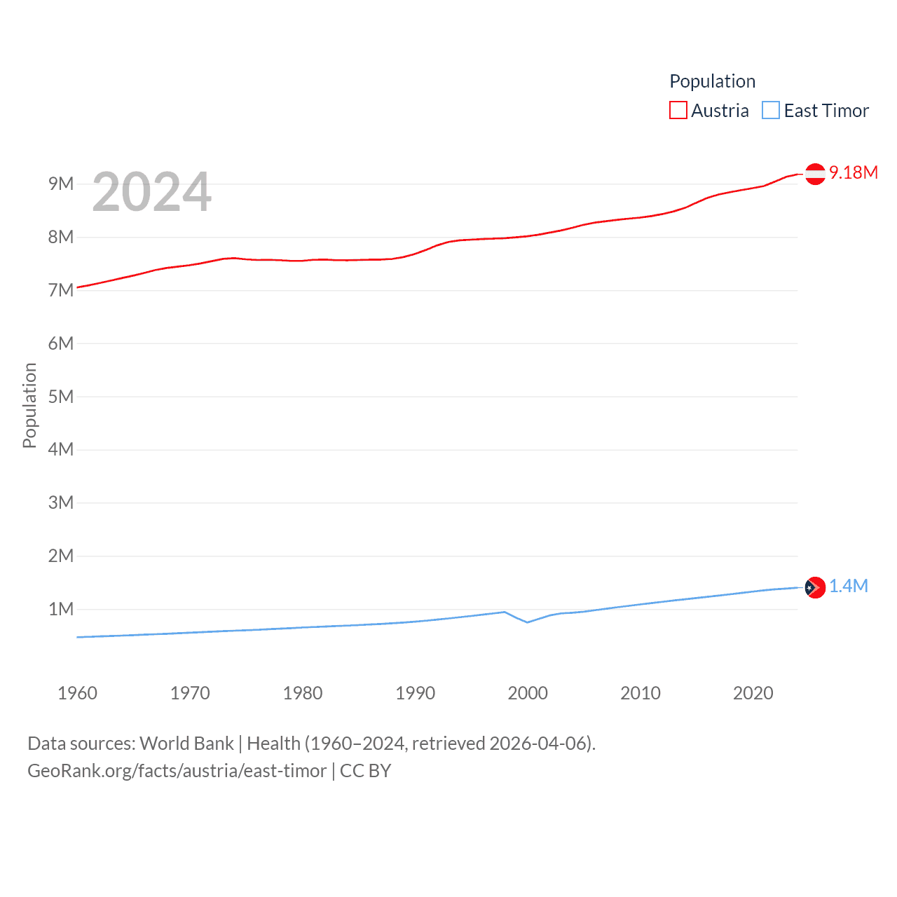 Austria has a population of 9.18M (ranked 99/197), compared with 1.4M in East Timor (ranked 152/197). Austria's land area is 31,861 sq mi versus 5,741 sq mi for East Timor (ranked 113th vs. 155th).
