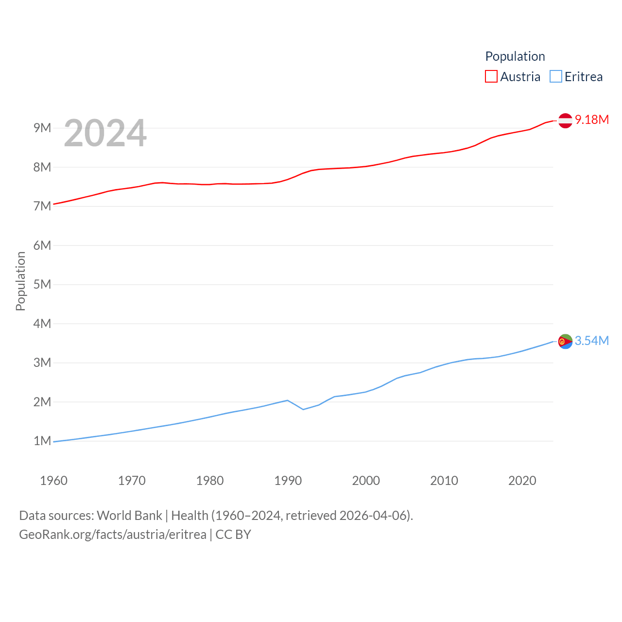 Austria has a population of 9.18M (ranked 99/197), compared with 3.54M in Eritrea (ranked 131/197). Austria's land area is 31,861 sq mi versus 46,787 sq mi for Eritrea (ranked 113th vs. 96th).