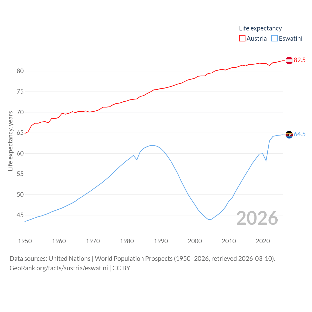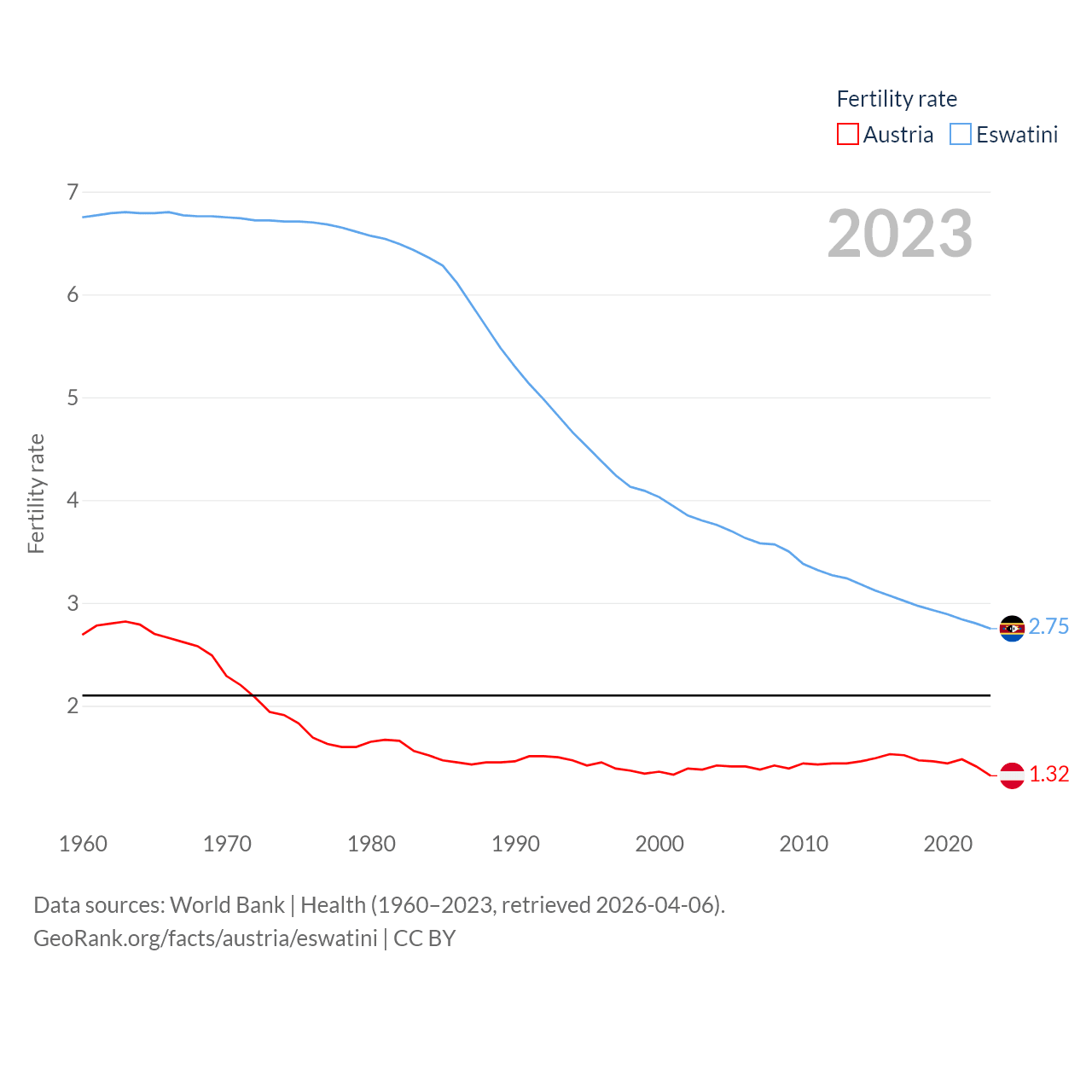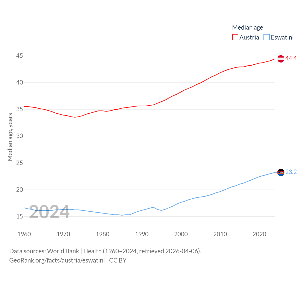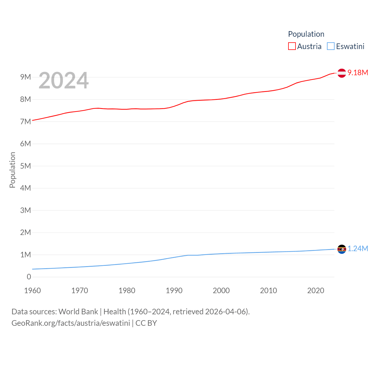Austria has a population of 9.18M (ranked 99/197), compared with 1.24M in Eswatini (ranked 157/197). Austria's land area is 31,861 sq mi versus 6,641 sq mi for Eswatini (ranked 113th vs. 154th).