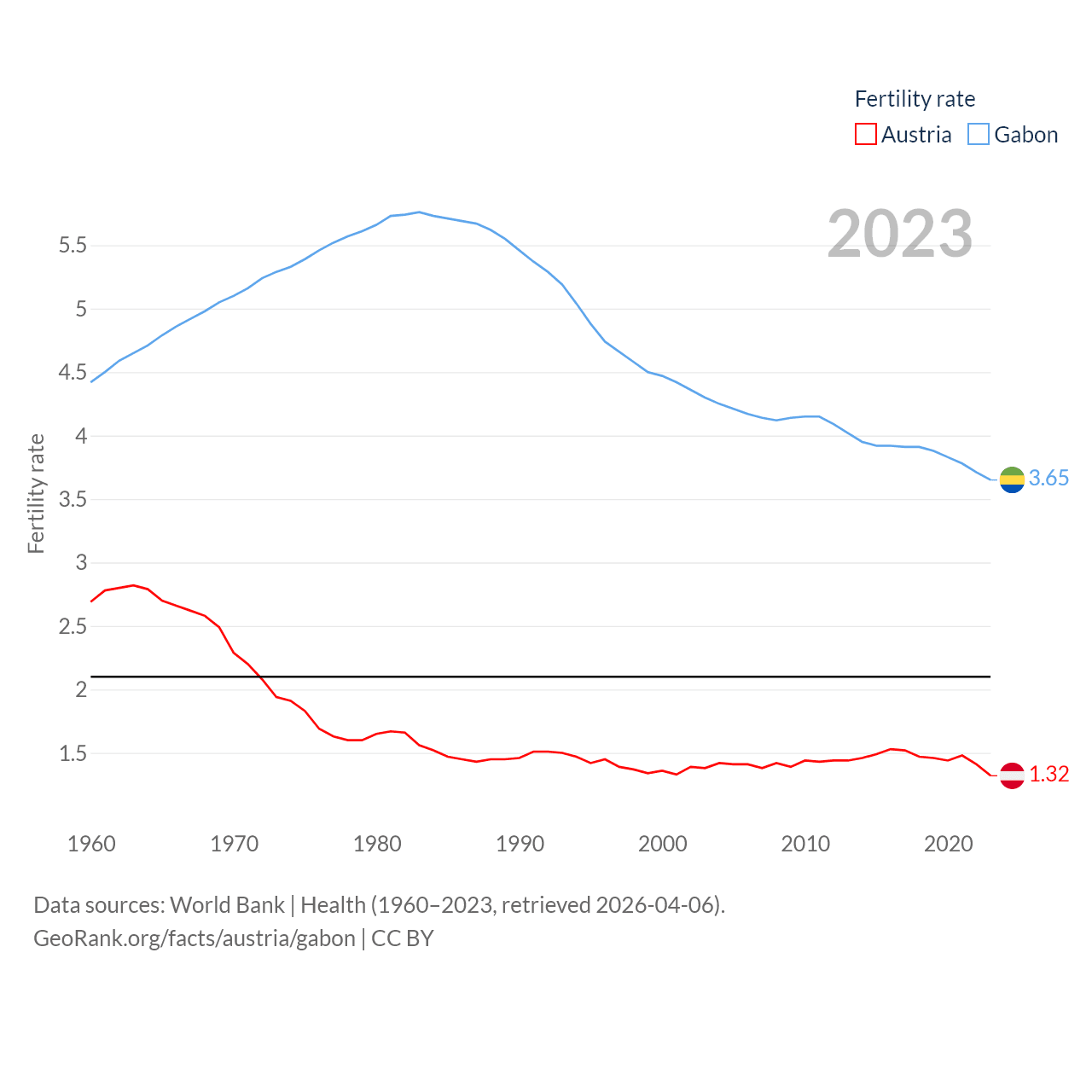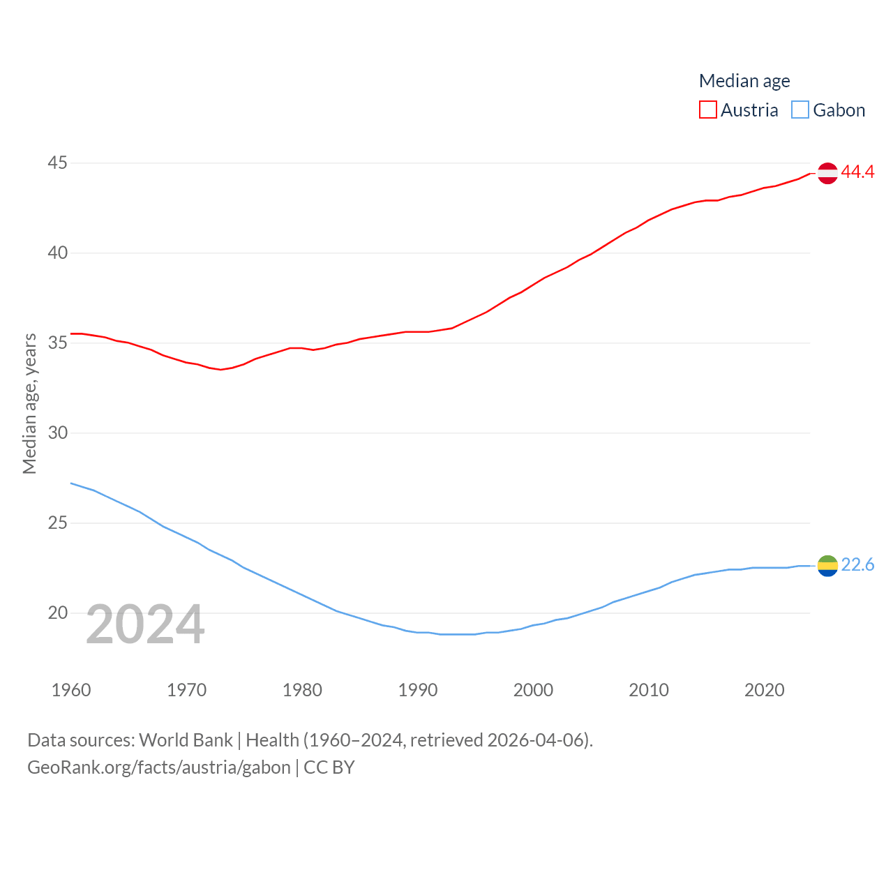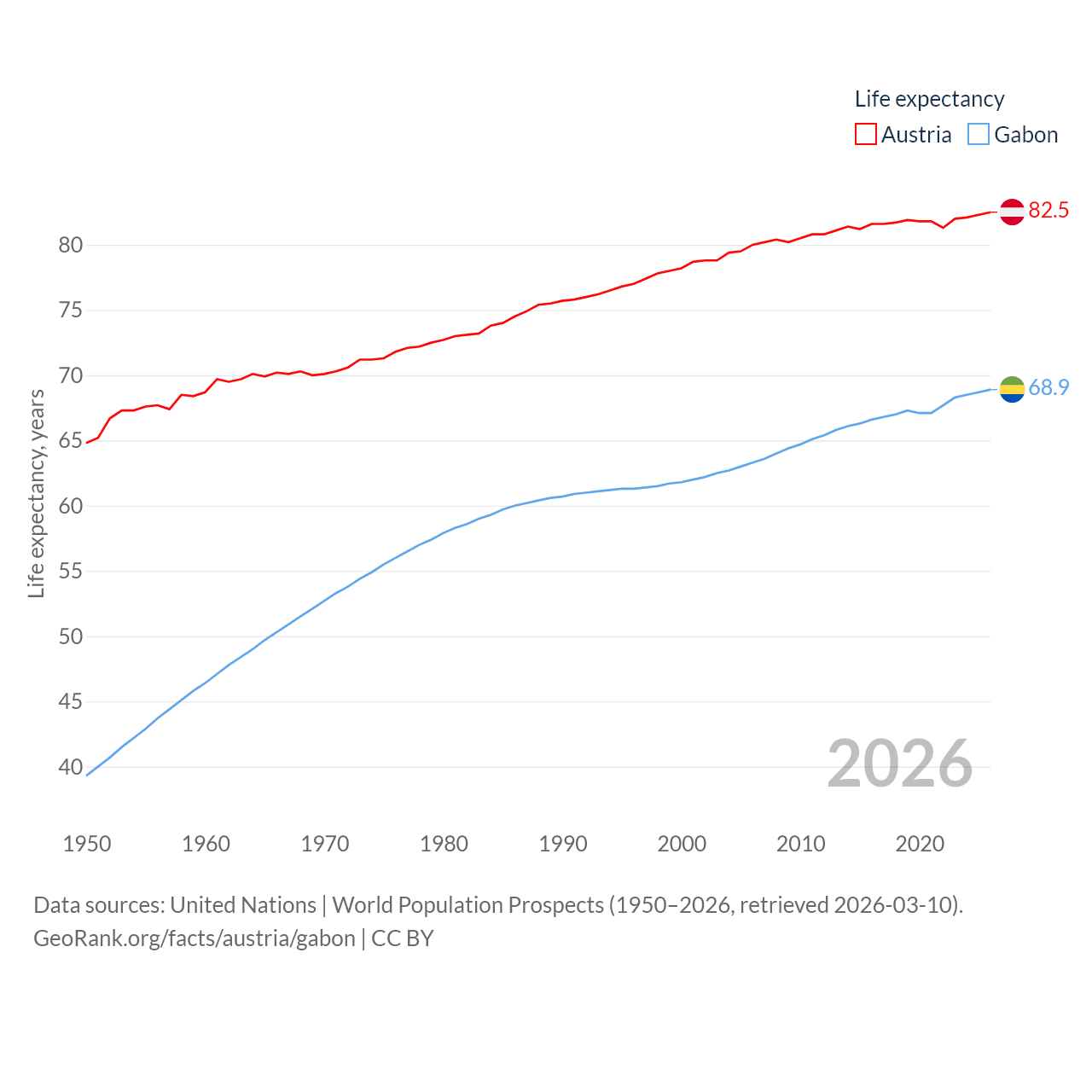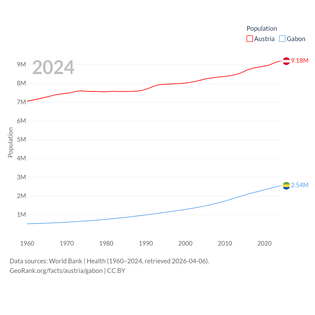 Austria has a population of 9.18M (ranked 99/197), compared with 2.54M in Gabon (ranked 141/197). Austria's land area is 31,861 sq mi versus 99,487 sq mi for Gabon (ranked 113th vs. 75th).