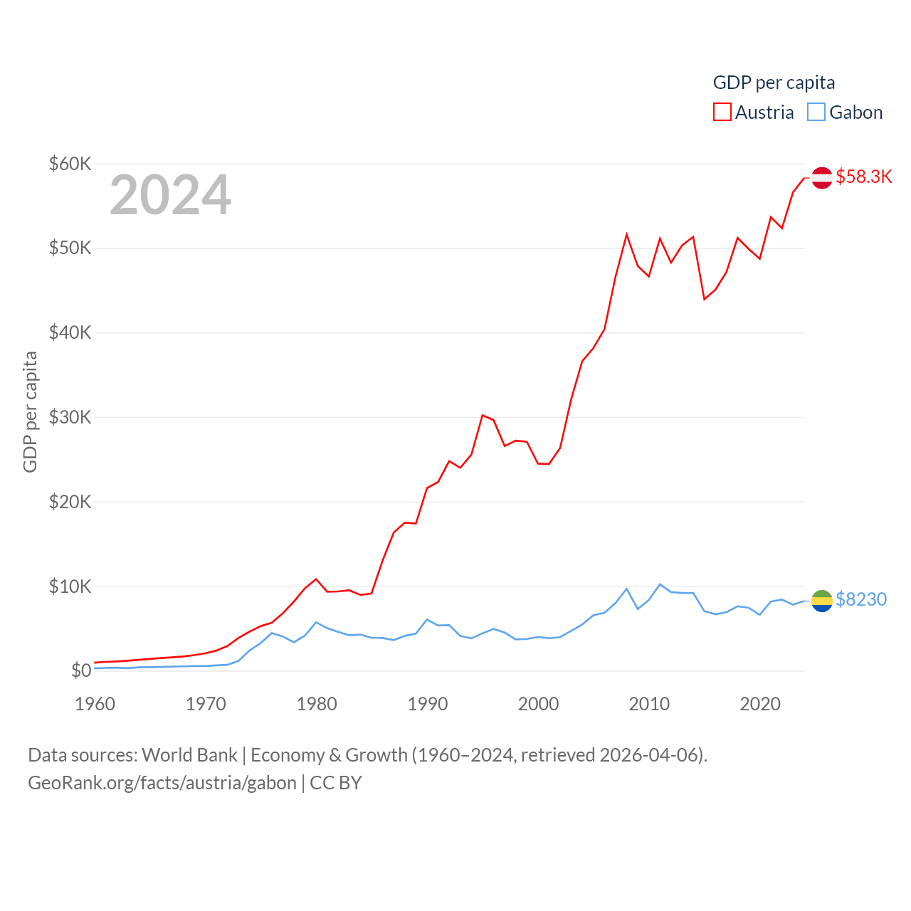 By GDP, Austria ranks 30/197 ($535B) and Gabon ranks 127/197 ($20.9B). By GDP per capita, Austria ranks 16/197 ($58,269), while Gabon ranks 93/197 ($8,230).