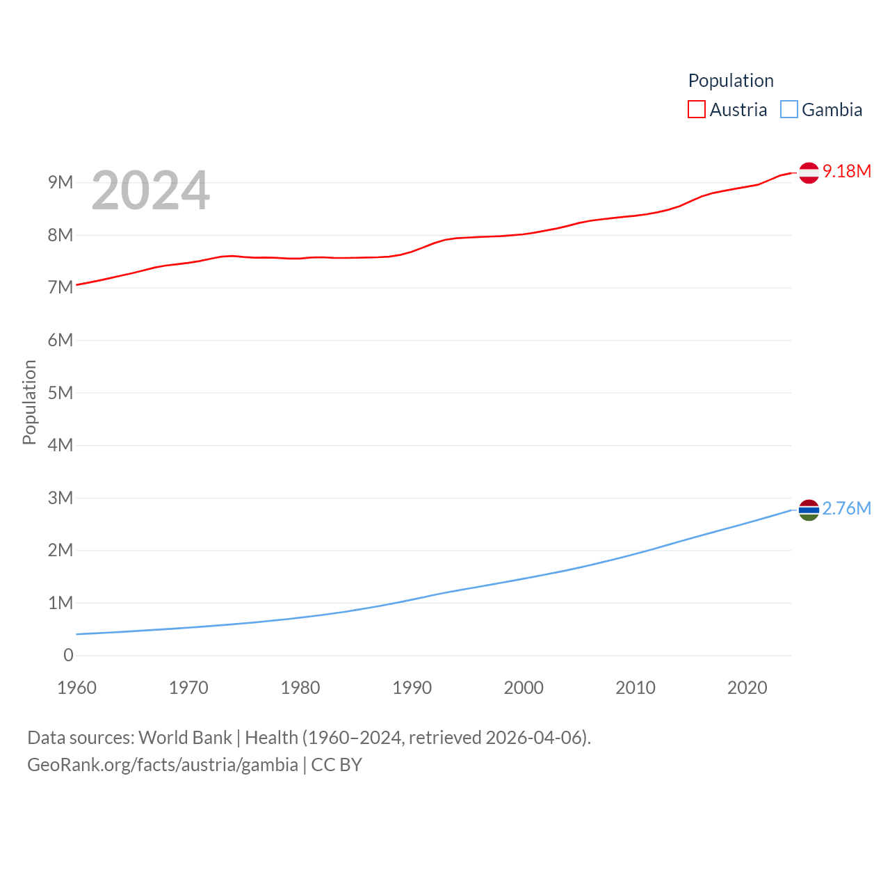 Austria has a population of 9.18M (ranked 99/197), compared with 2.76M in The Gambia (ranked 140/197). Austria's land area is 31,861 sq mi versus 3,907 sq mi for The Gambia (ranked 113th vs. 161st).