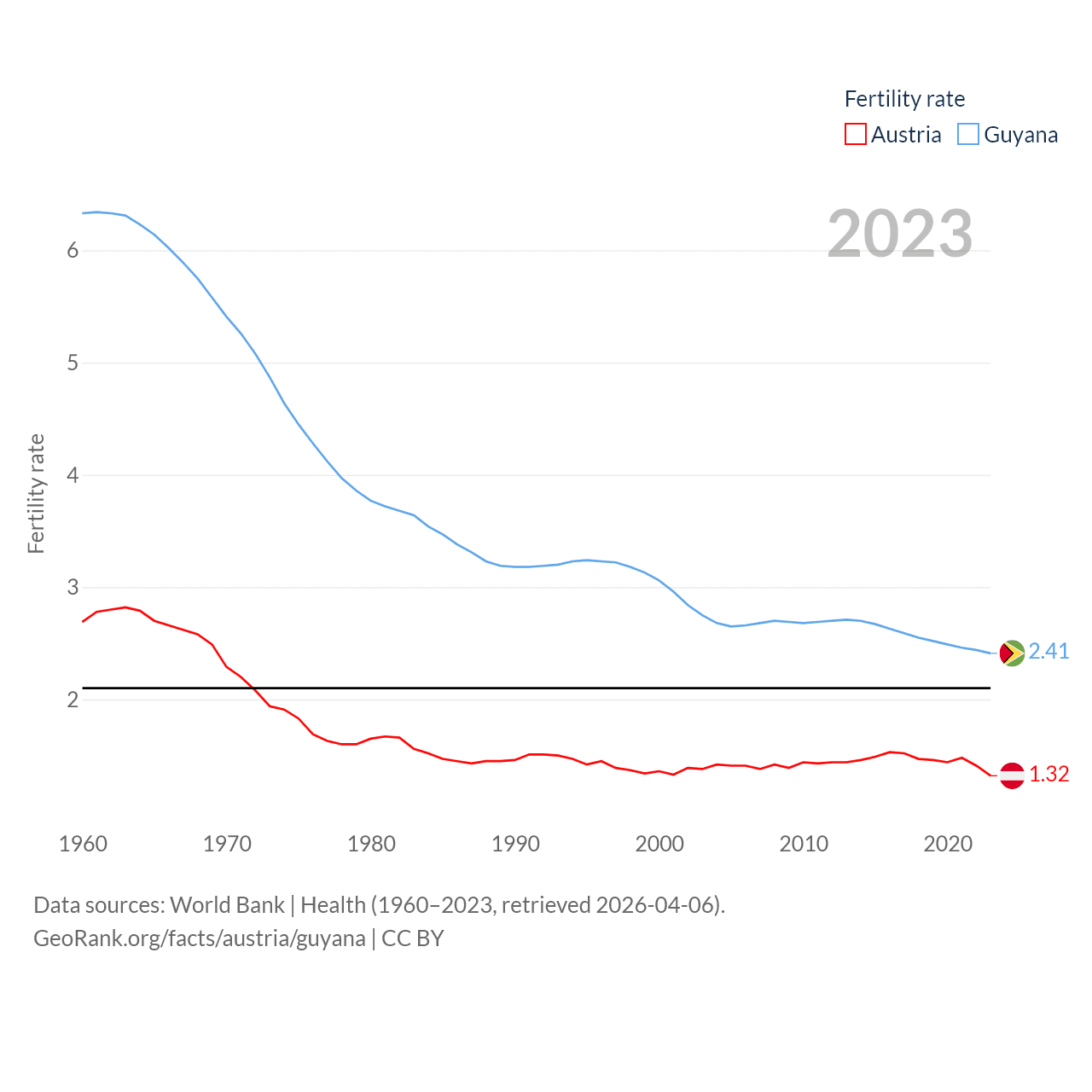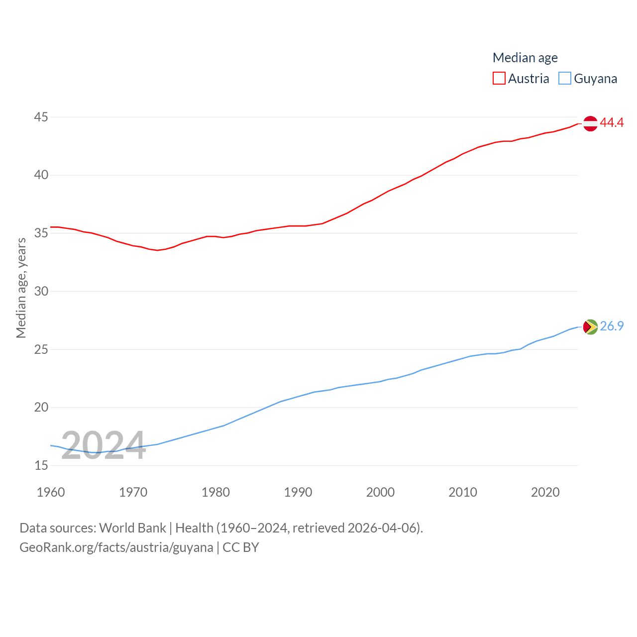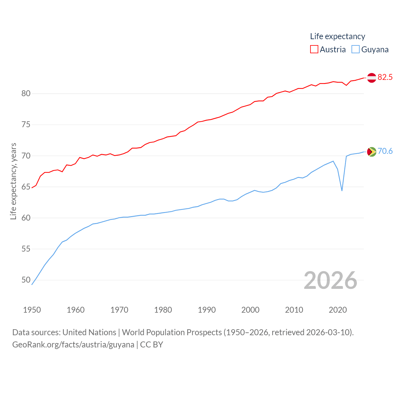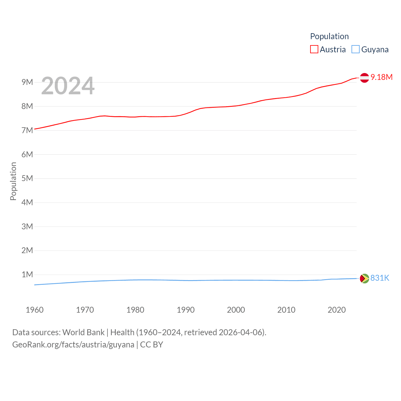Austria has a population of 9.18M (ranked 99/197), compared with 831K in Guyana (ranked 161/197). Austria's land area is 31,861 sq mi versus 81,522 sq mi for Guyana (ranked 113th vs. 82nd).