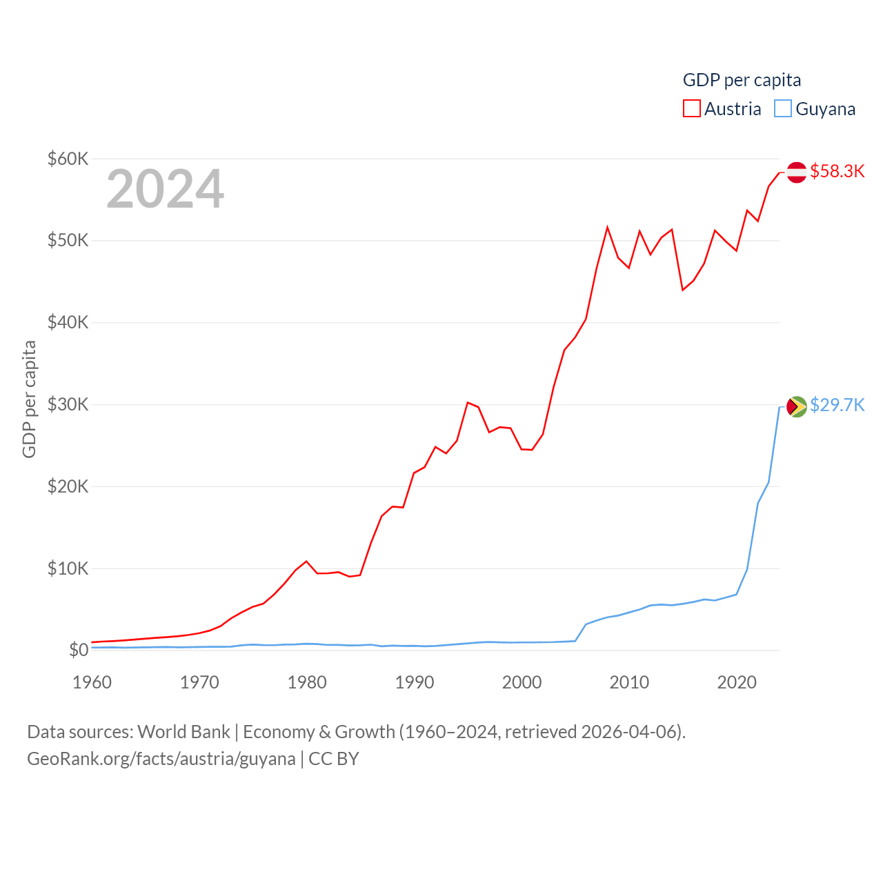 By GDP, Austria ranks 30/197 ($535B) and Guyana ranks 120/197 ($24.7B). By GDP per capita, Austria ranks 16/197 ($58,269), while Guyana ranks 41/197 ($29,675).