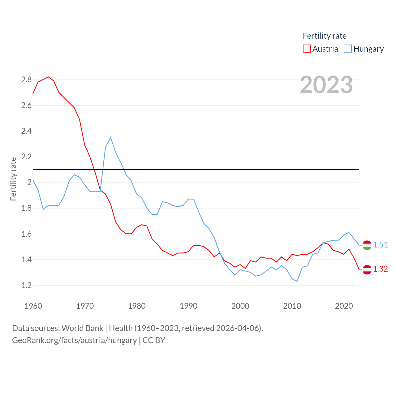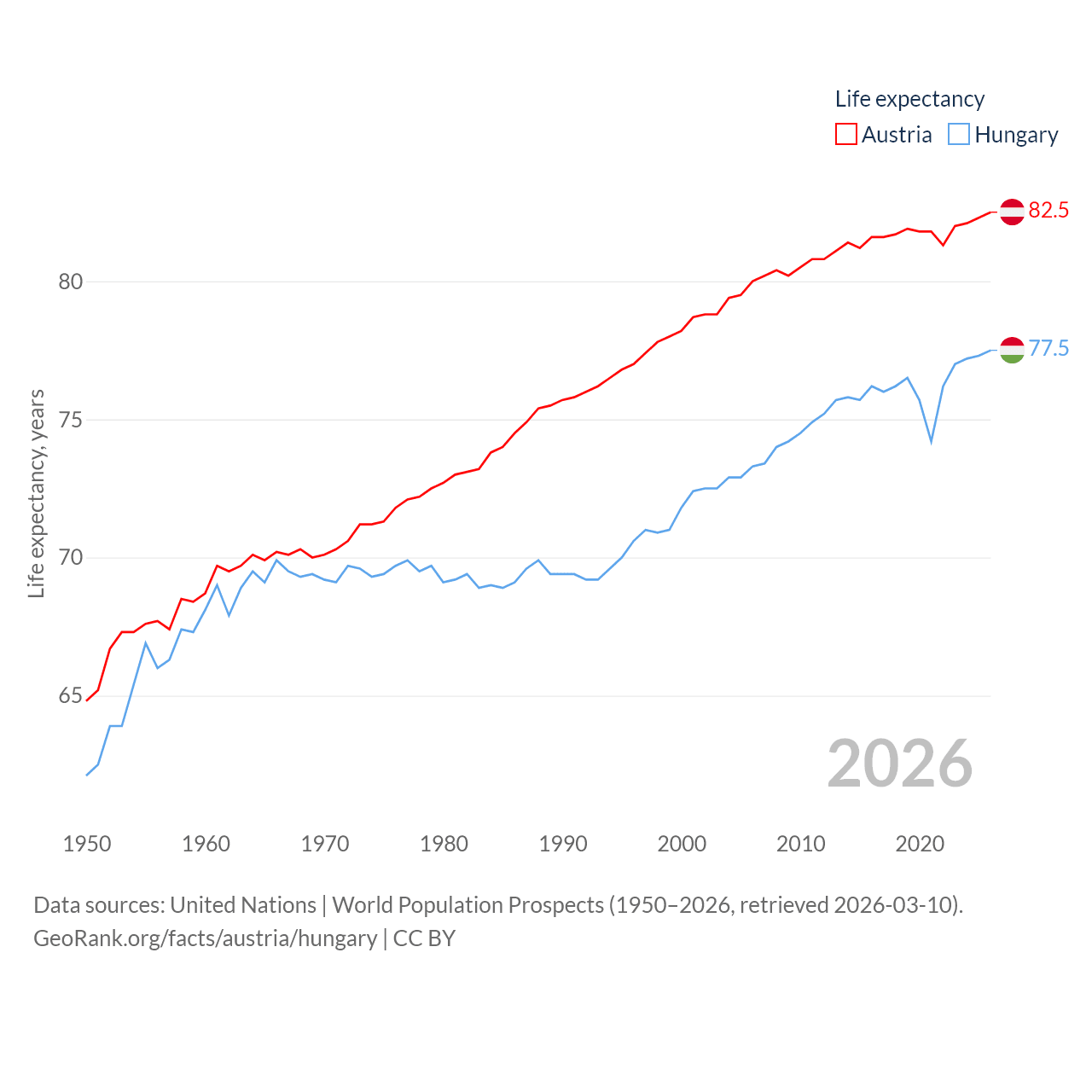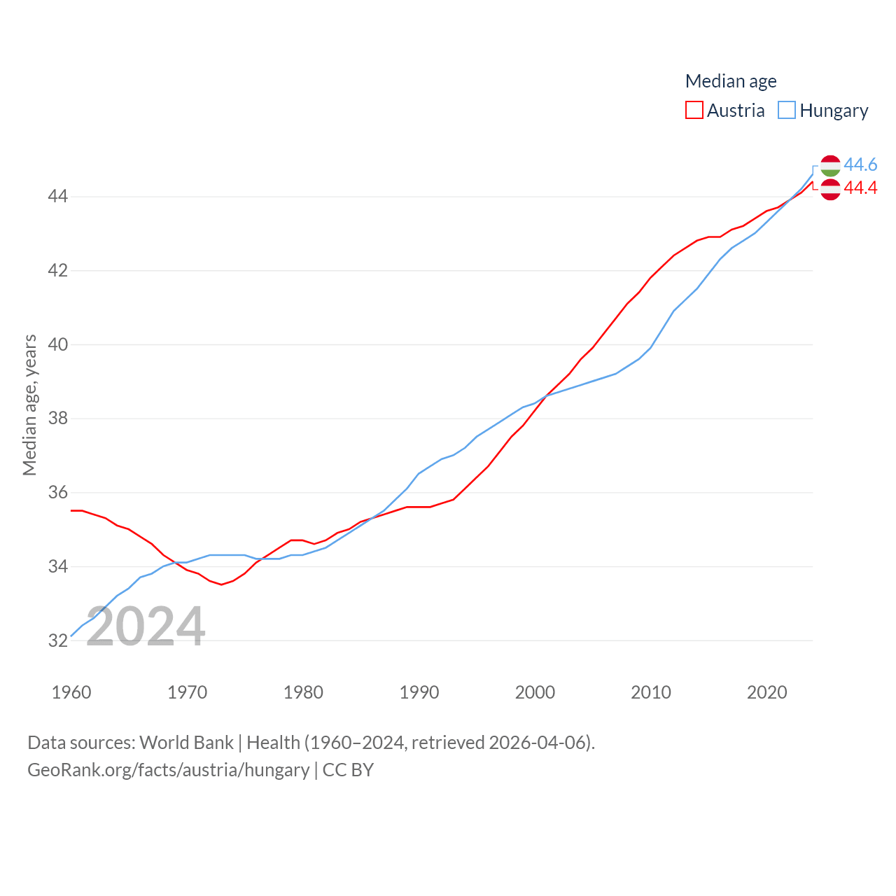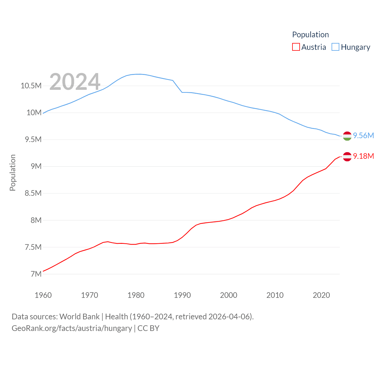 Austria has a population of 9.18M (ranked 99/197), compared with 9.56M in Hungary (ranked 97/197). Austria's land area is 31,861 sq mi versus 35,236 sq mi for Hungary (ranked 113th vs. 109th).