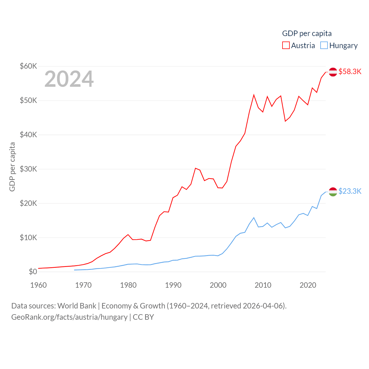 By GDP, Austria ranks 30/197 ($535B) and Hungary ranks 55/197 ($223B). By GDP per capita, Austria ranks 16/197 ($58,269), while Hungary ranks 55/197 ($23,292).