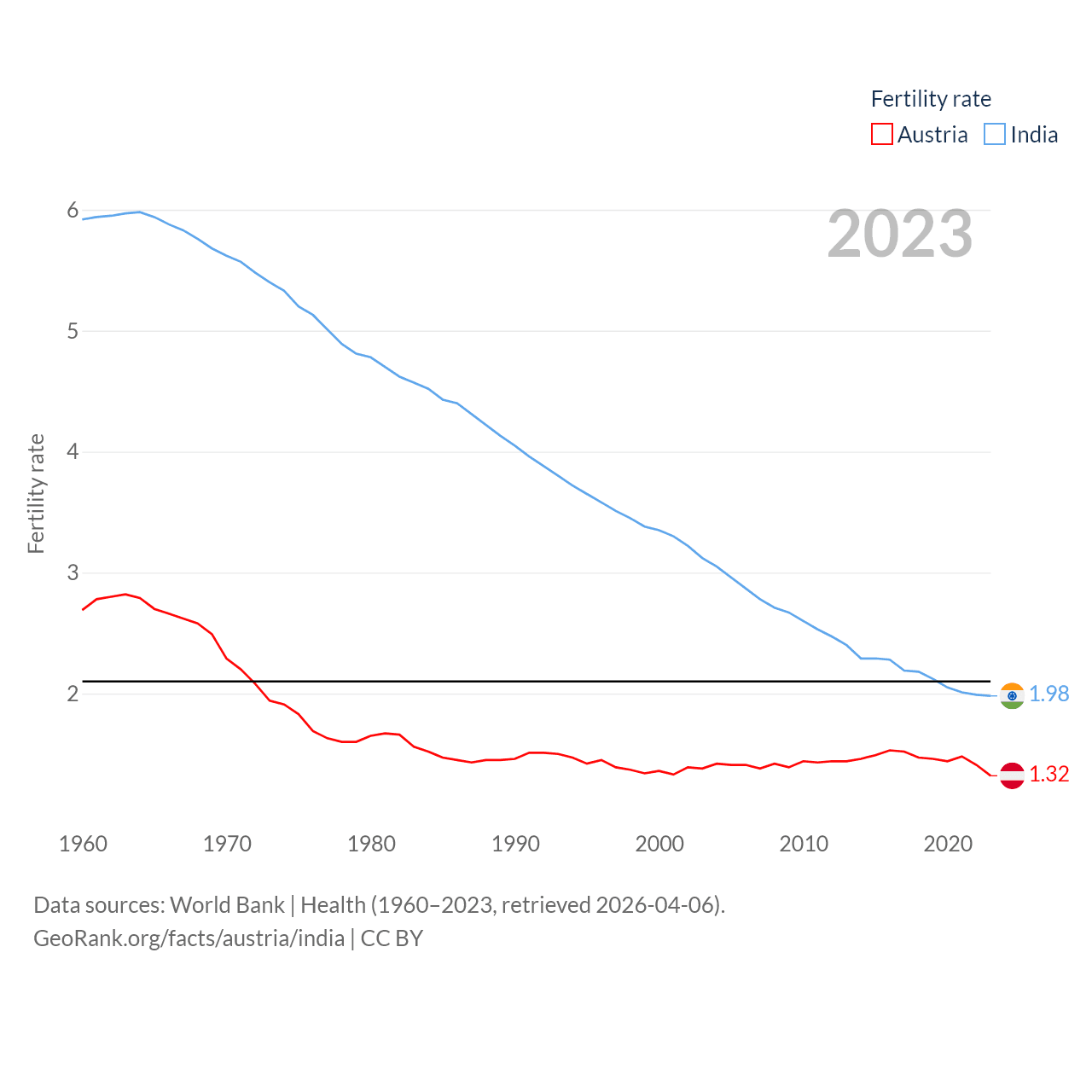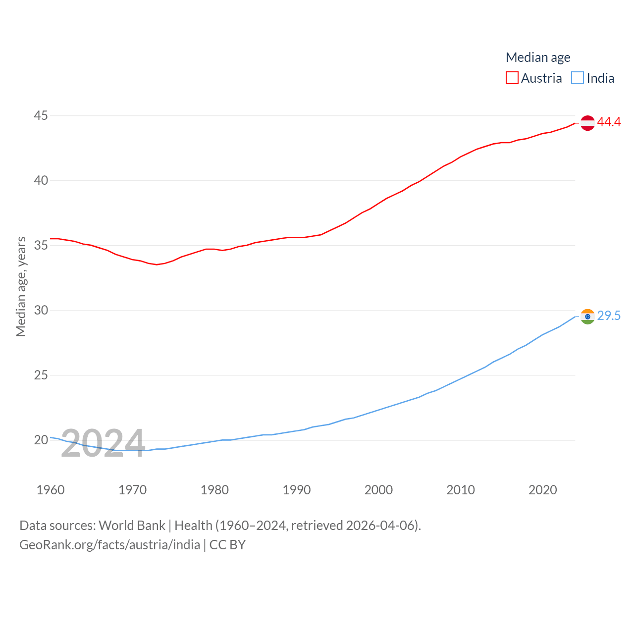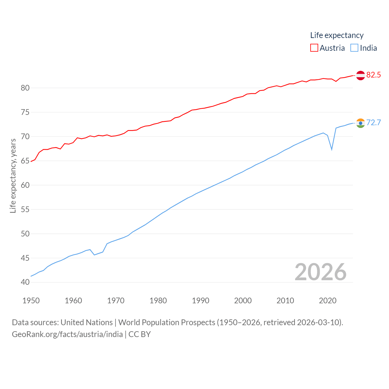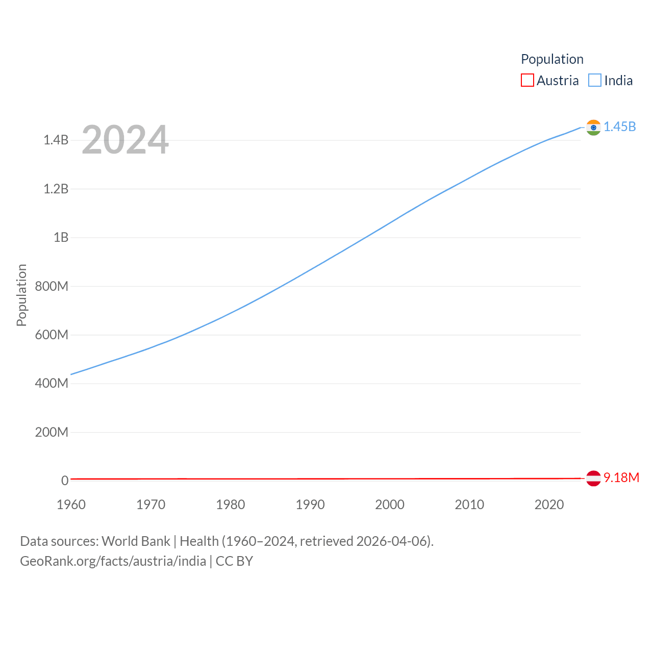 Austria has a population of 9.18M (ranked 99/197), compared with 1.45B in India (ranked 1/197). Austria's land area is 31,861 sq mi versus 1,147,955 sq mi for India (ranked 113th vs. 7th).
